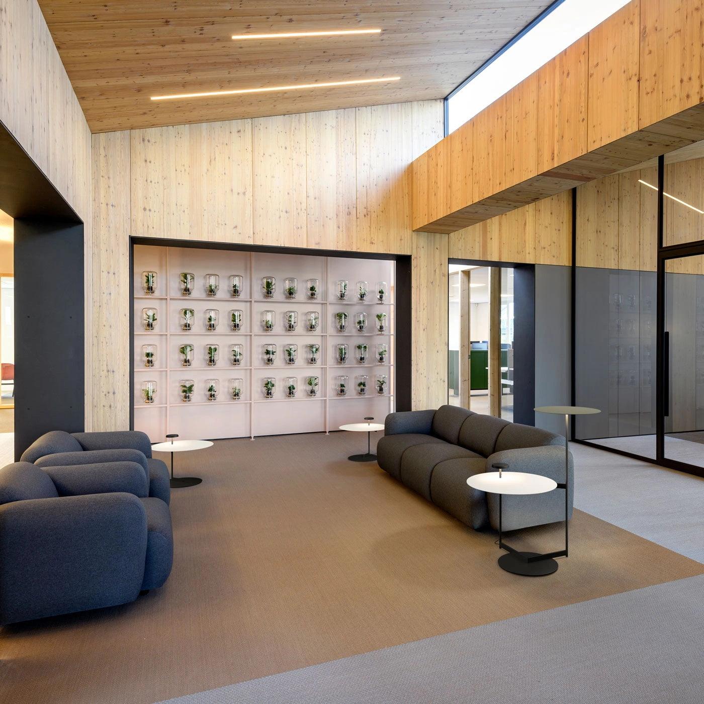 The Flat floor lamp with either a simple or double metal pan, a compact disc, or a plate that acts as an auxiliary piece of furniture. When arranged in pairs the smaller matching disc captures the reflected light within the larger pan thus creating a focus of softer grouped lighting that lights both space as well as the light’s own surfaces.