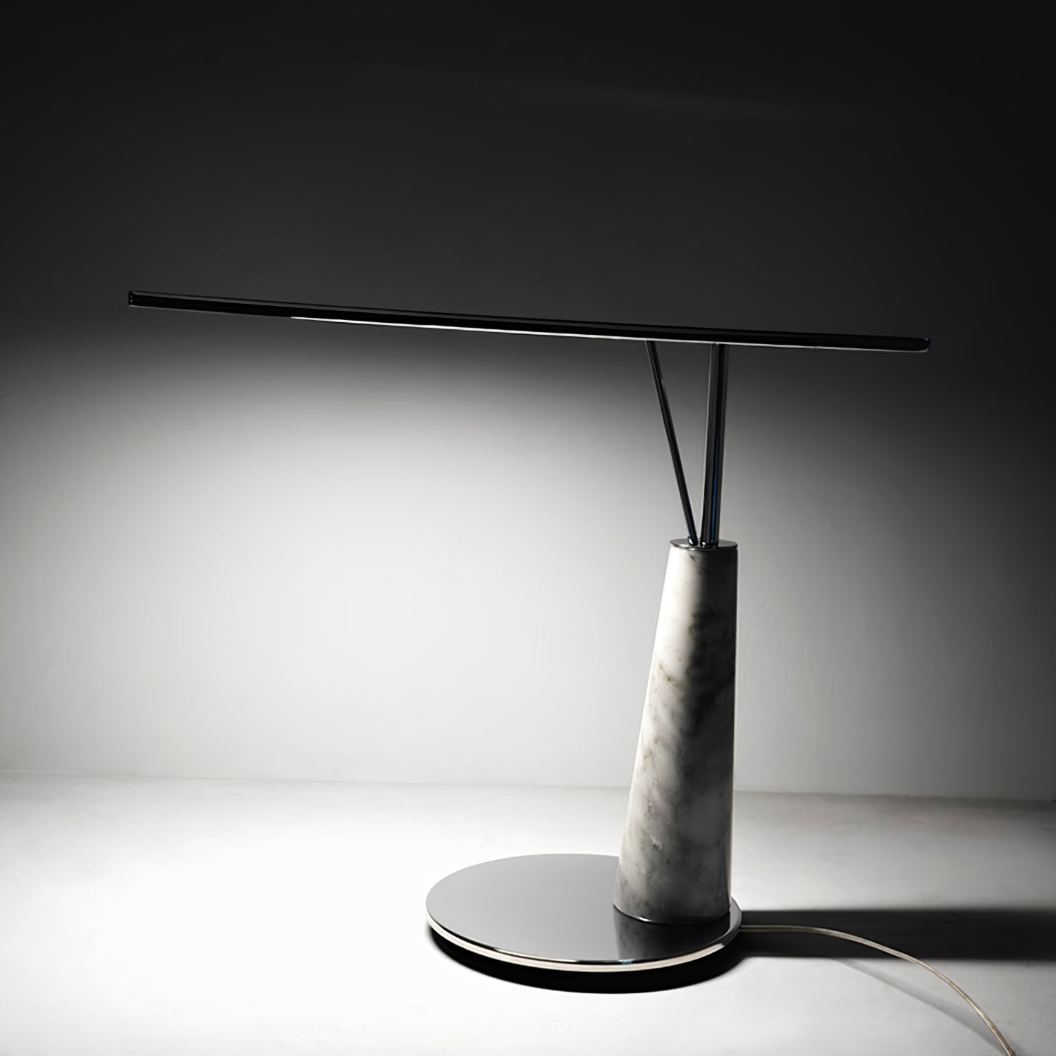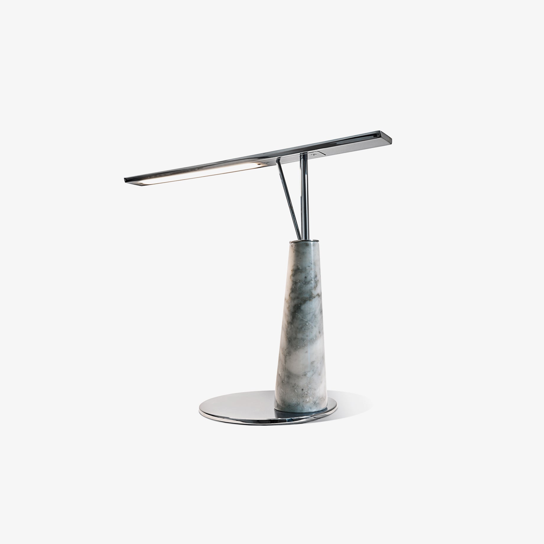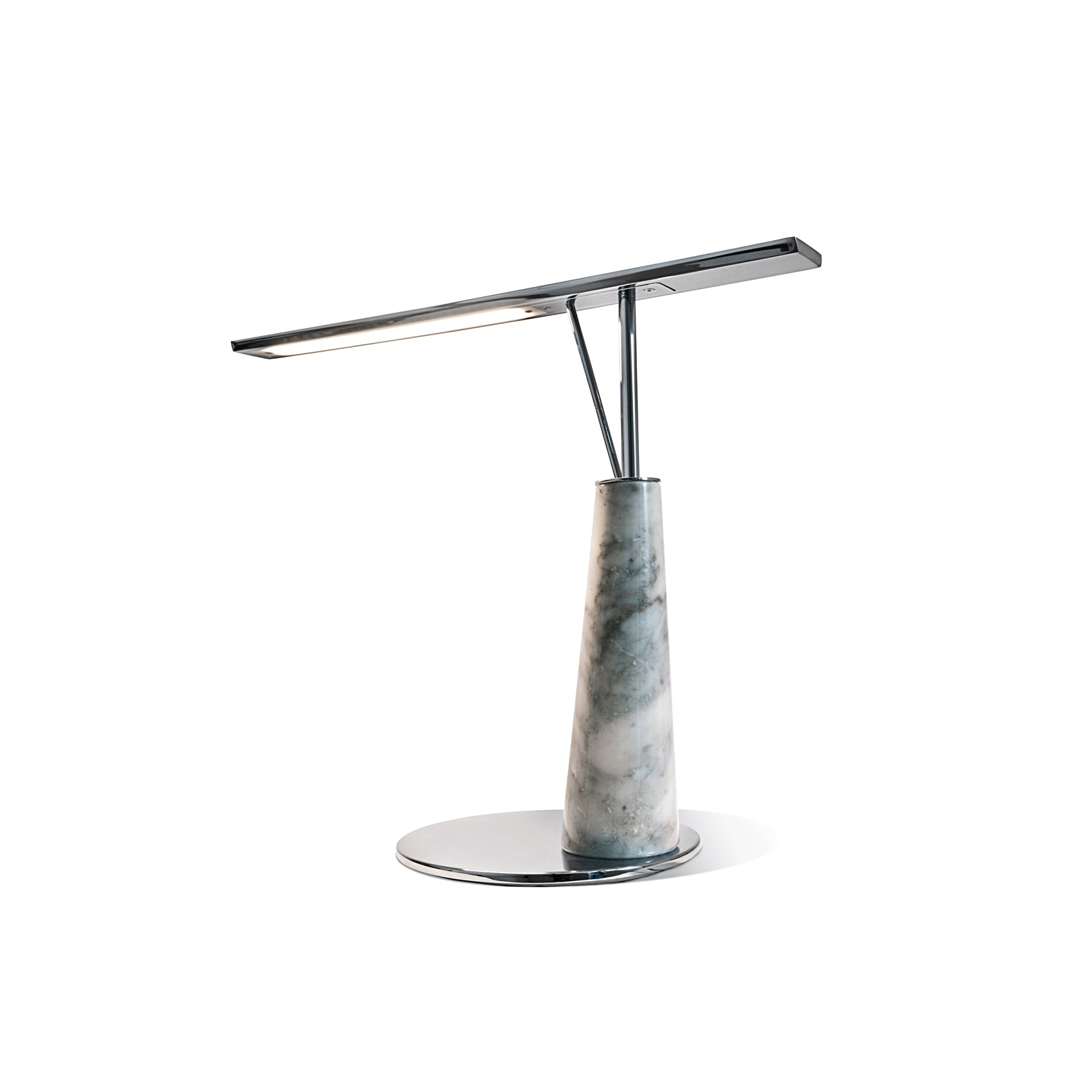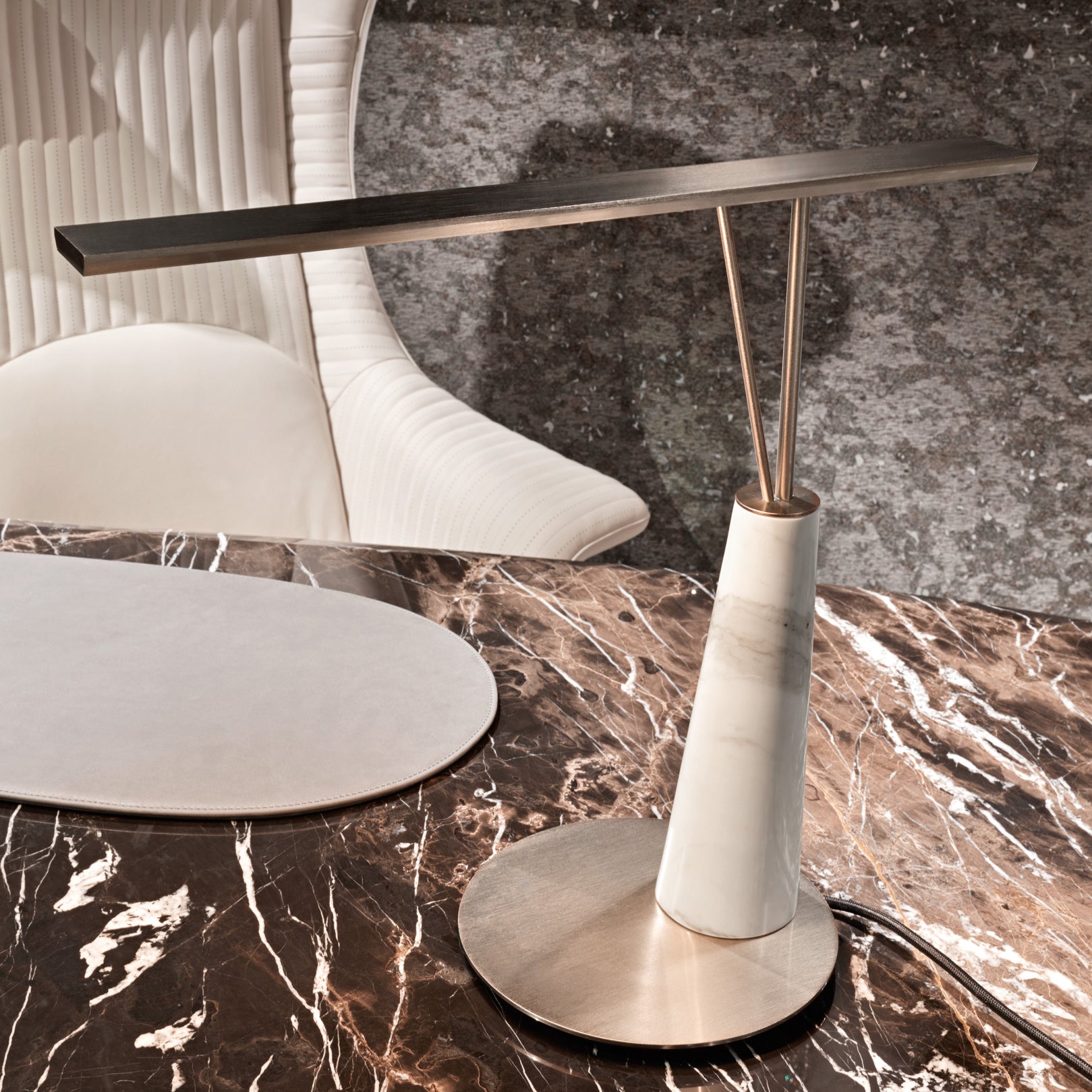 Jasper modern table lamp shown in White marble with base in satinized steel. Light source surges through two metal tubes and a solid marble element. This luxury modern collection combines uniqueness with modern style.