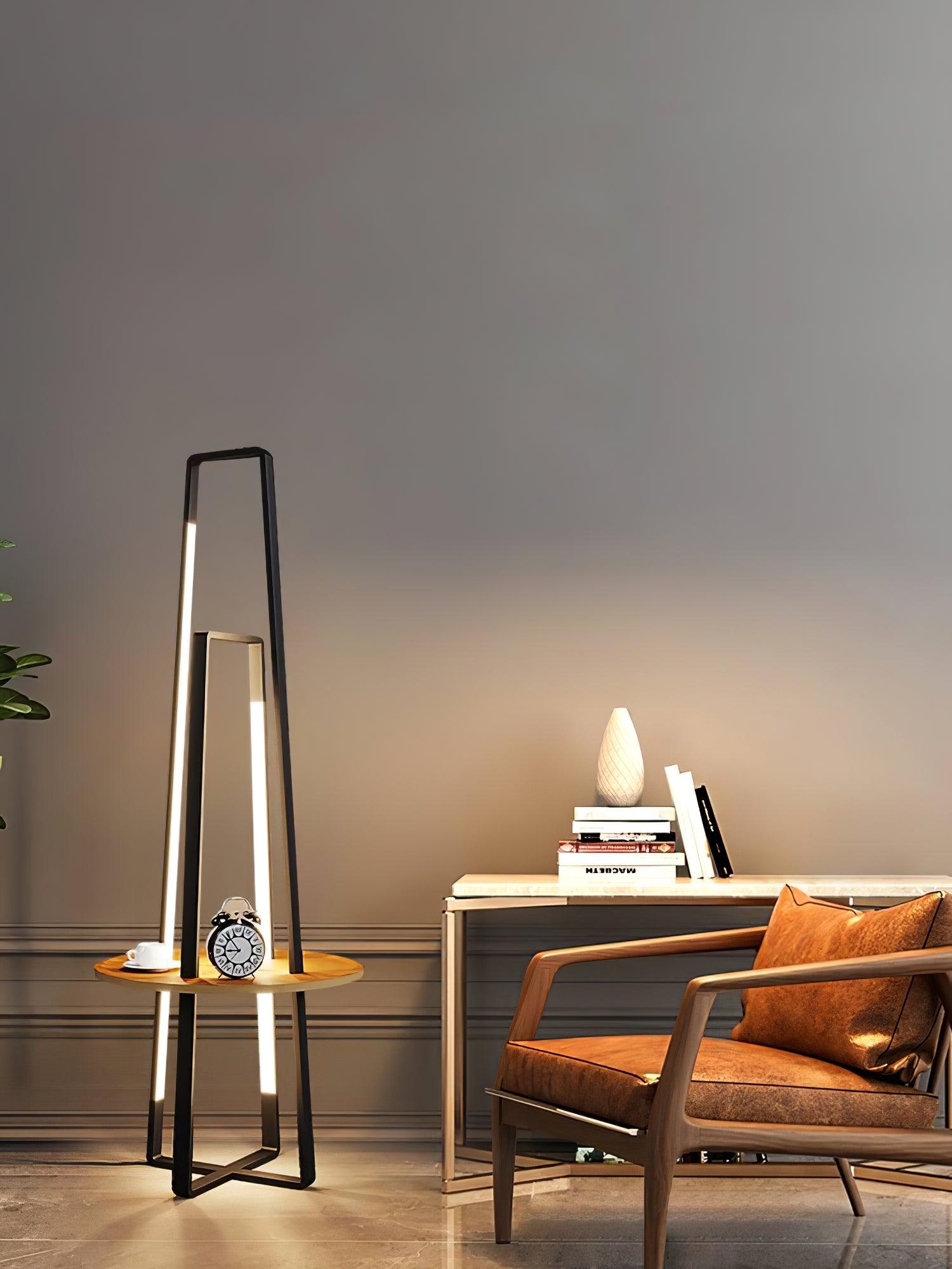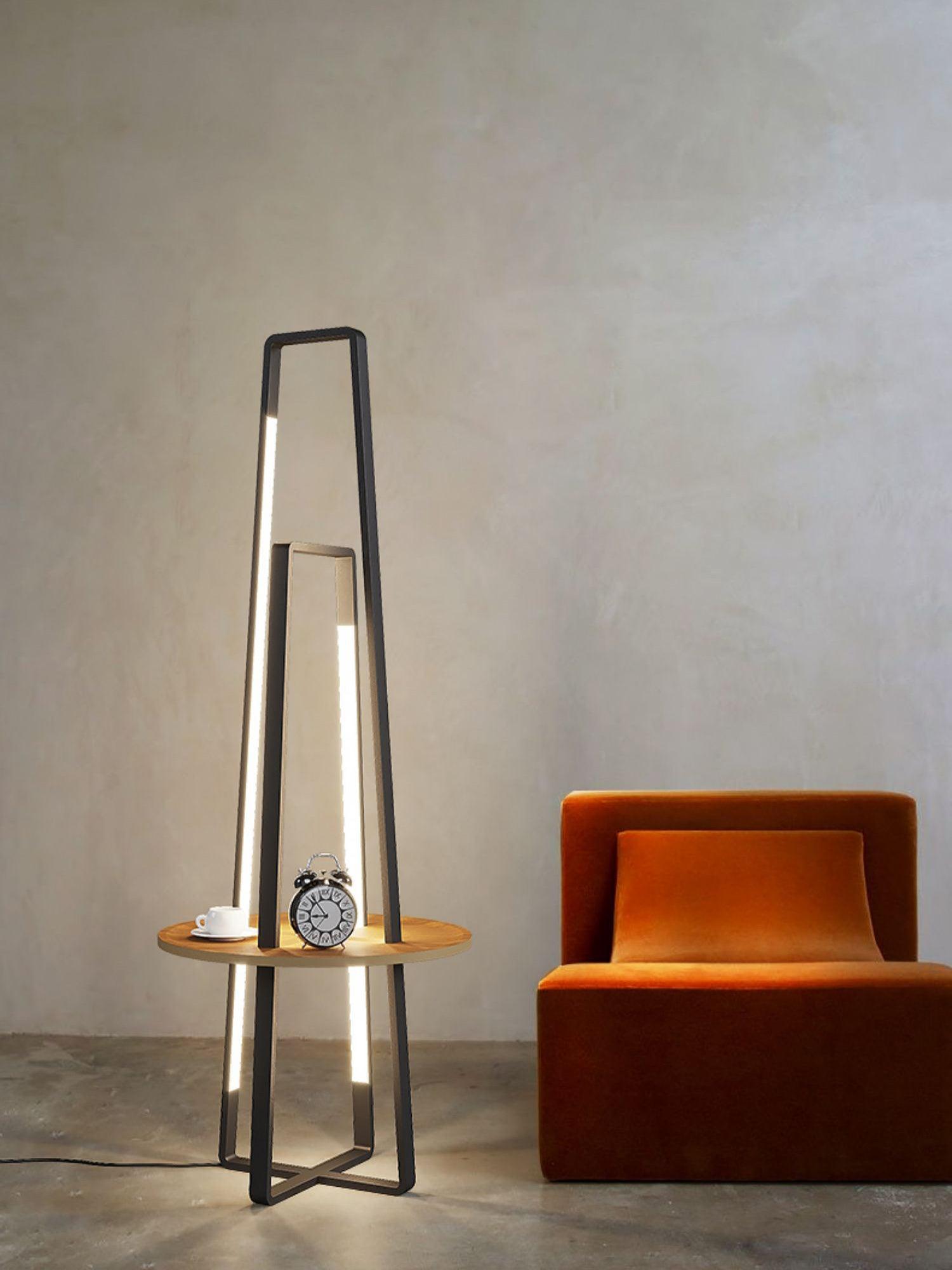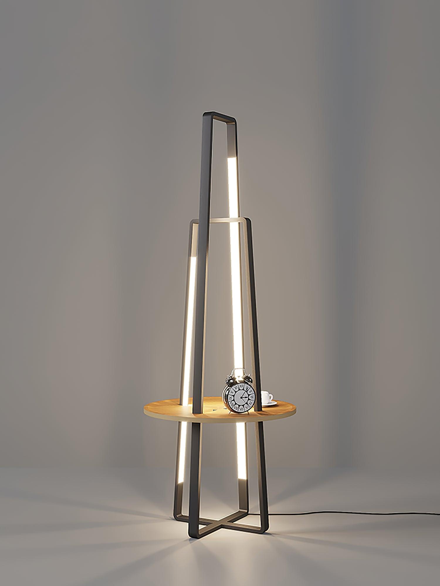 A unique sculptural work of art that functions as a floor lamp, this piece is skillfully designed and crafted. Inspired by the image of a tower bell, an architectural piece that has the power of gathering people together, this exquisite lamp boasts a striking structure made of iron, enclosing one pyramidal shade, and enriched with a circular tray that may function as shelf for books that can be read together with the beloved ones, enlightened by one source of light.
