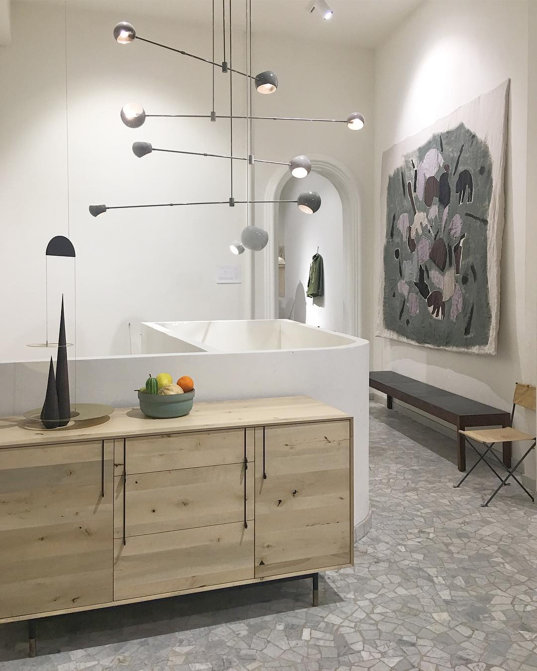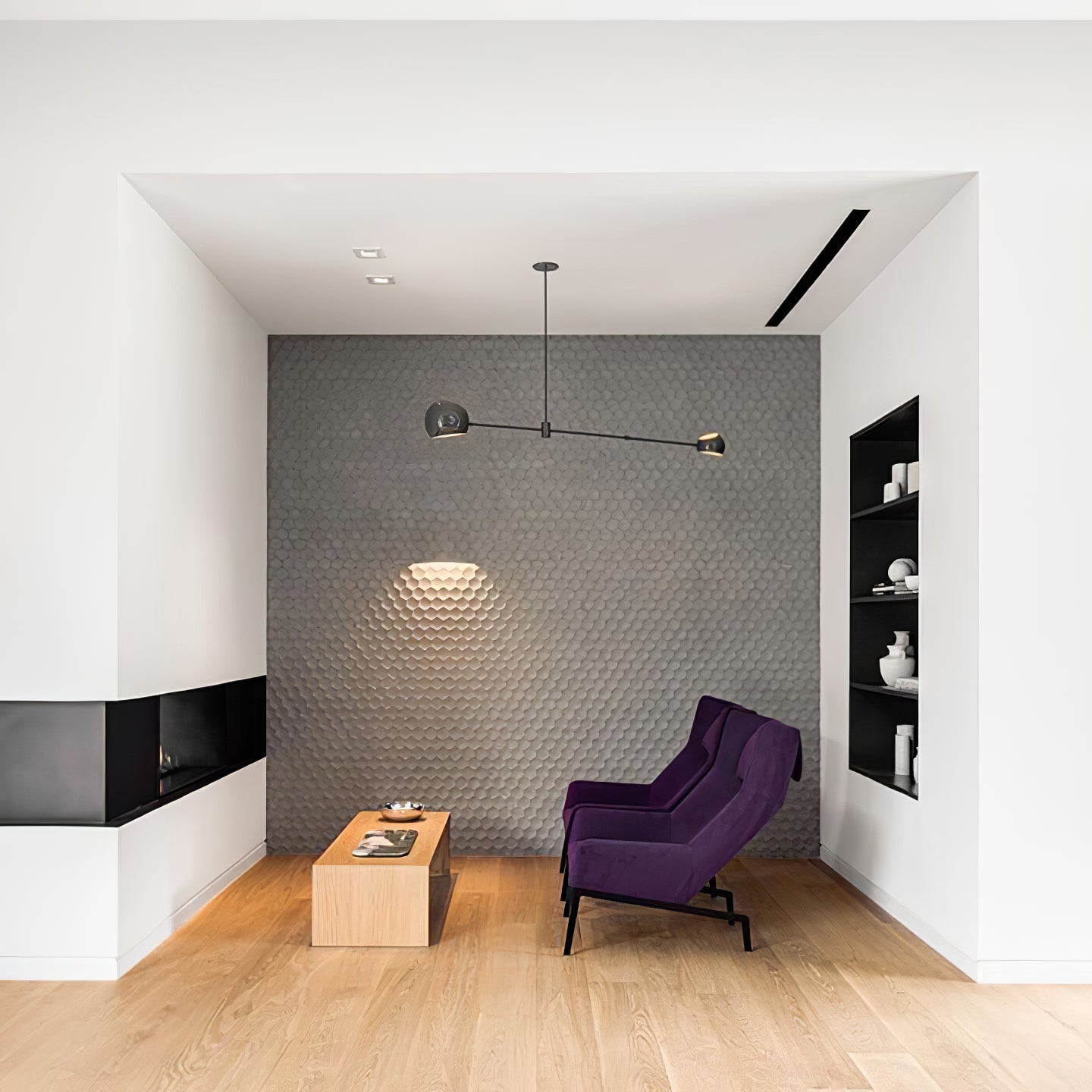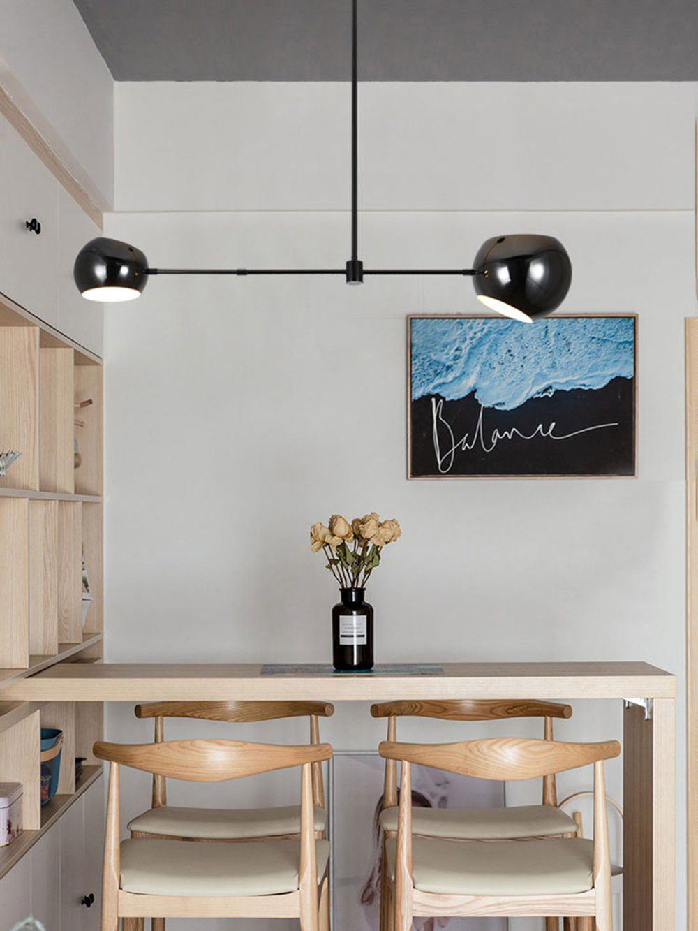 Acaba 由兩個不同尺寸的 Boi 燈罩組成,安裝在一根鋼桿的兩端。每個遮陽簾都由偏心配重懸掛,可旋轉 320 度,頂部和底部都有開口,以獲得最大的光線。這種懸掛夾具在安裝多個時也能很好地工作。