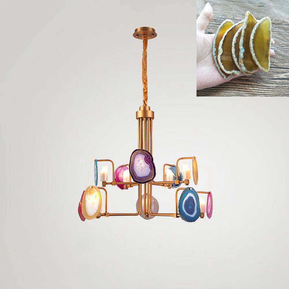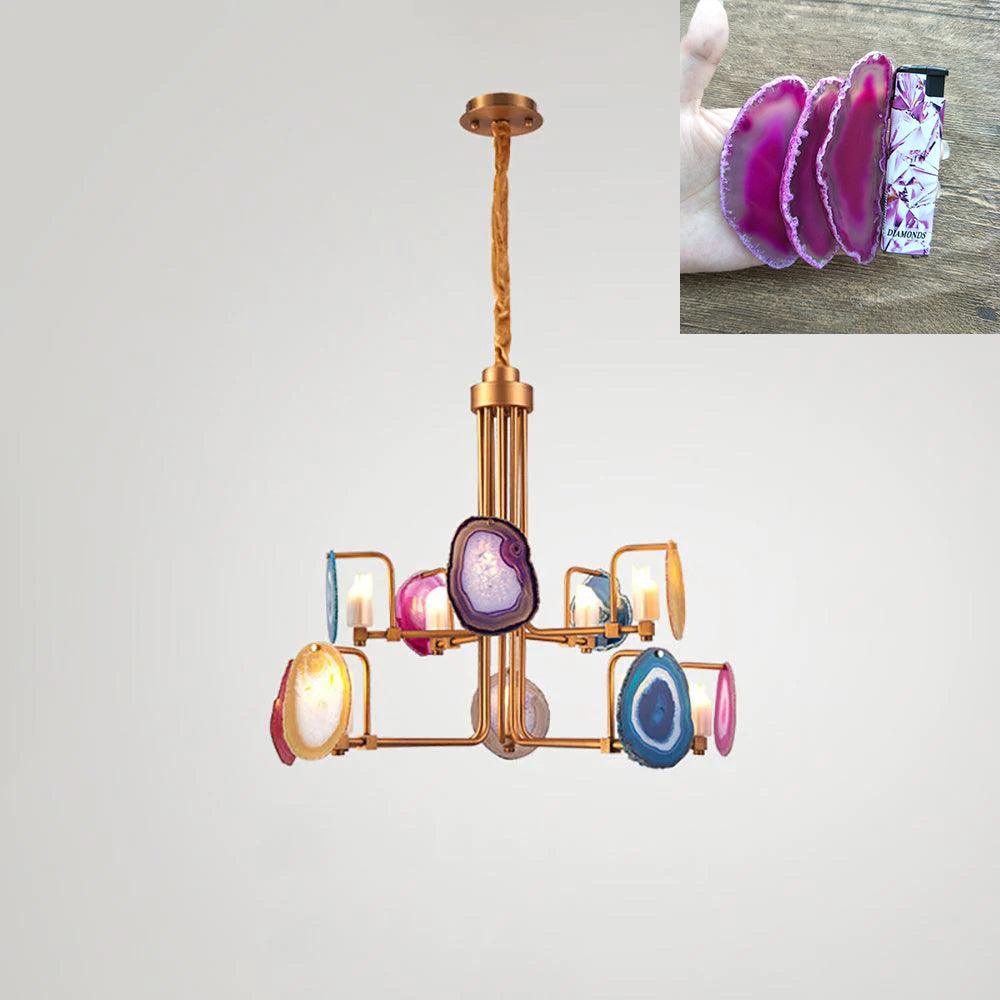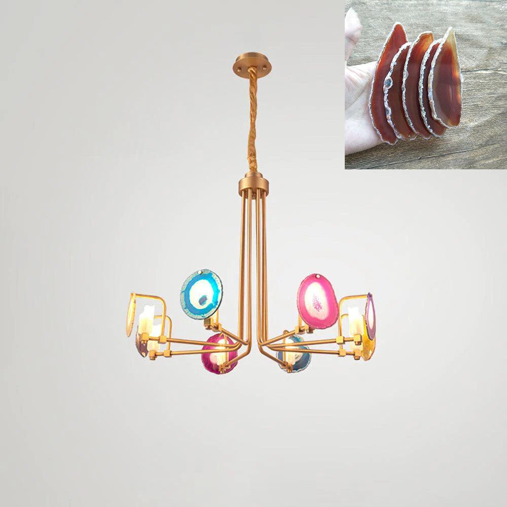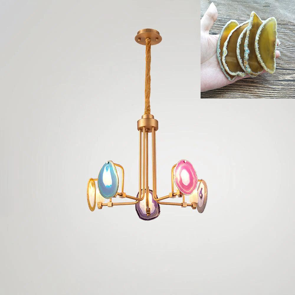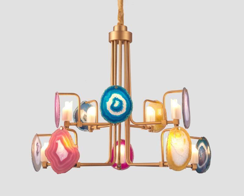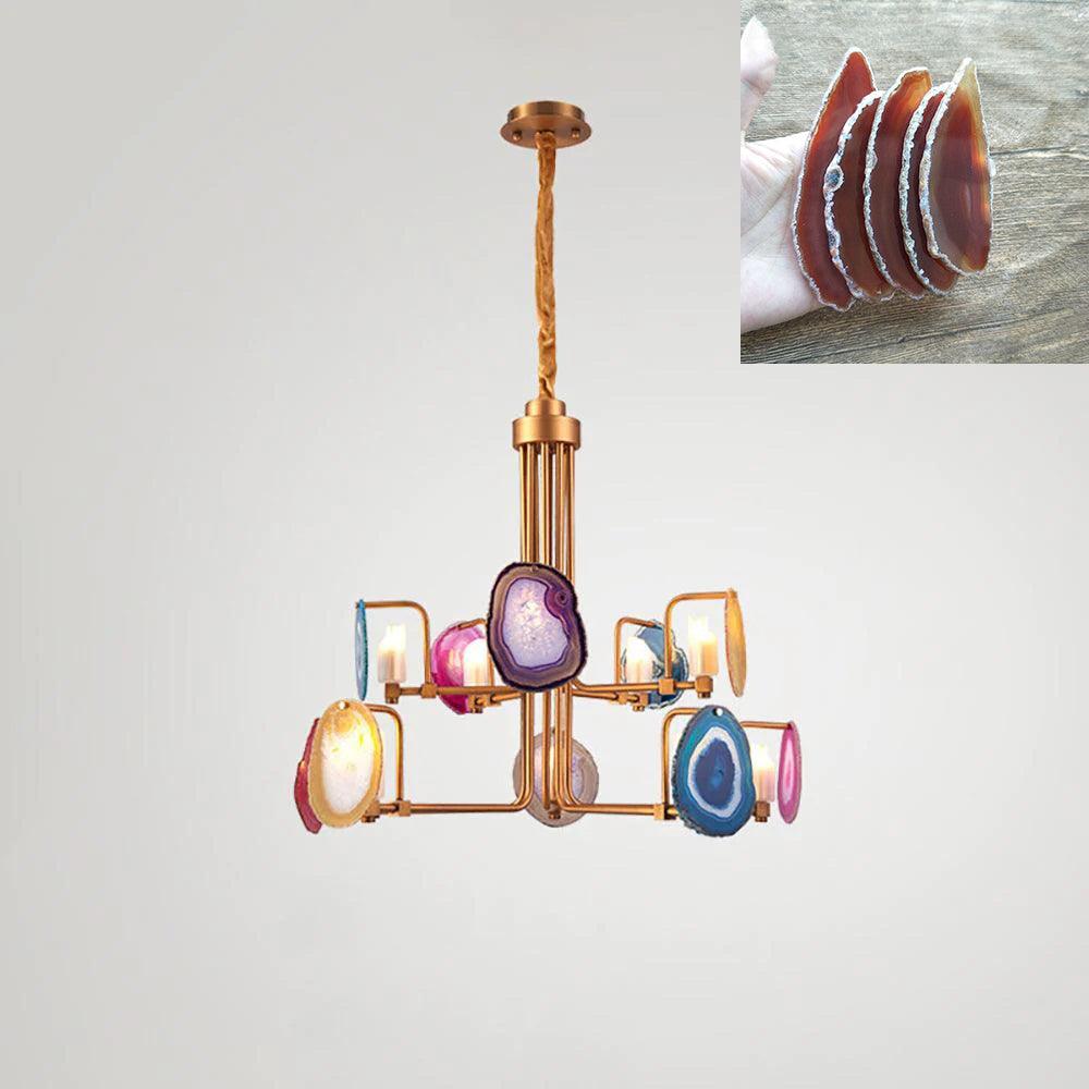 這是一盞豪華的瑪瑙吊燈。天然瑪瑙原石經過切片、打磨、打孔、製作而成。瑪瑙顏色鮮豔,表面光滑。透光性強,無眩光。