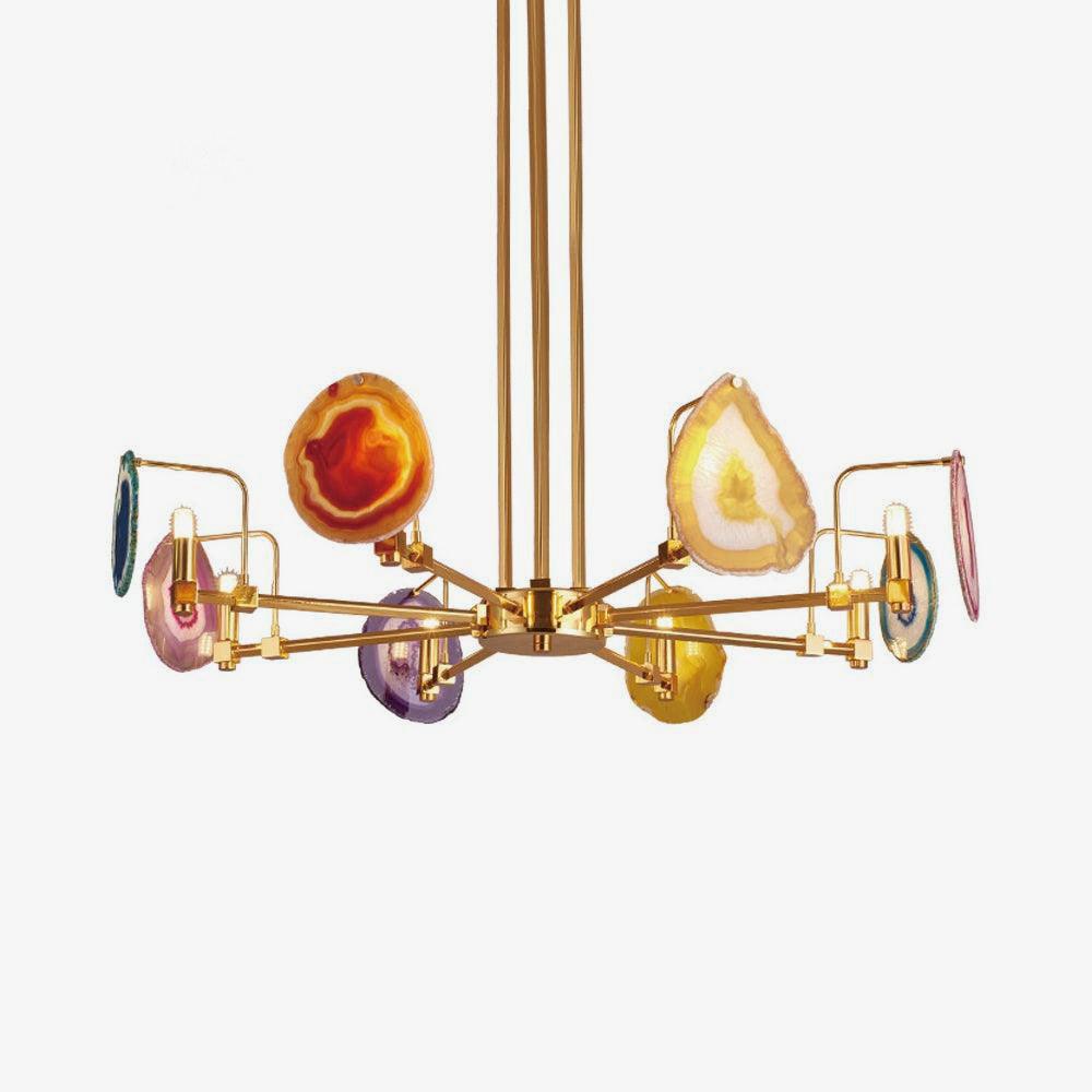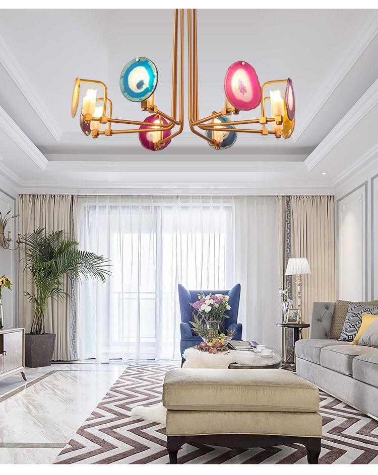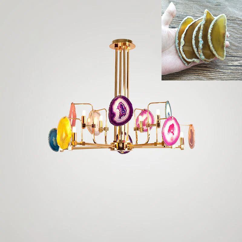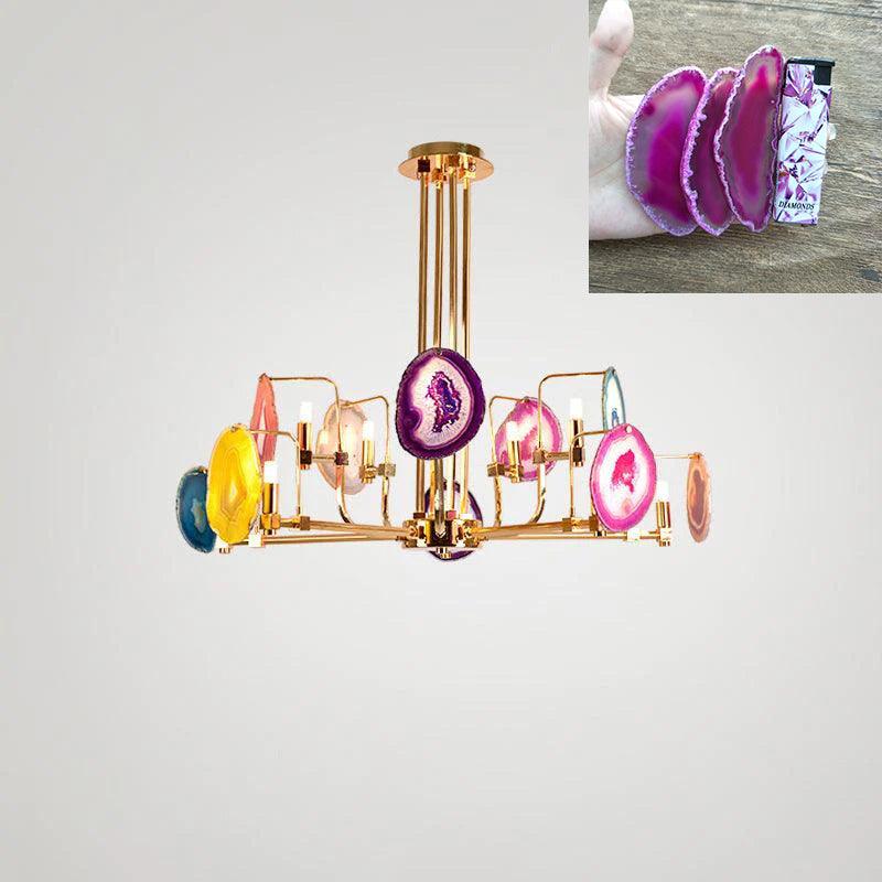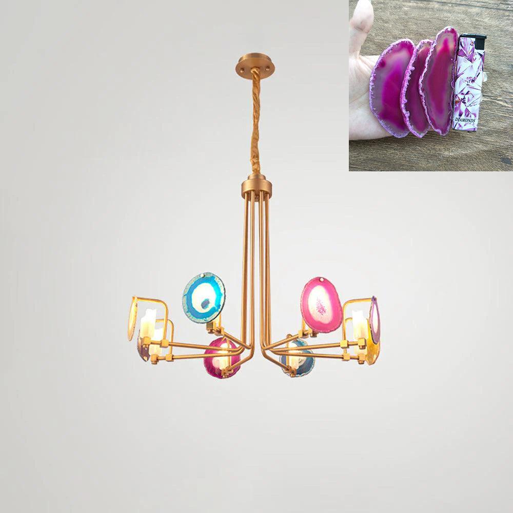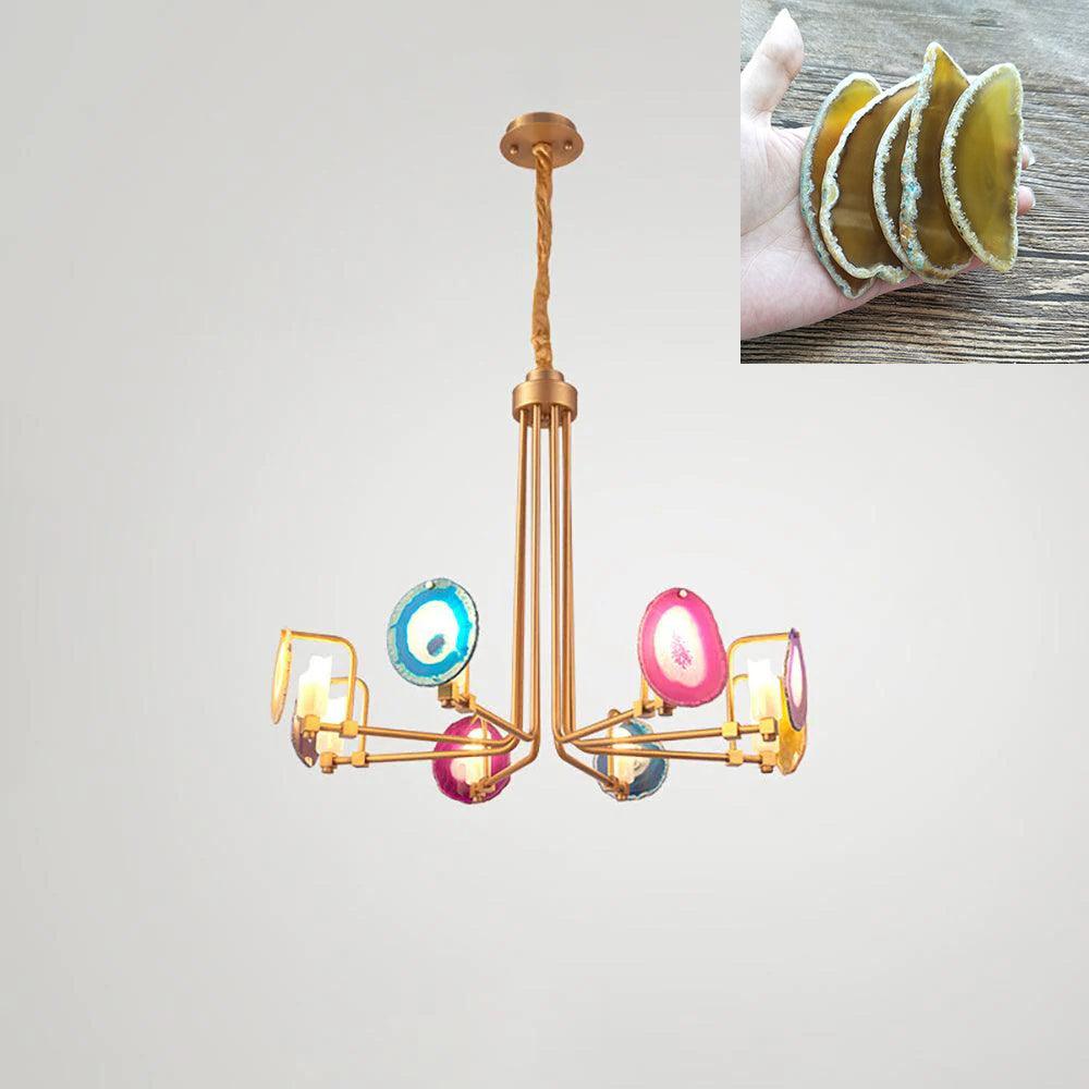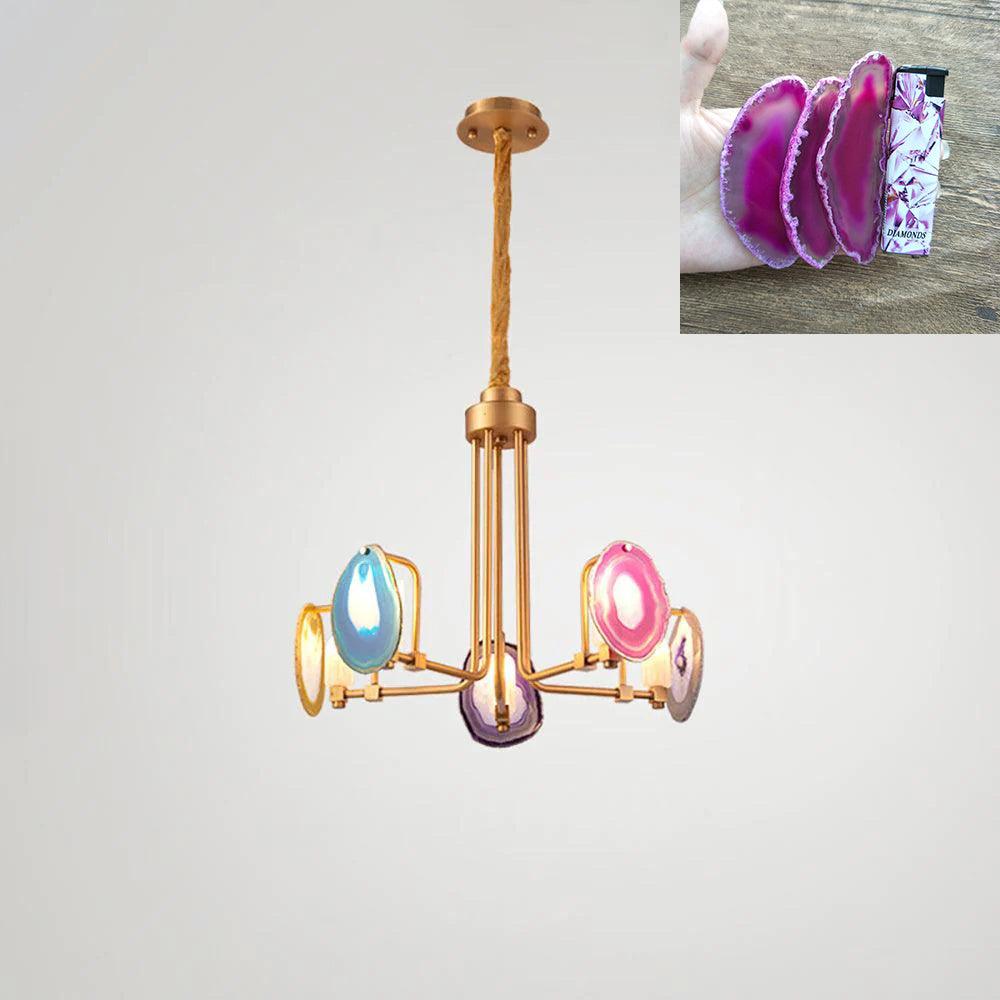 這是一盞豪華的瑪瑙吊燈。天然瑪瑙原石經過切片、打磨、打孔、製作而成。瑪瑙顏色鮮豔,表面光滑。透光性強,無眩光。