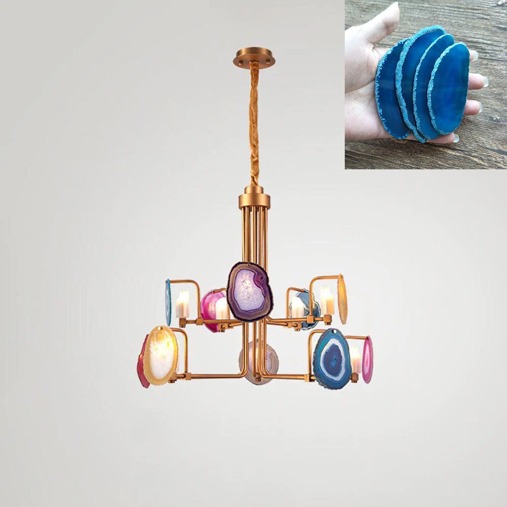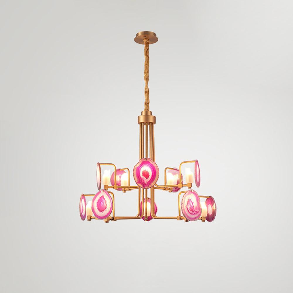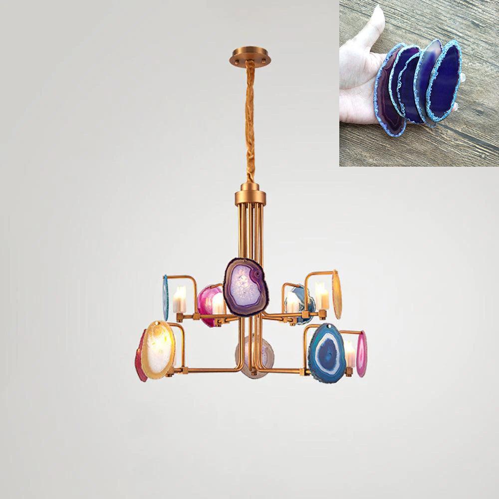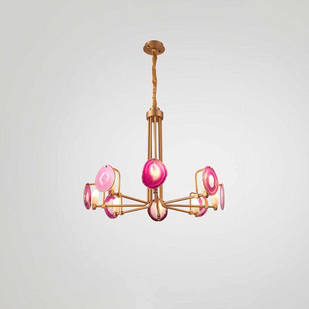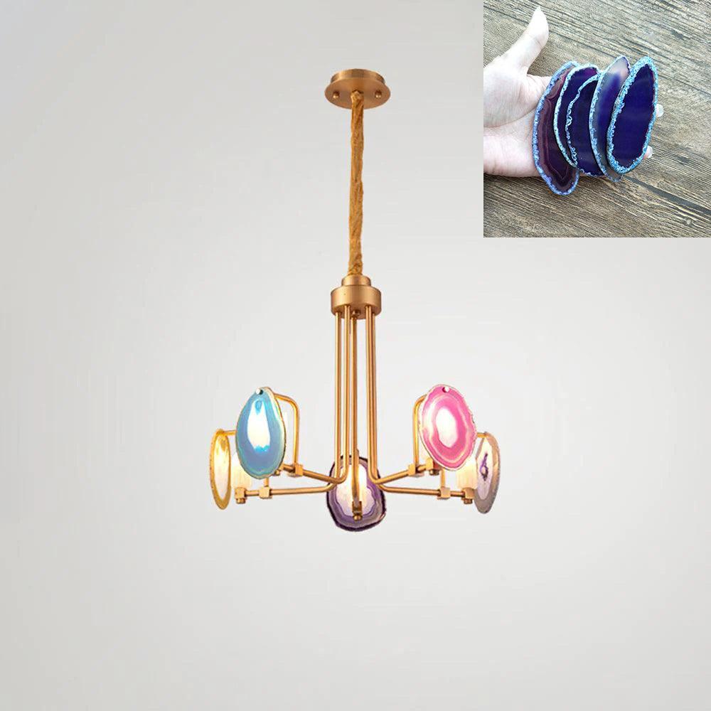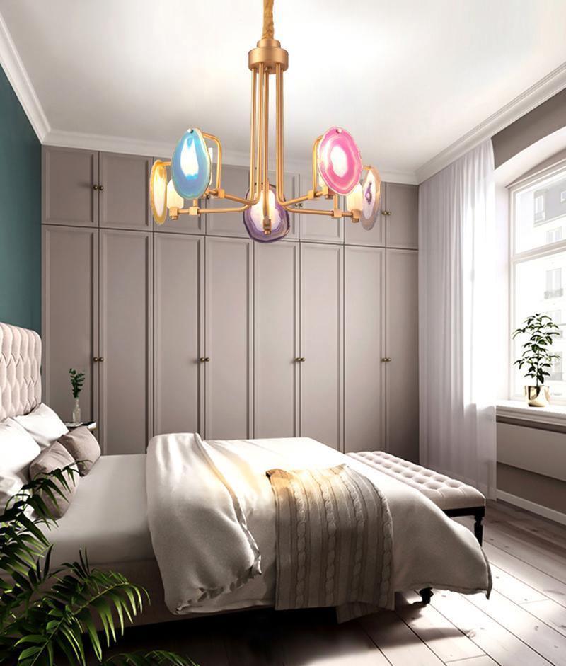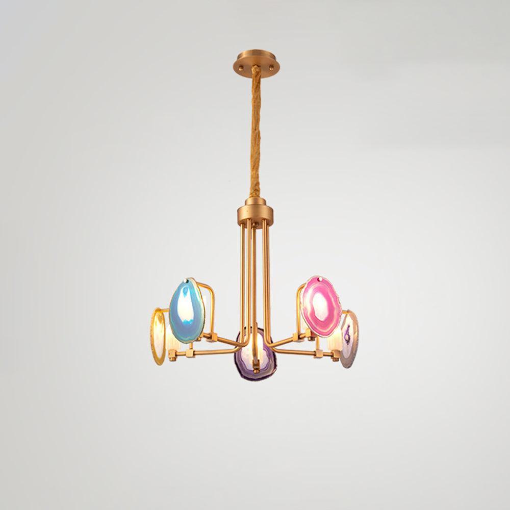 這是一盞豪華的瑪瑙吊燈。天然瑪瑙原石經過切片、打磨、打孔、製作而成。瑪瑙顏色鮮豔,表面光滑。透光性強,無眩光。