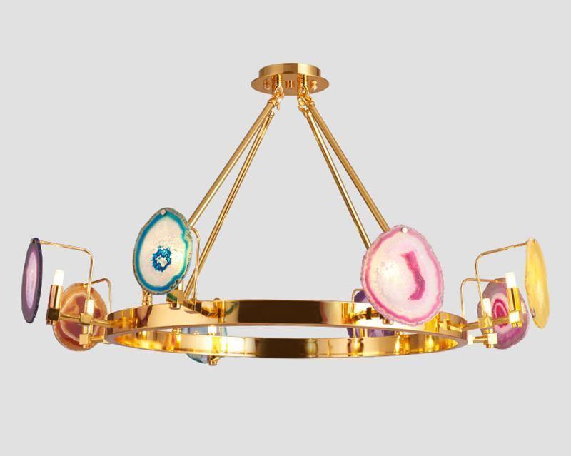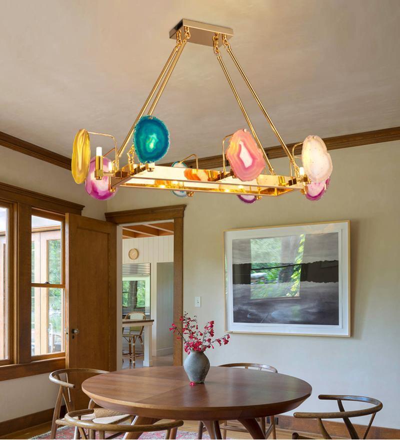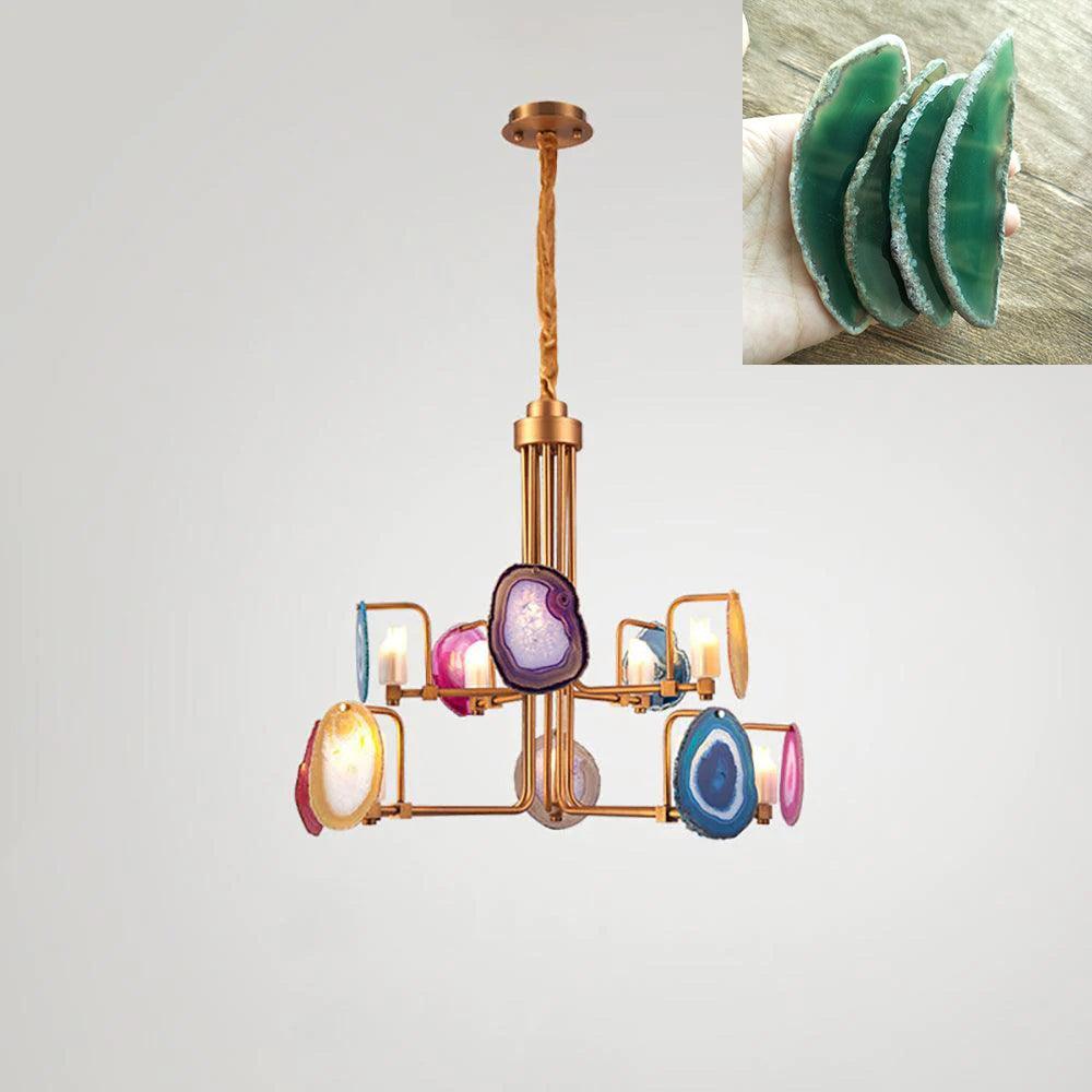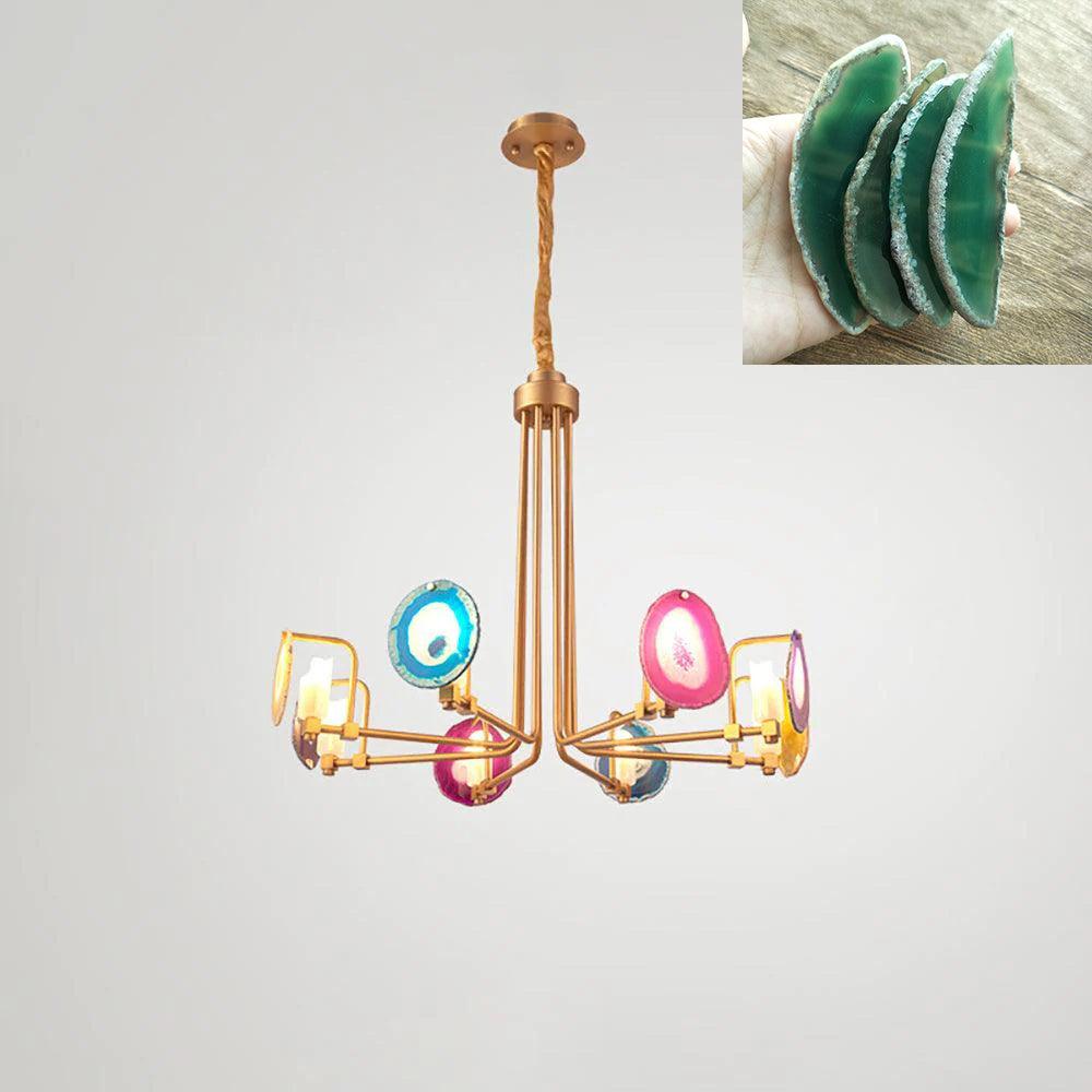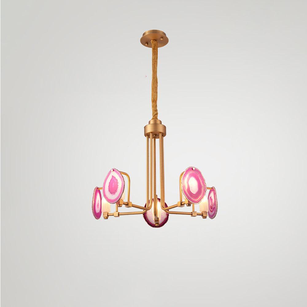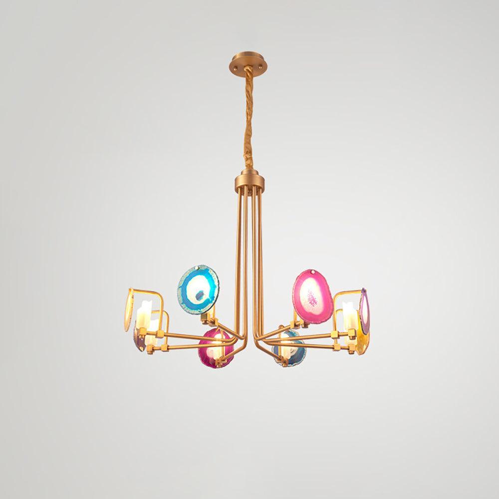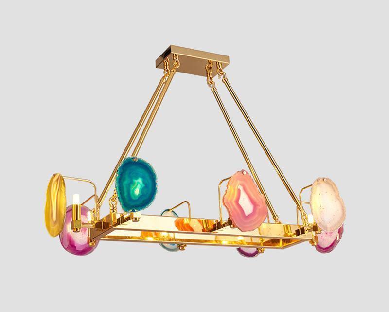 這是一盞豪華的瑪瑙吊燈。天然瑪瑙原石經過切片、打磨、打孔、製作而成。瑪瑙顏色鮮豔,表面光滑。透光性強,無眩光。