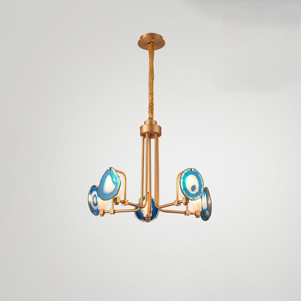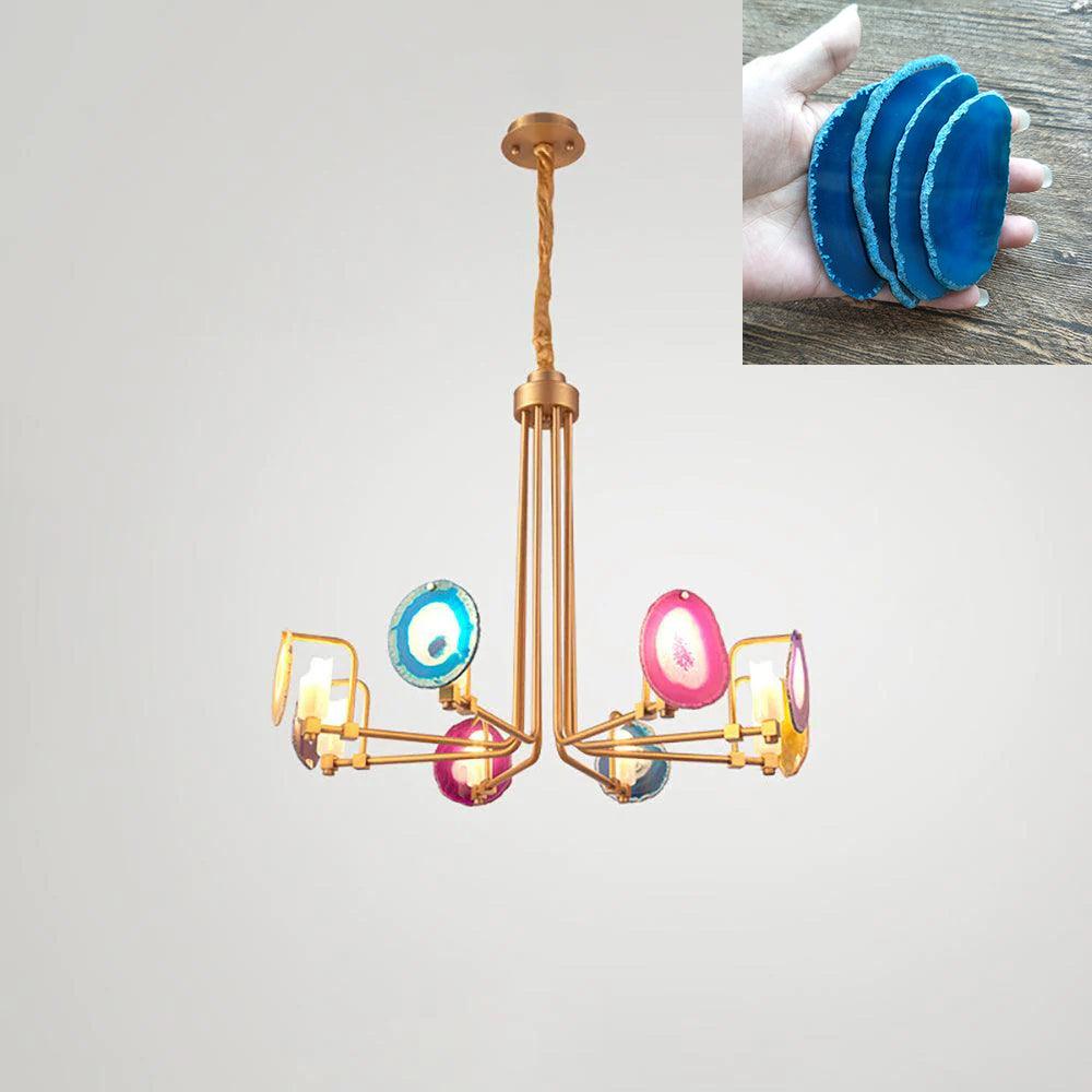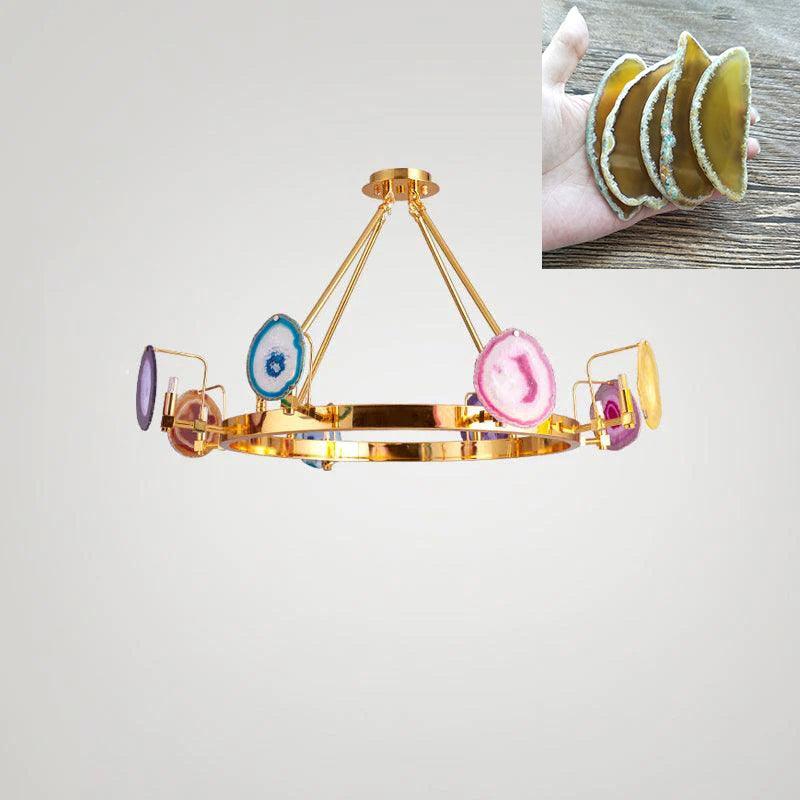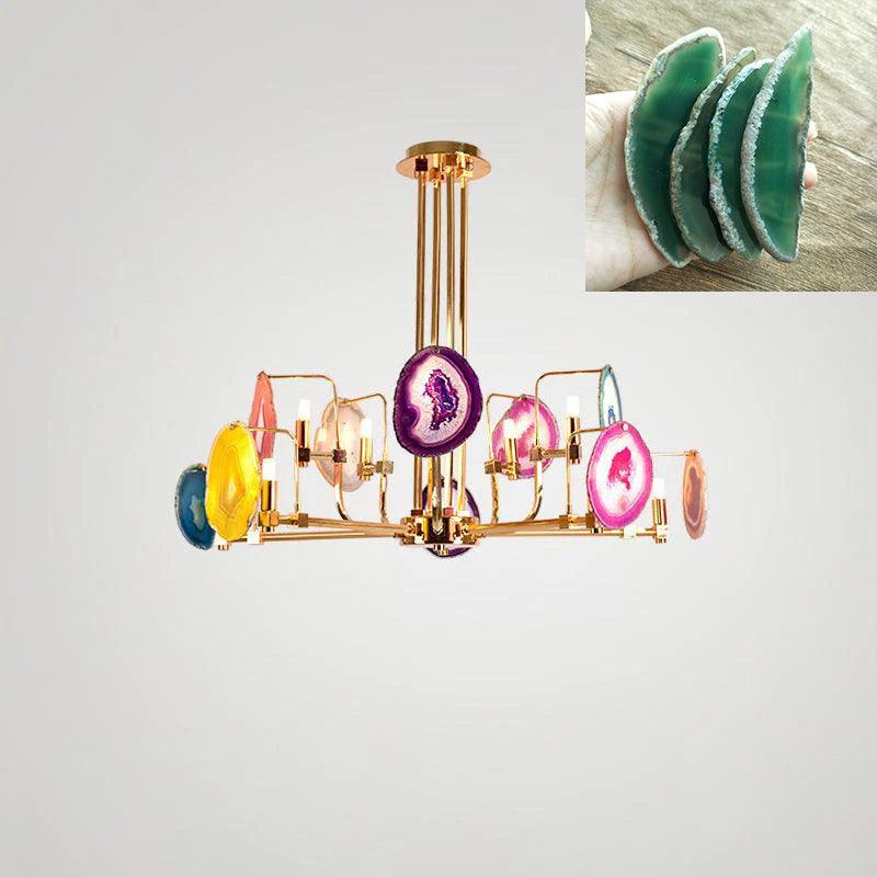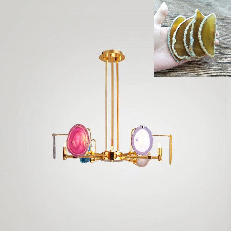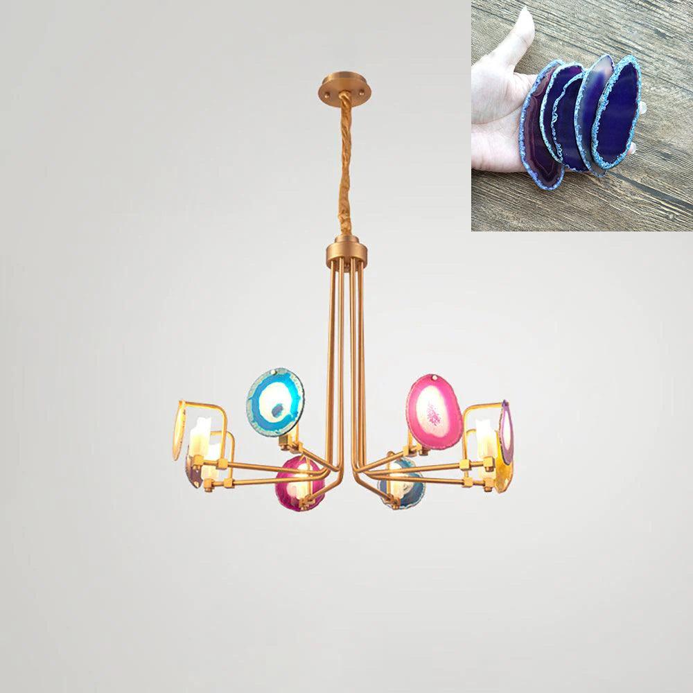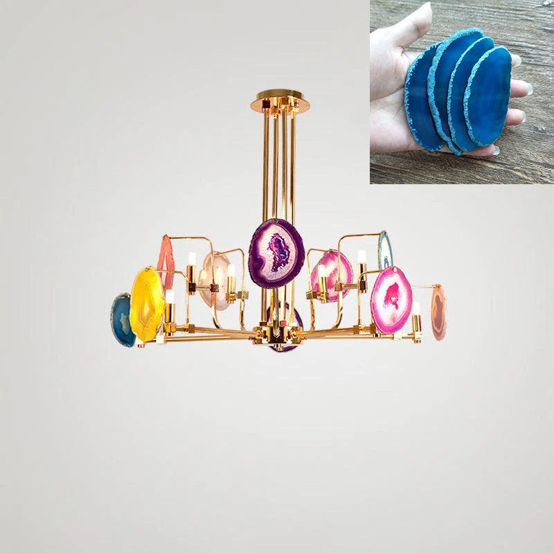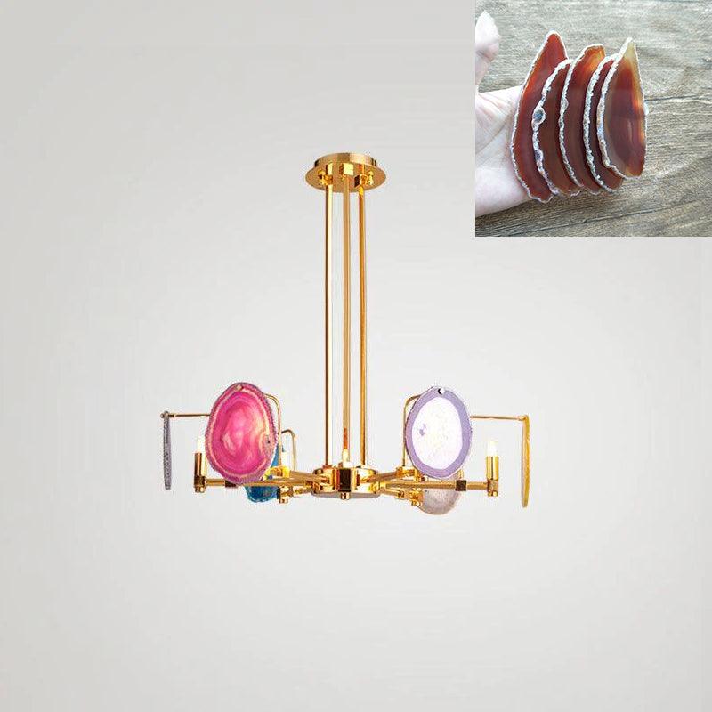 這是一盞豪華的瑪瑙吊燈。天然瑪瑙原石經過切片、打磨、打孔、製作而成。瑪瑙顏色鮮豔,表面光滑。透光性強,無眩光。