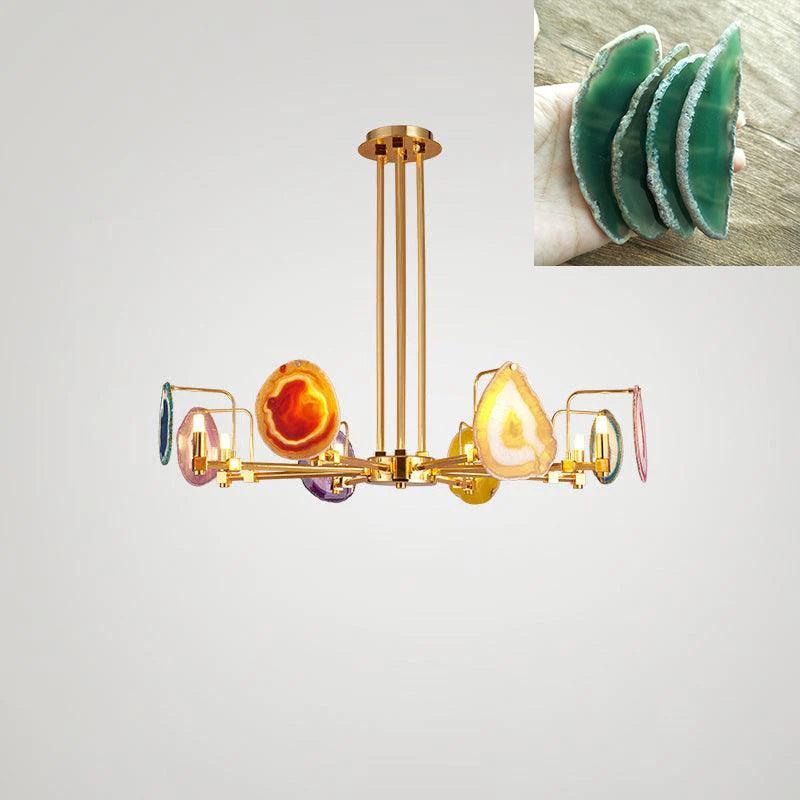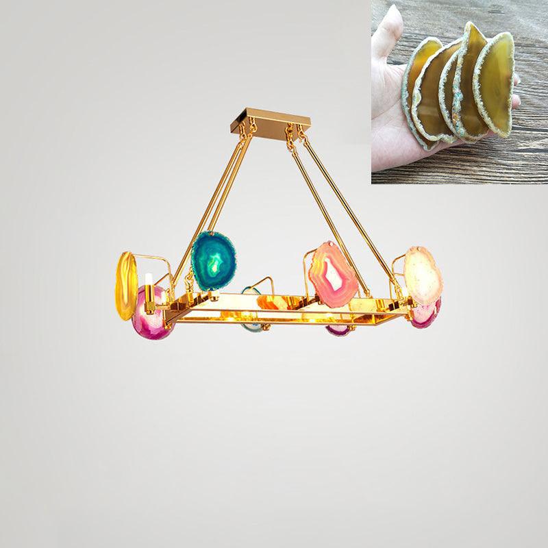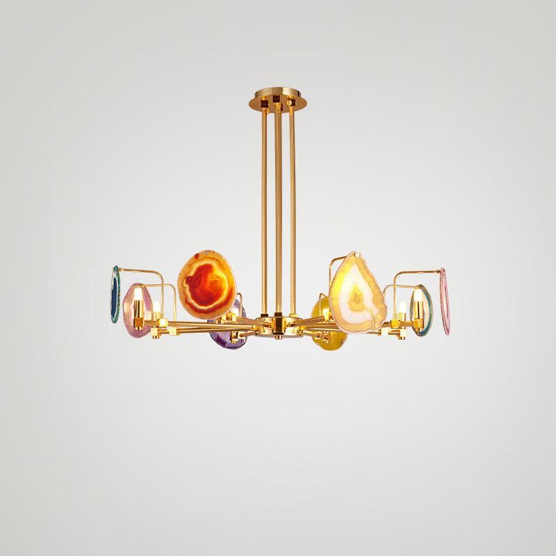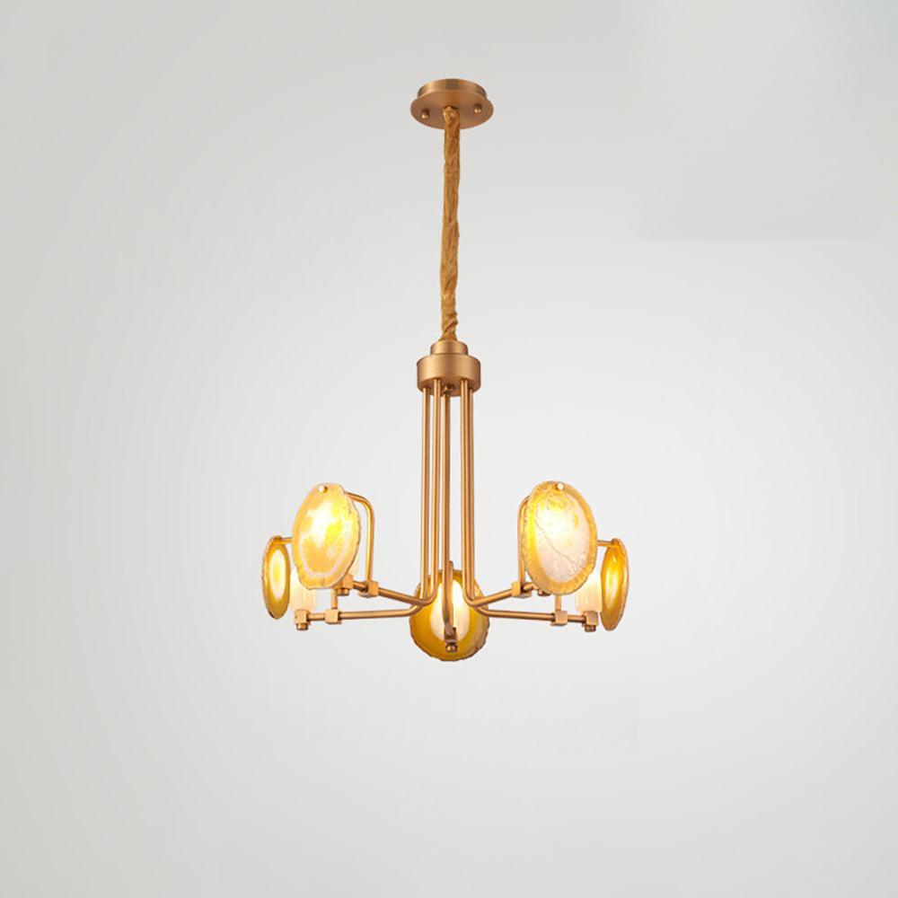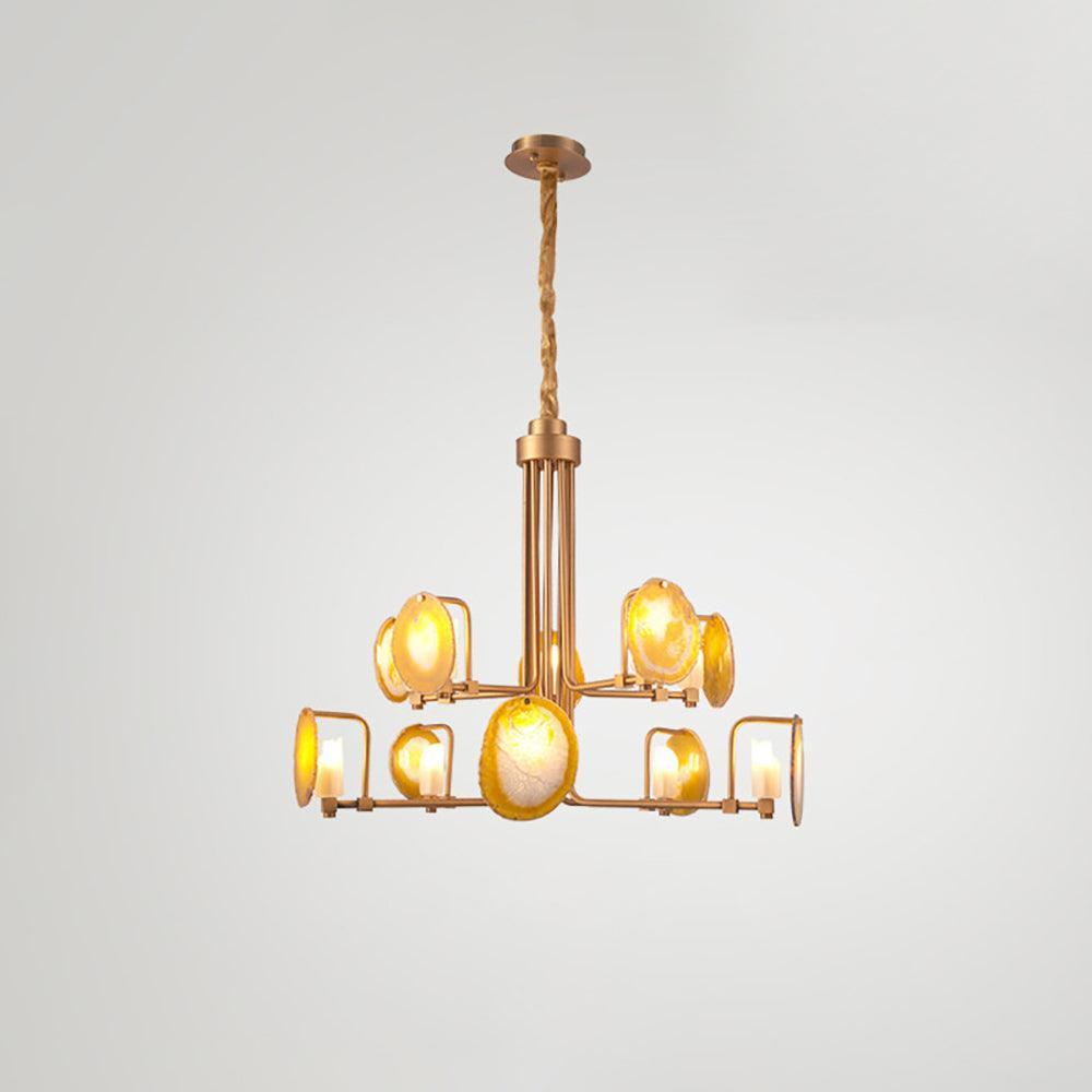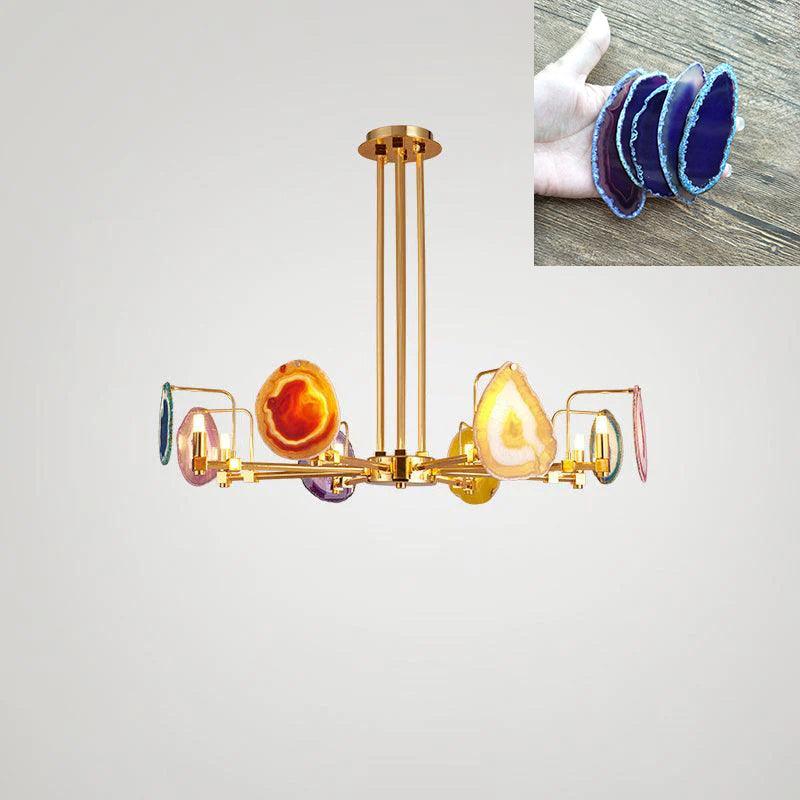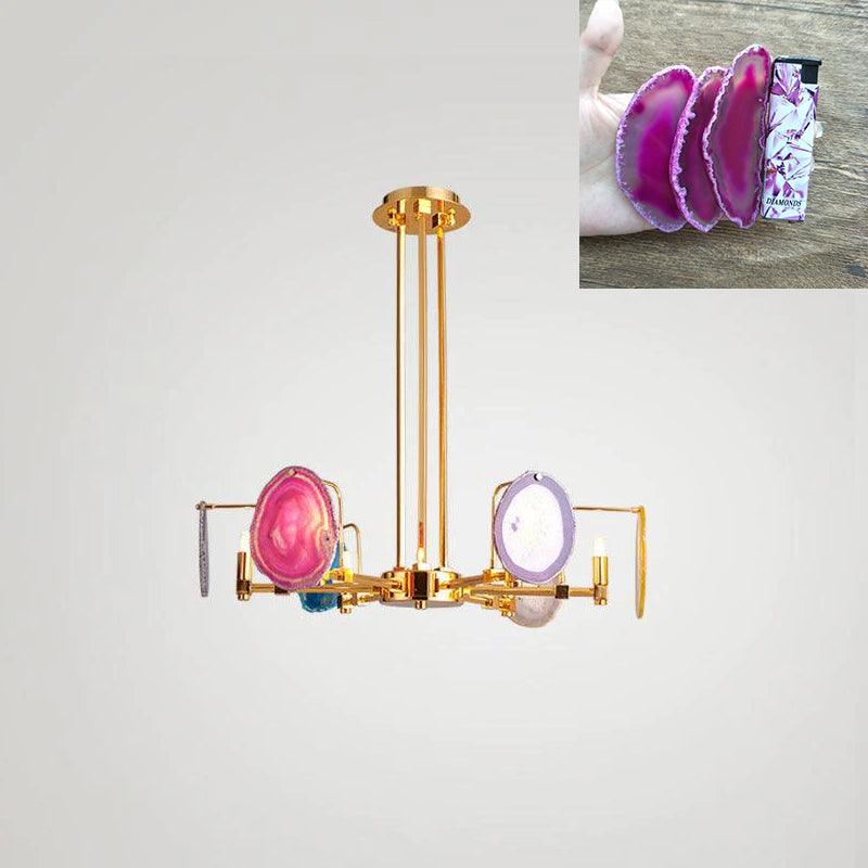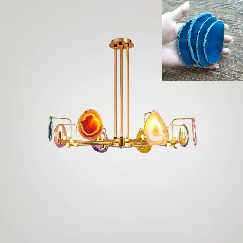 這是一盞豪華的瑪瑙吊燈。天然瑪瑙原石經過切片、打磨、打孔、製作而成。瑪瑙顏色鮮豔,表面光滑。透光性強,無眩光。