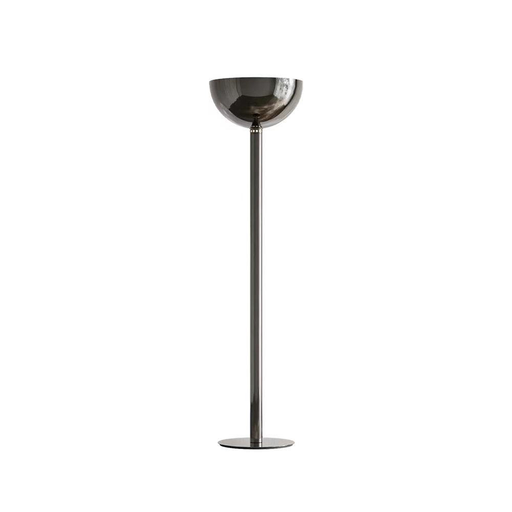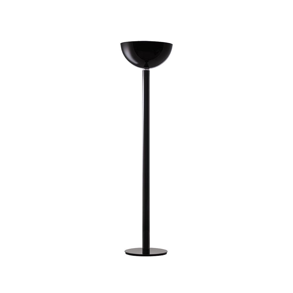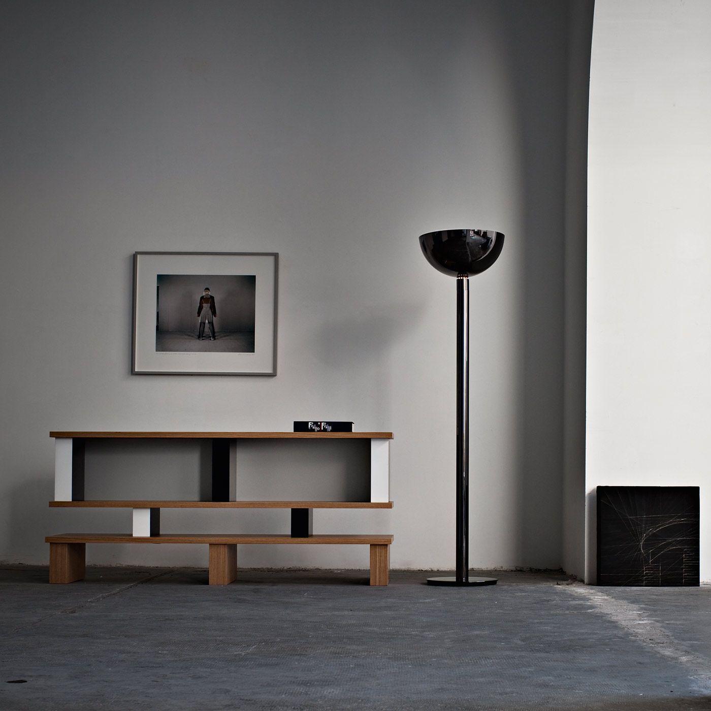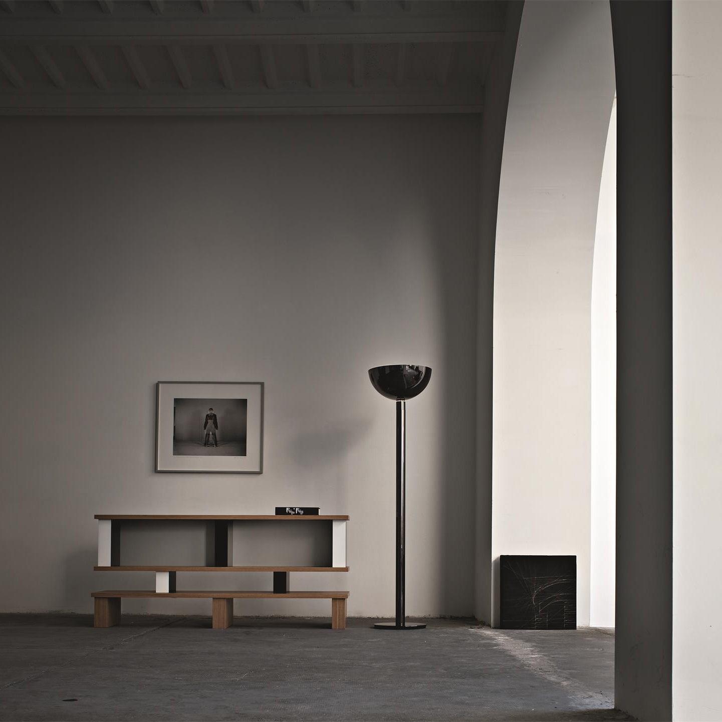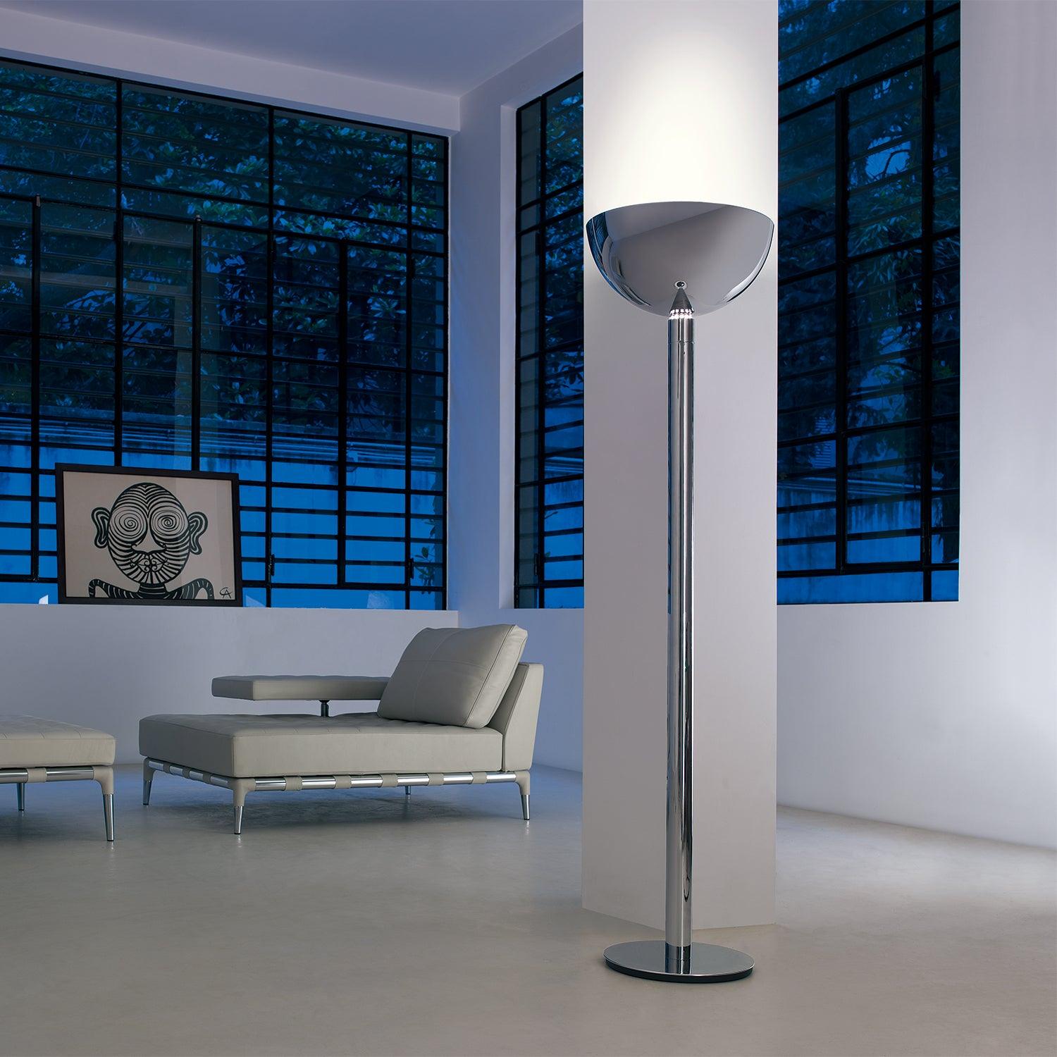 鍍鉻結構落地燈。鍍鉻、黑色或白色金屬擴散器。線性或彎曲燈桿由鍍鉻或鍍黑鉻鋼製成,半圓形燈罩由乳白色玻璃製成。 Uplight泛光光束分佈。