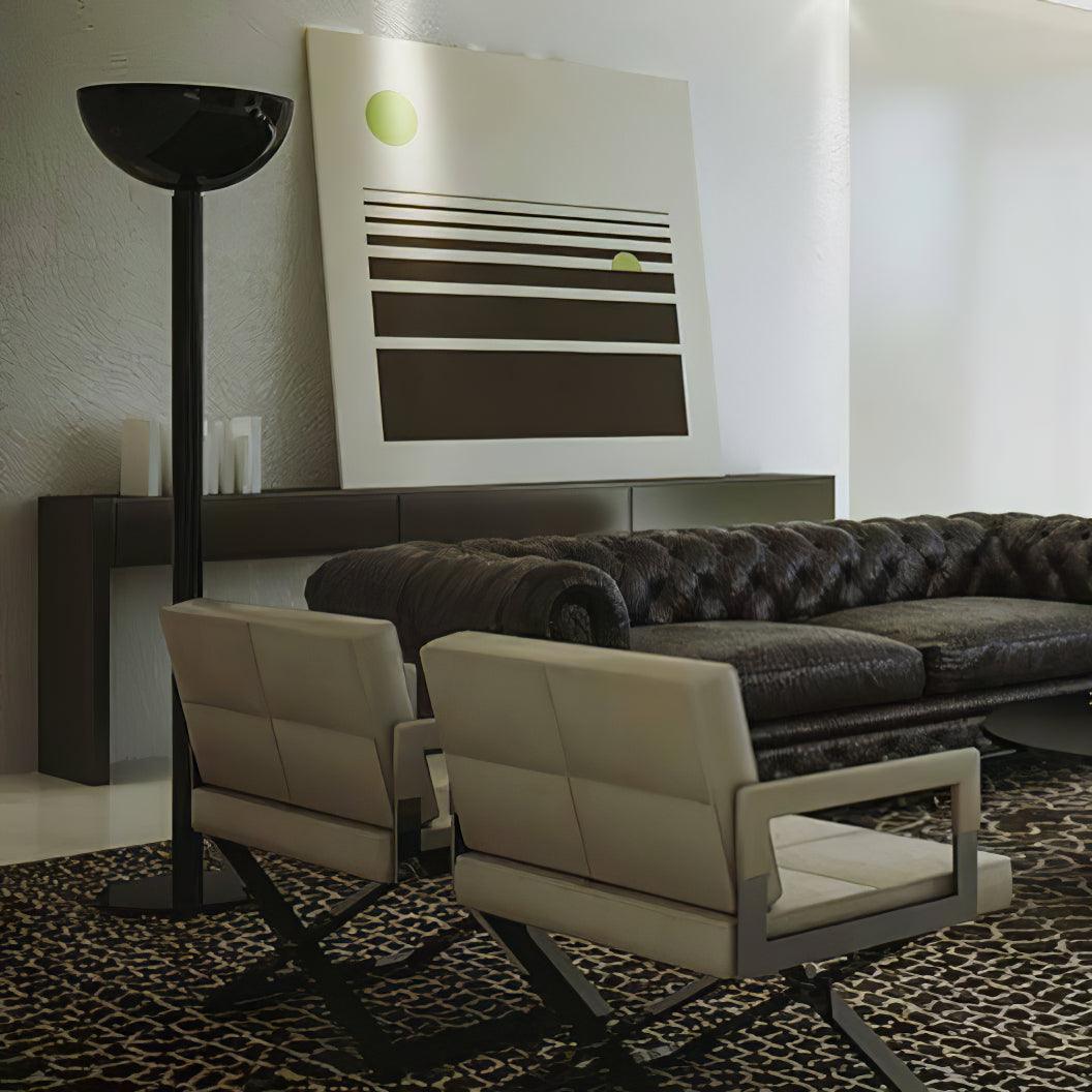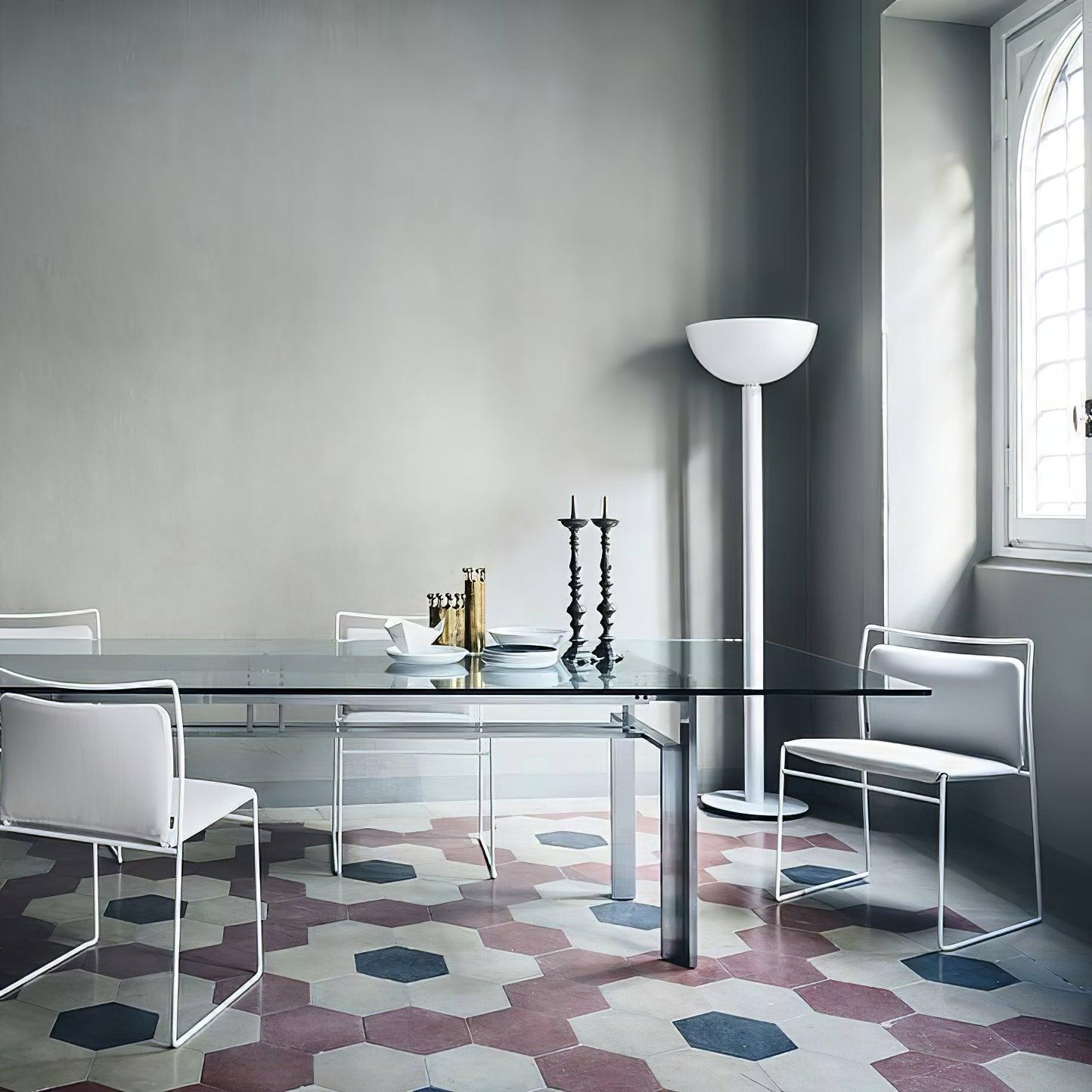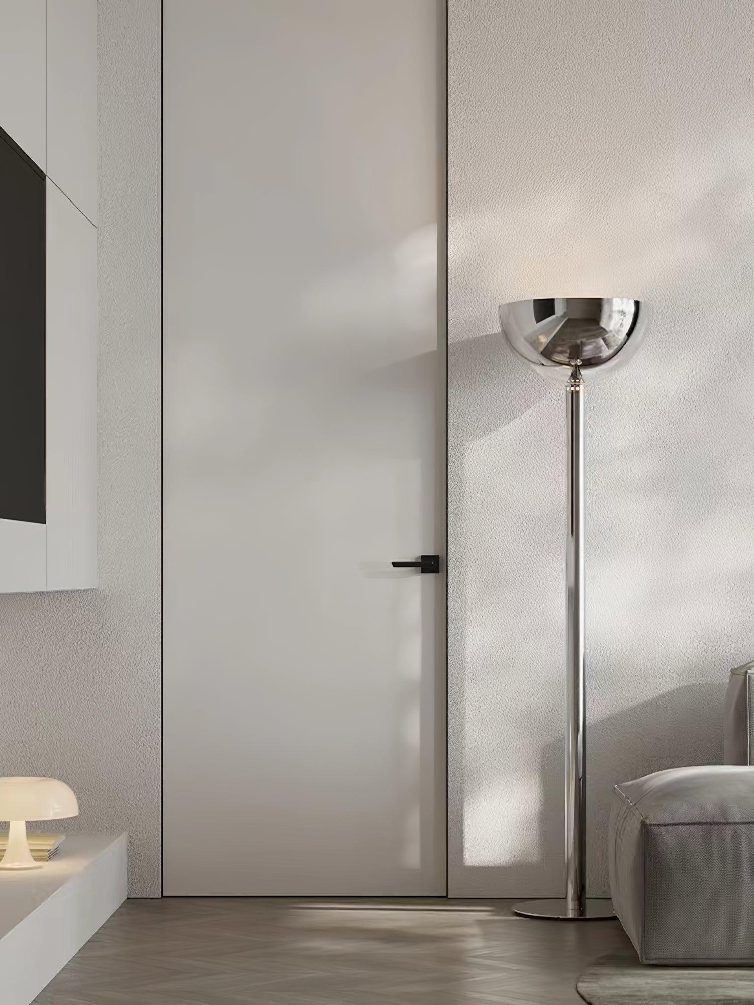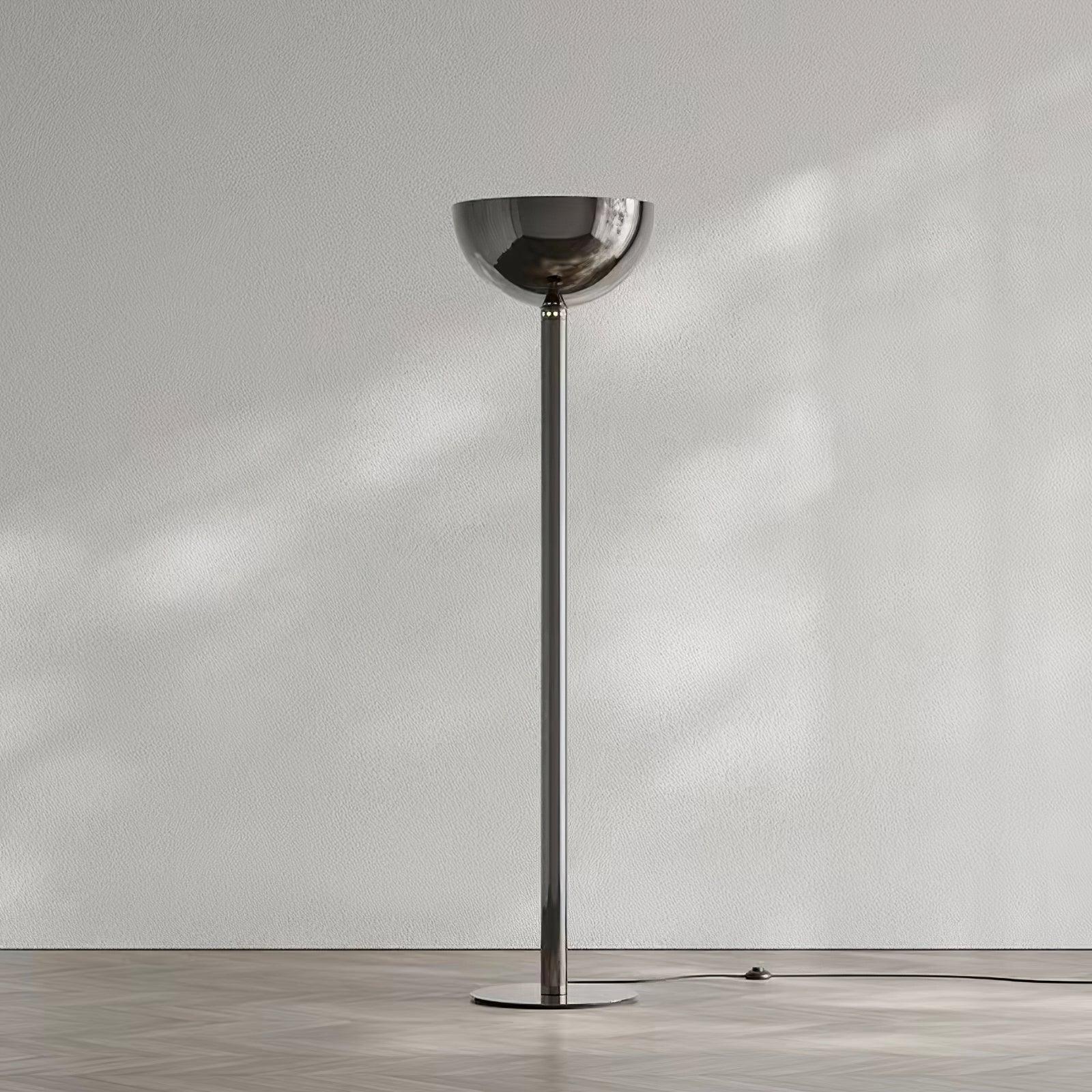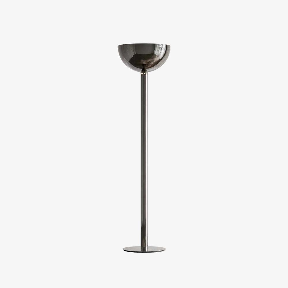 鍍鉻結構落地燈。鍍鉻、黑色或白色金屬擴散器。線性或彎曲燈桿由鍍鉻或鍍黑鉻鋼製成,半圓形燈罩由乳白色玻璃製成。 Uplight泛光光束分佈。