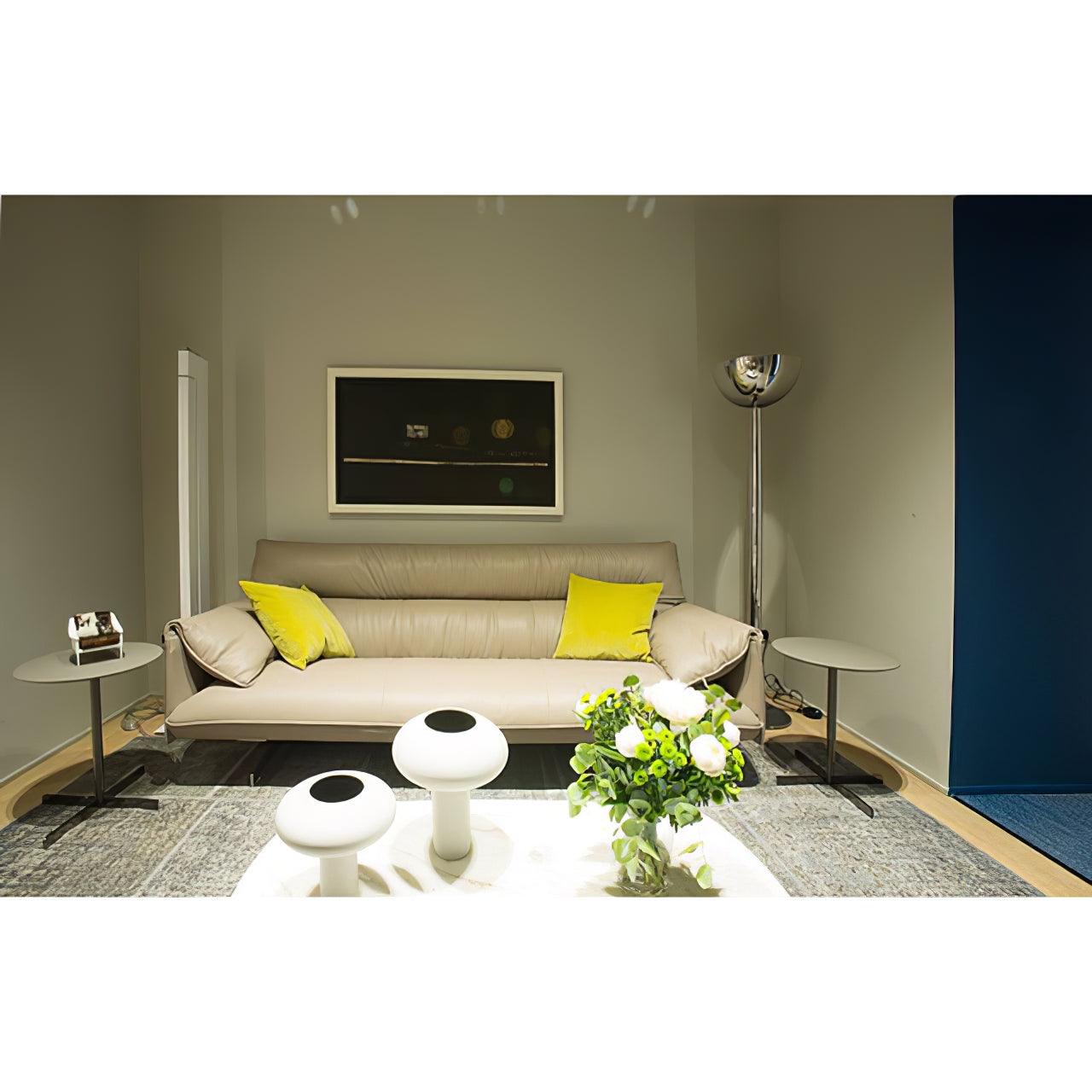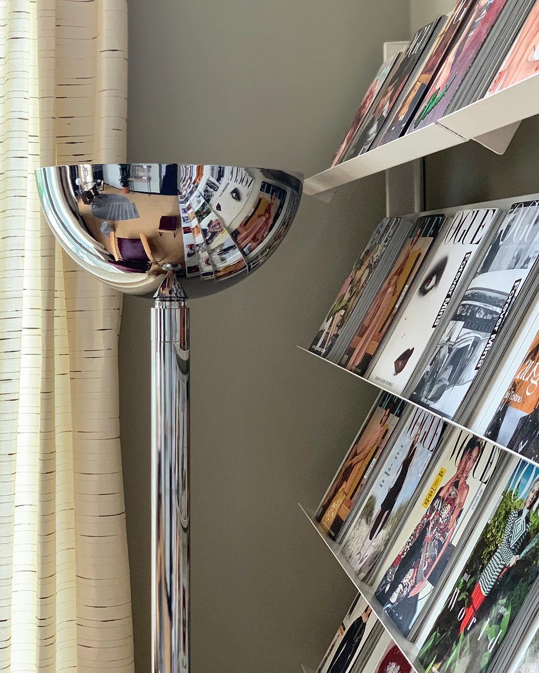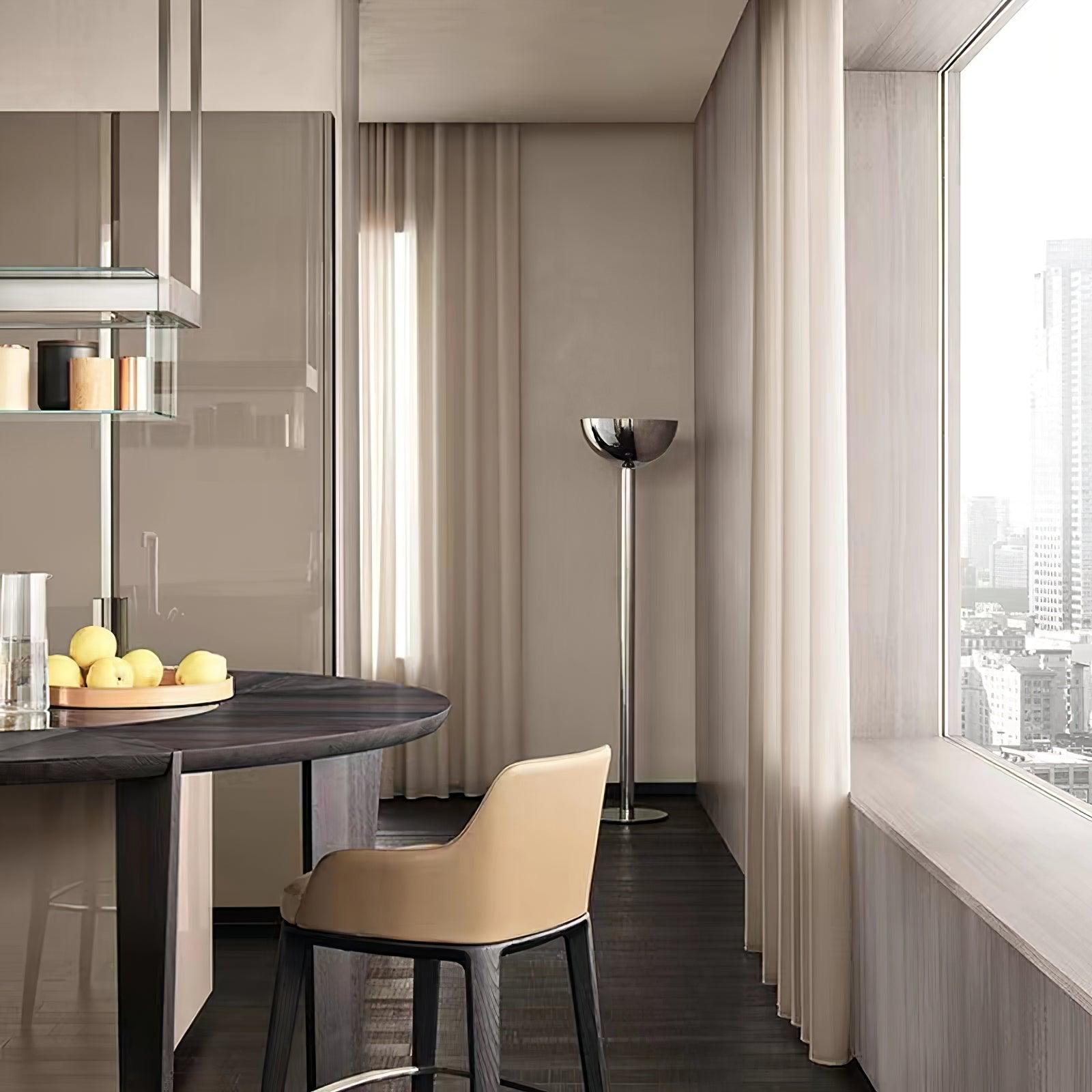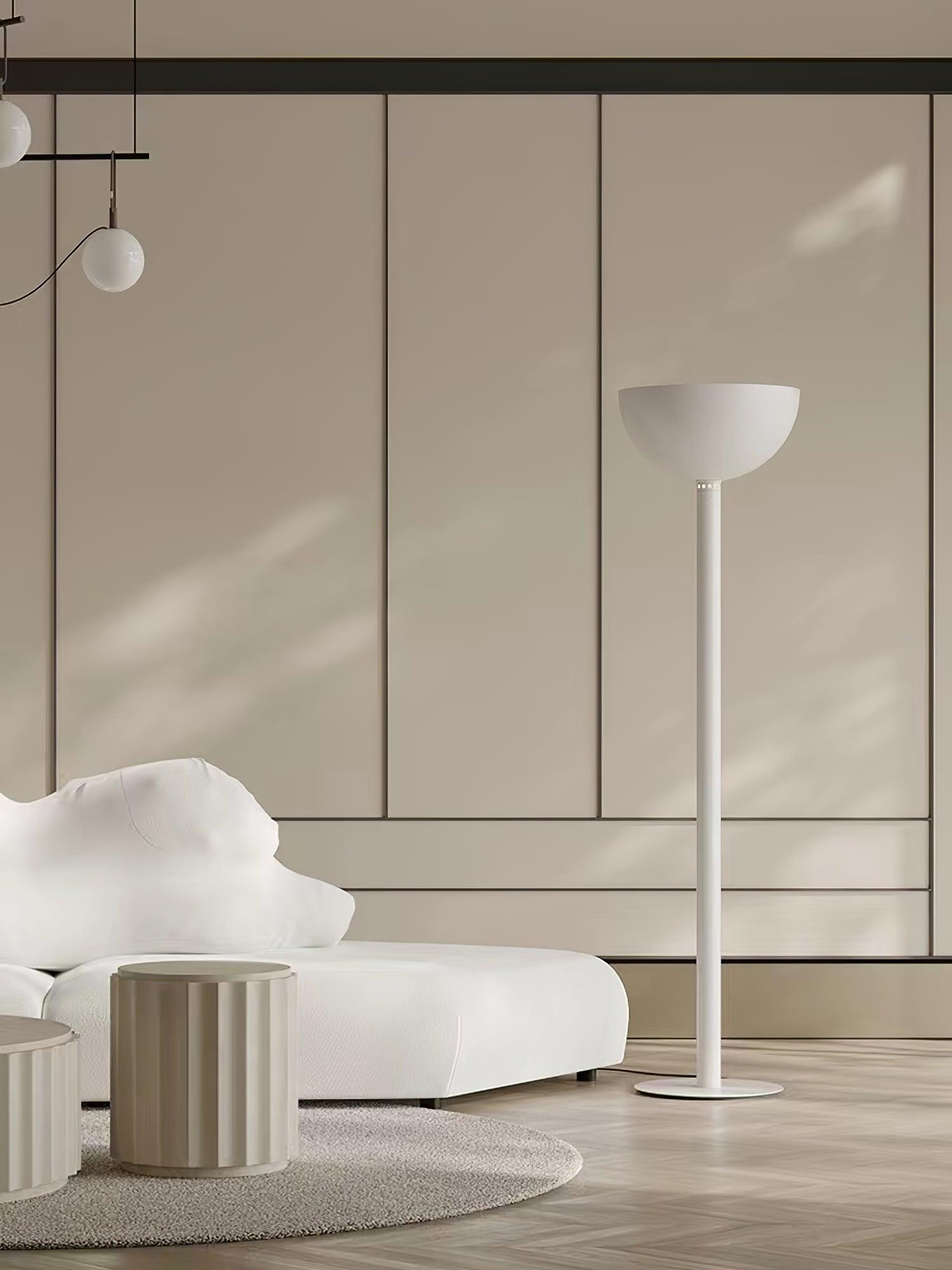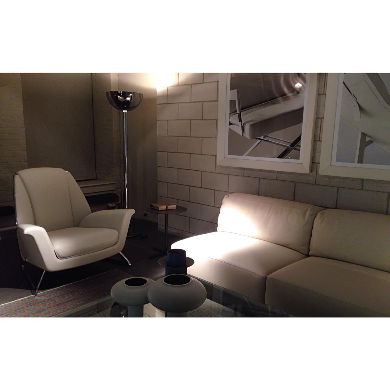 鍍鉻結構落地燈。鍍鉻、黑色或白色金屬擴散器。線性或彎曲燈桿由鍍鉻或鍍黑鉻鋼製成,半圓形燈罩由乳白色玻璃製成。 Uplight泛光光束分佈。