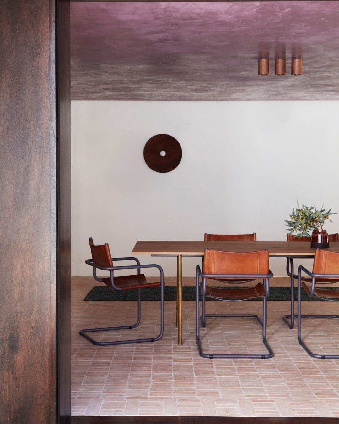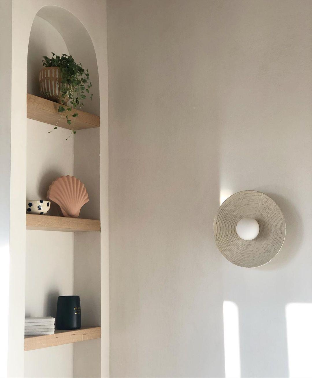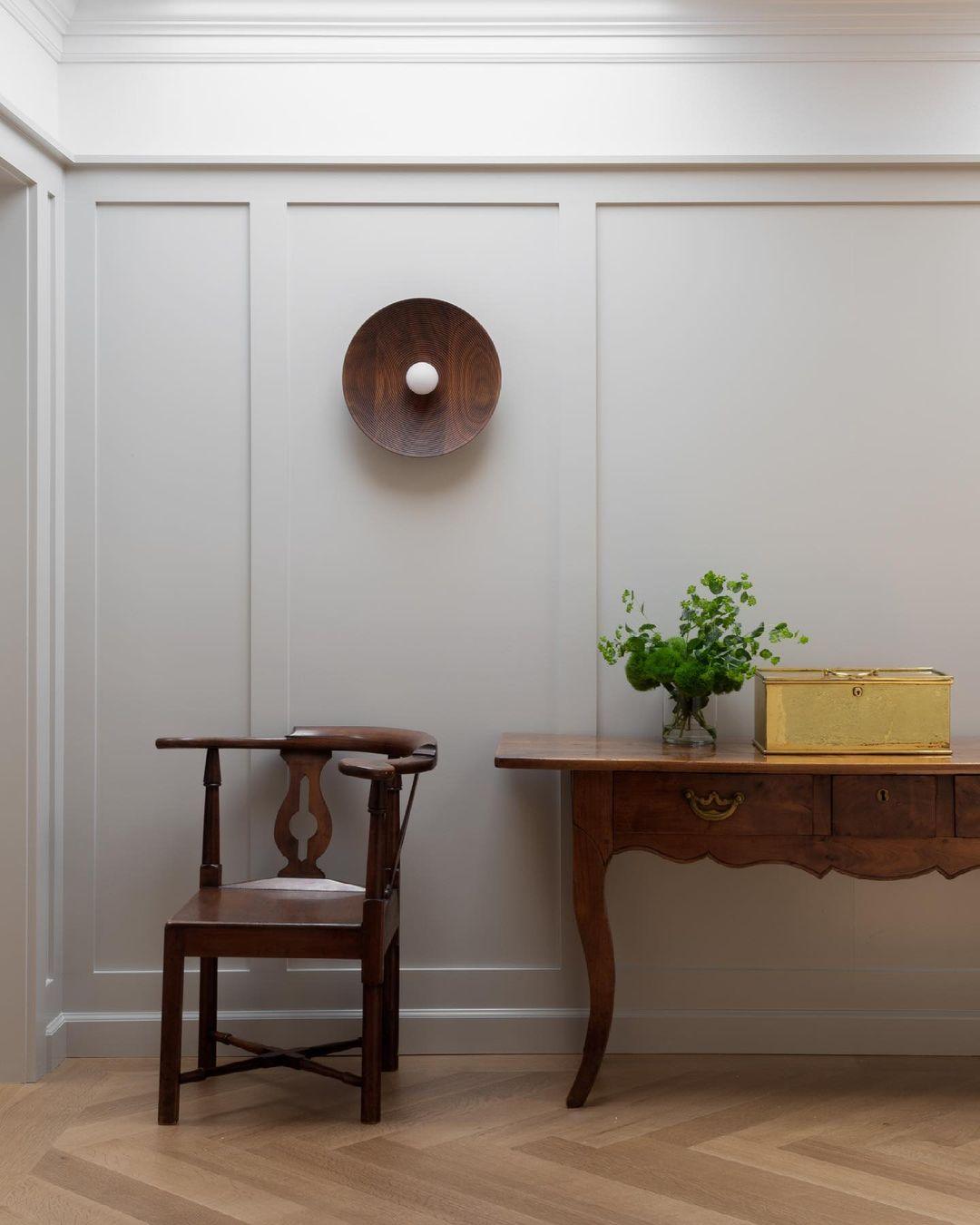 這個手工製作的圓頂的形狀在它的凹槽中得到呼應。燈罩在車床上精心塑造,以獲得令人愉悅的弧度。固定裝置的幾何形狀,尤其是同心圓,在木材中形成地形紋理,在照明時會突出顯示。這款燈具由實木和金屬製成,可以安裝在牆壁或天花板上。