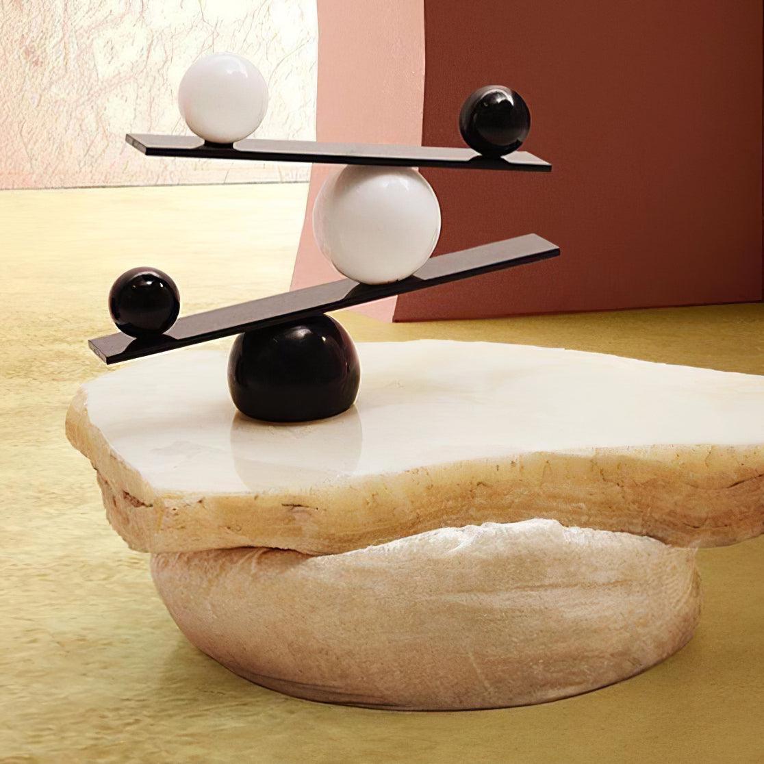 所有實體都在移動,沒有任何東西是靜止的。平衡玩弄時間的概念——一切都在運動。球體不可能的位置是存在的脆弱性的表達。停留在時間中的球體組提醒觀察者,無論如何,生命總是在運動。