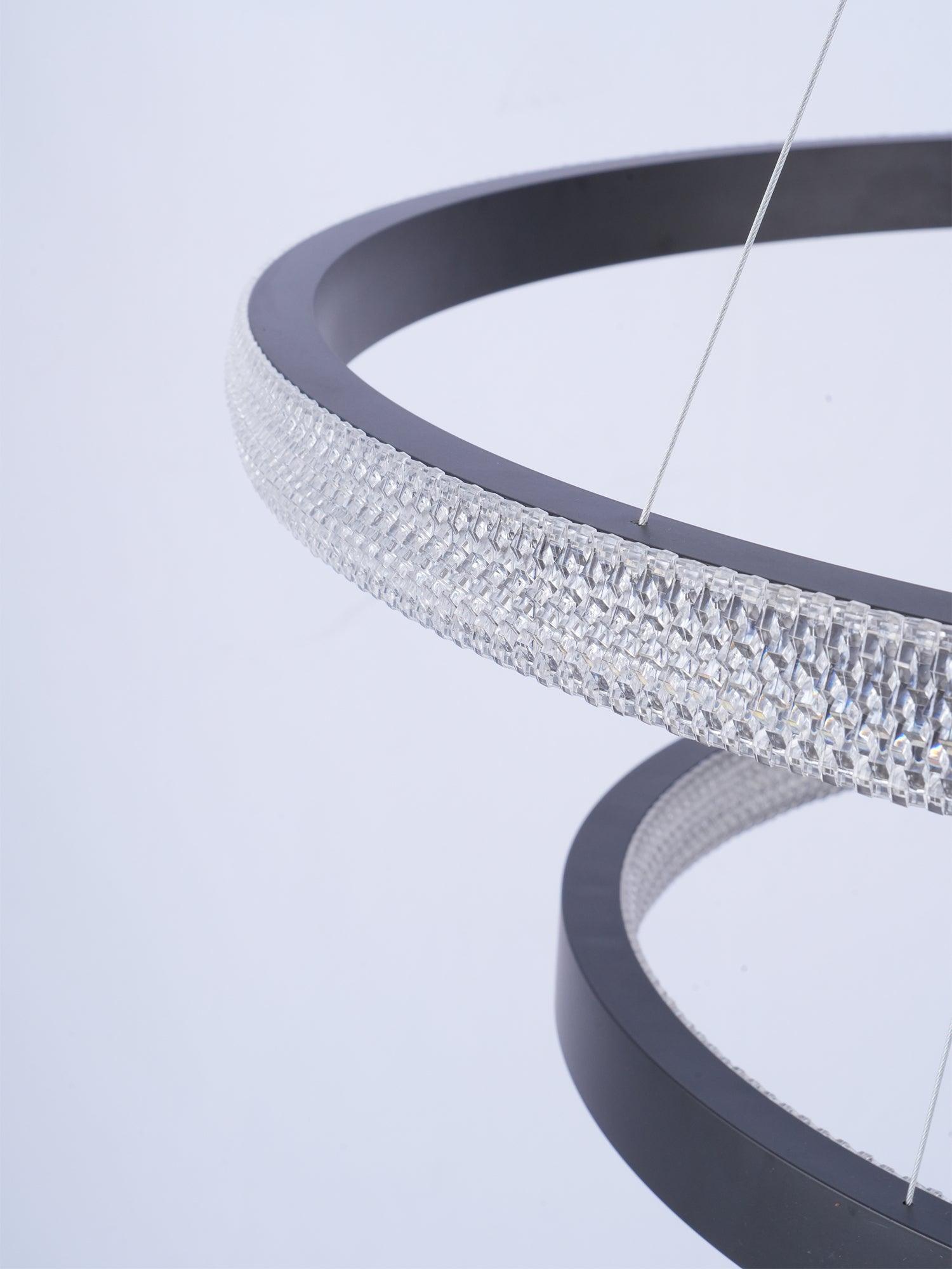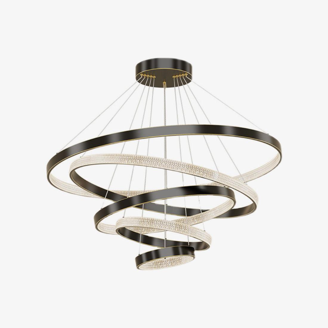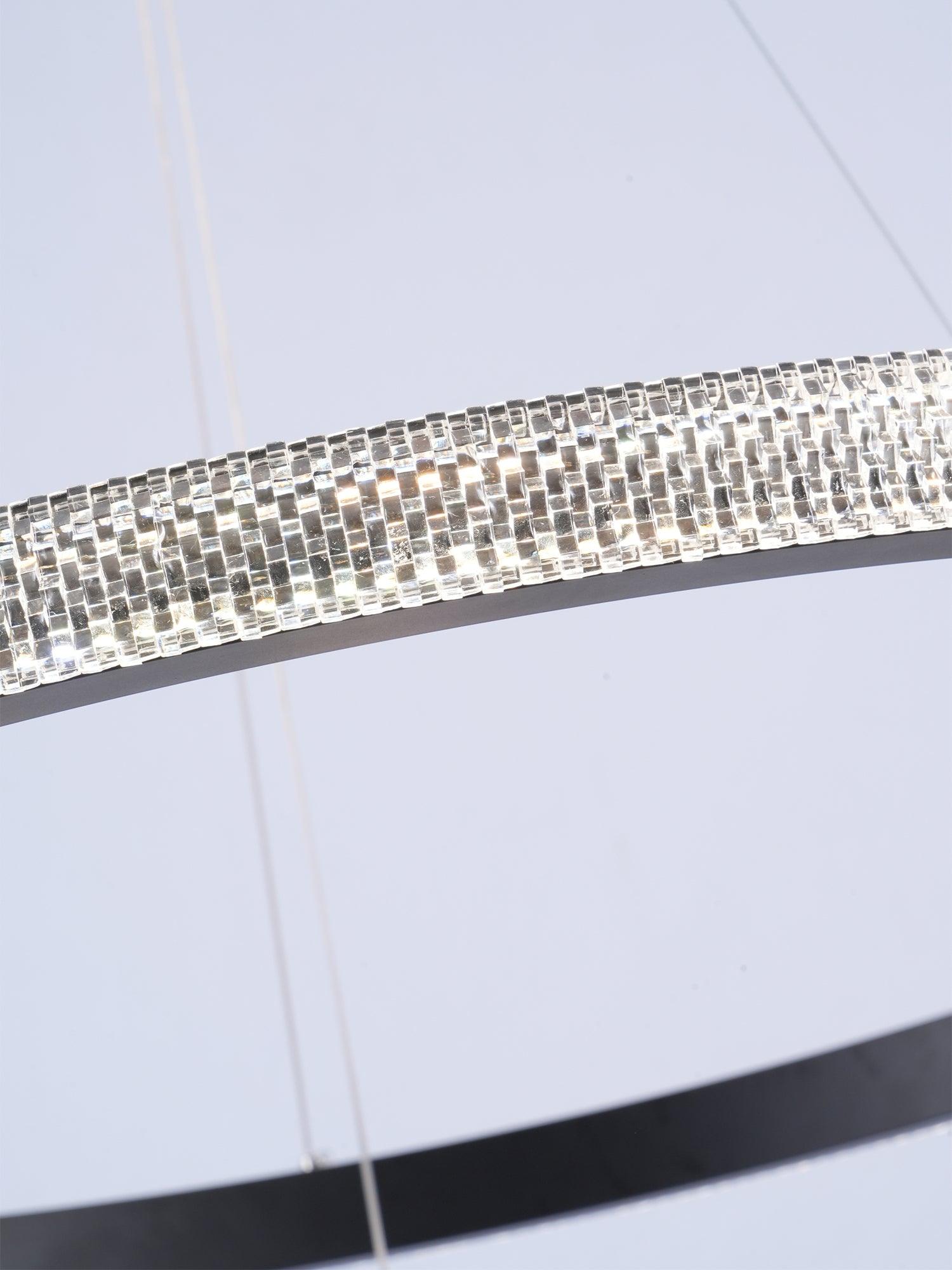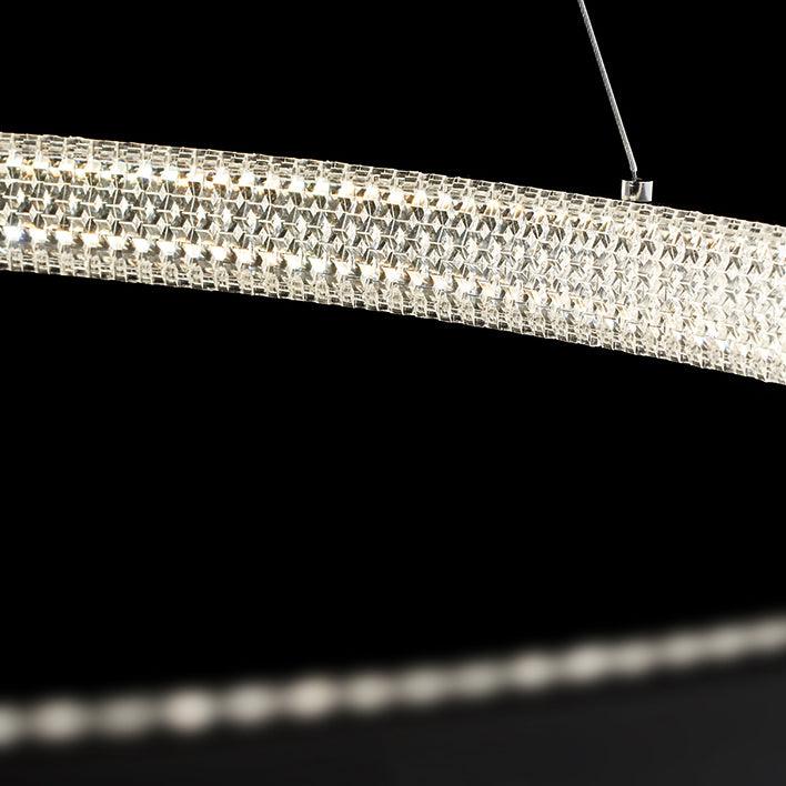 具有多種拋光和拉絲飾面可供選擇,精確盤繞的環包裹著 LED 燈配置,平衡了由數百個手工組裝的閃爍漫射器分散的內部和外部可調光。微妙的懸掛電纜可調節,以根據需要個性化懸掛配置。
