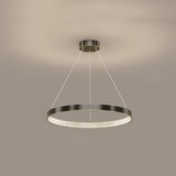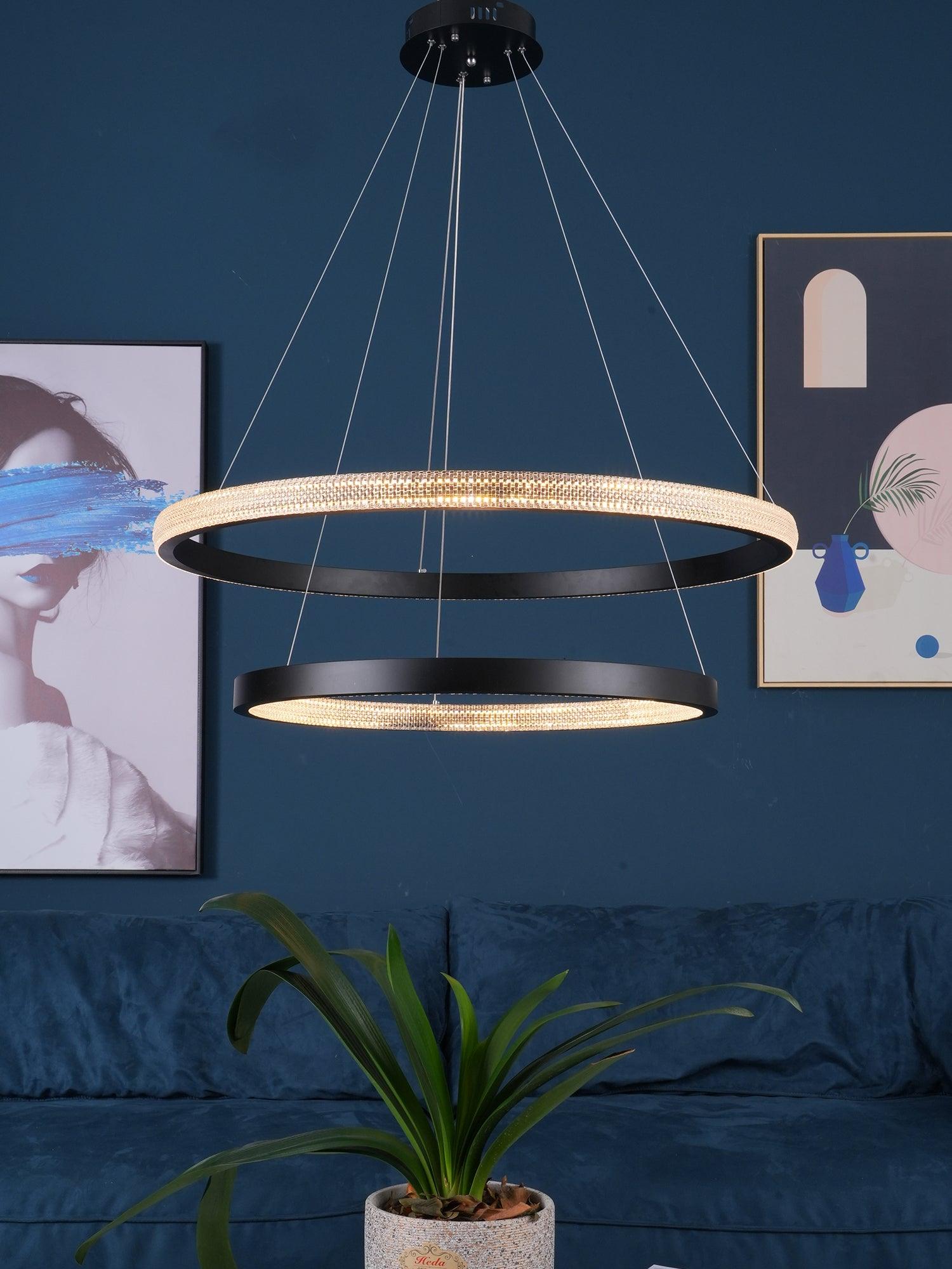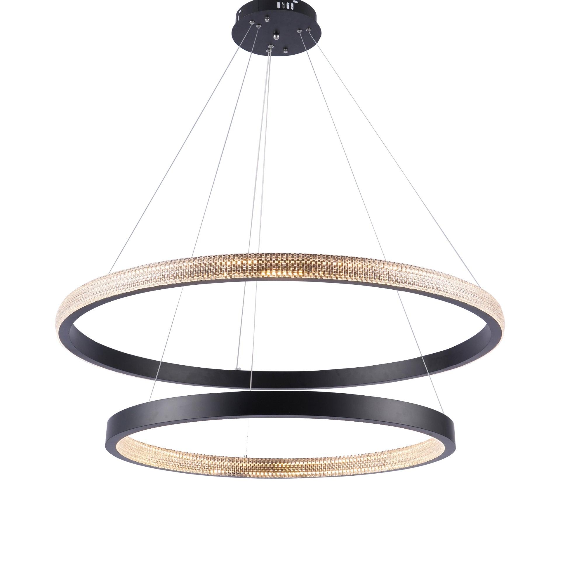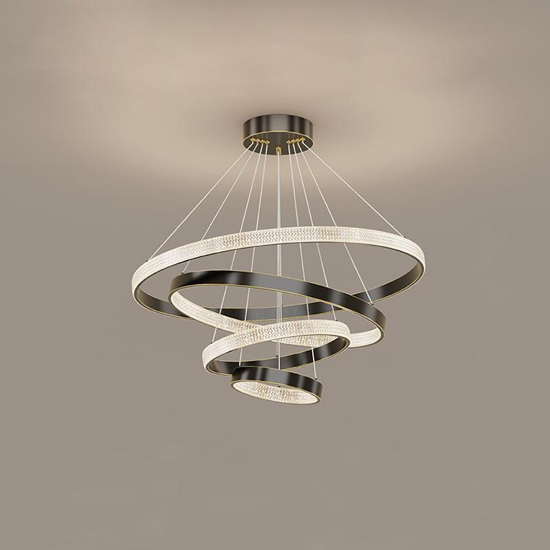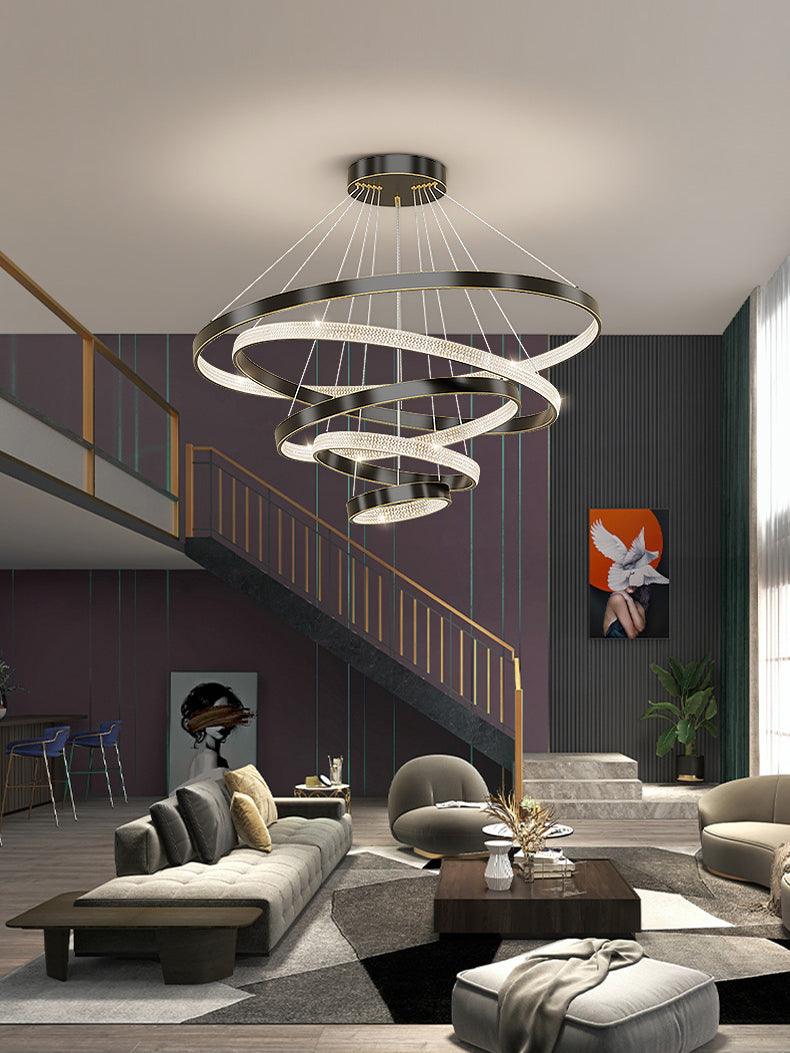 具有多種拋光和拉絲飾面可供選擇,精確盤繞的環包裹著 LED 燈配置,平衡了由數百個手工組裝的閃爍漫射器分散的內部和外部可調光。微妙的懸掛電纜可調節,以根據需要個性化懸掛配置。