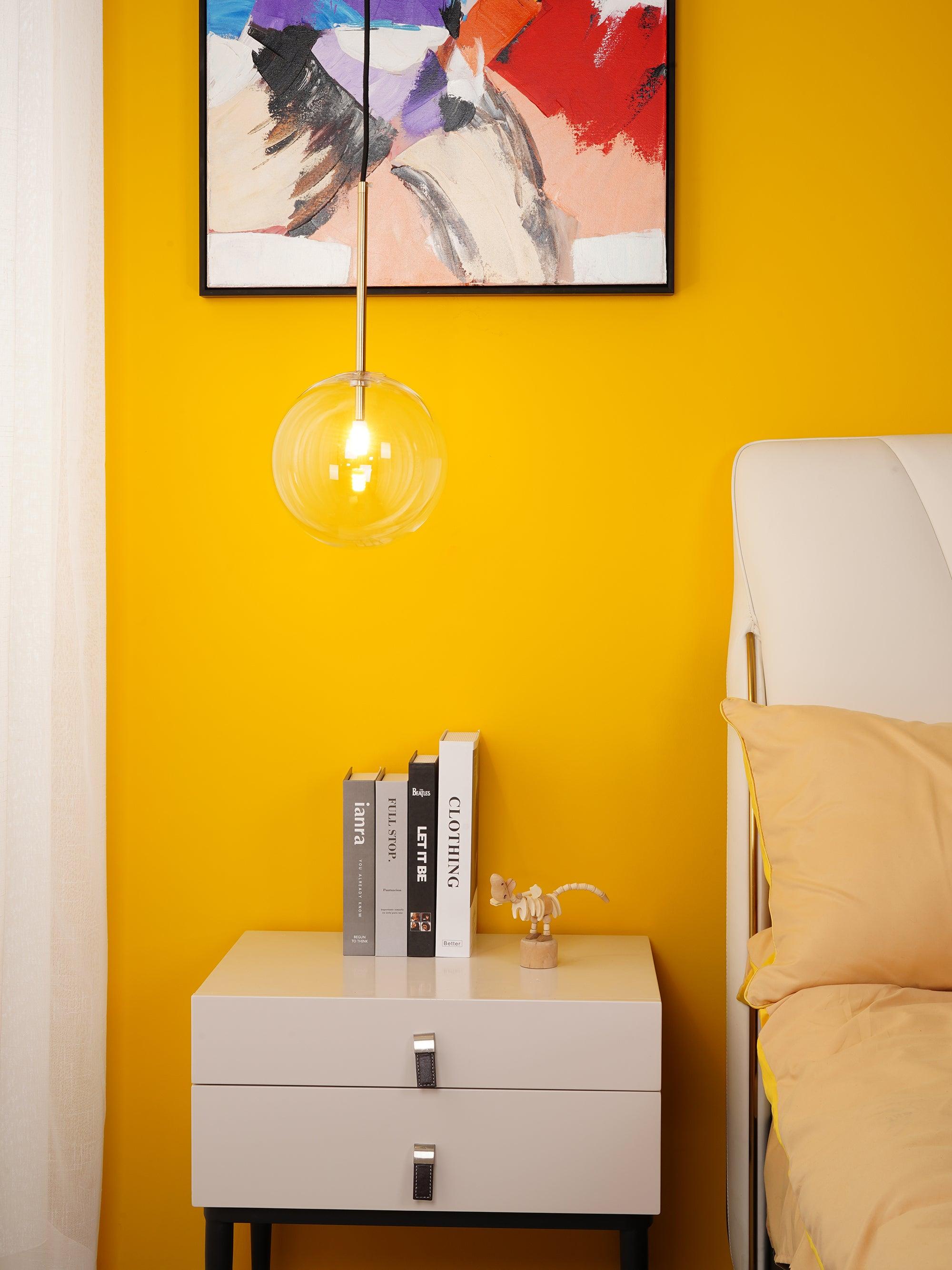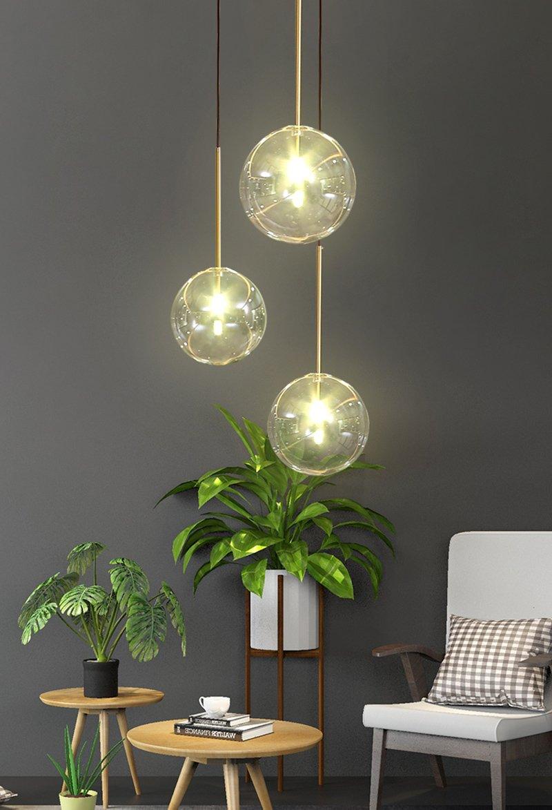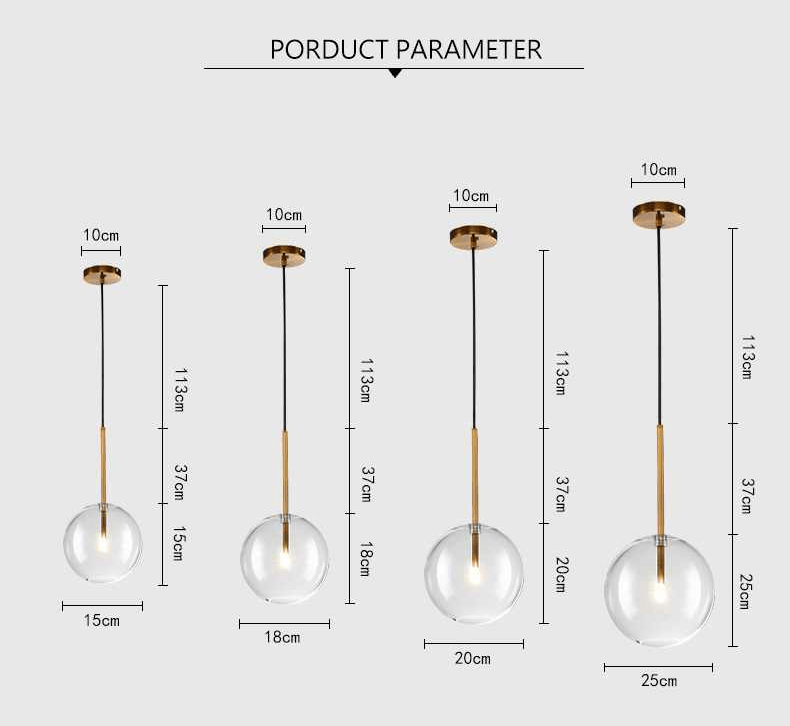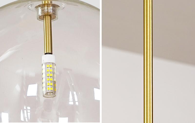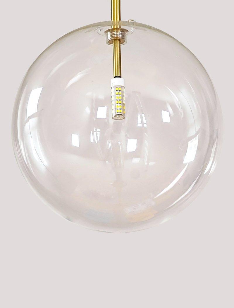 帶 LED 點光源 (G4) 的吊燈。透明吹製玻璃球體。手工拋光黃銅金屬部件。手工打磨的黃銅飾面看起來自然有斑點且不規則。由於這種工藝加工,每件產品都是獨一無二的。
