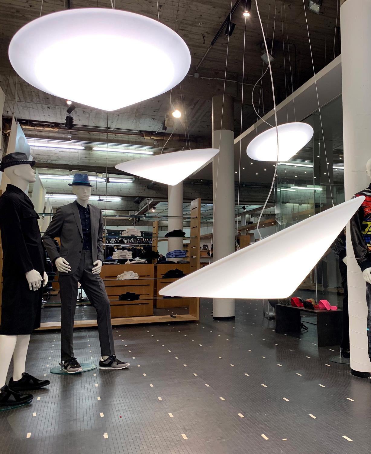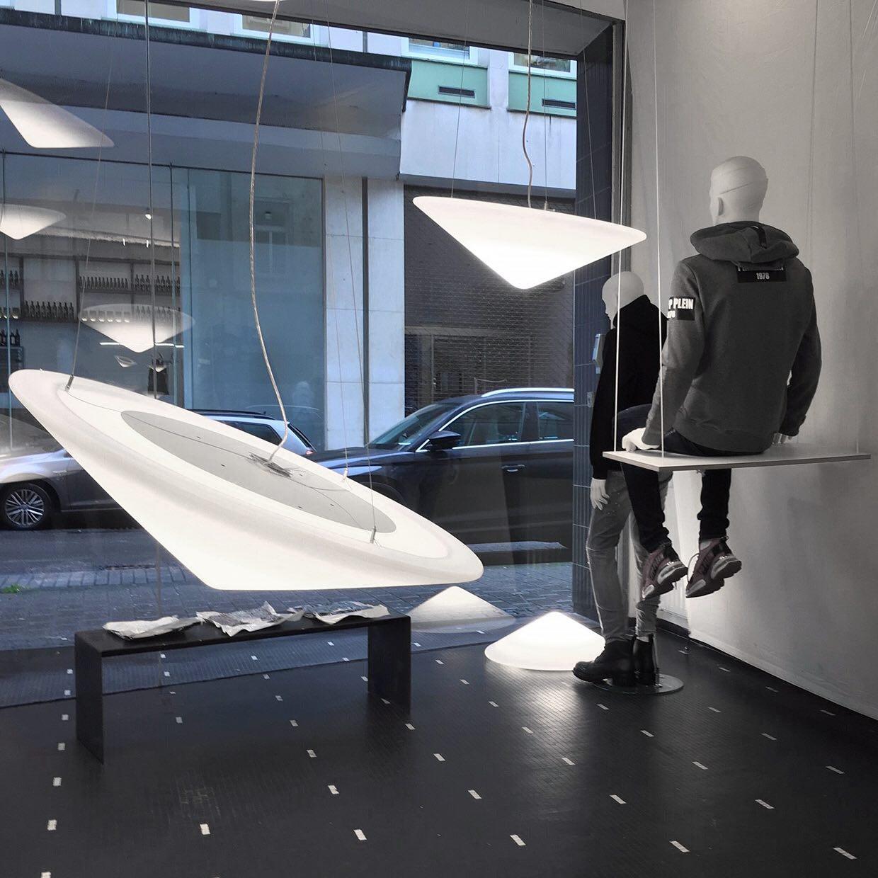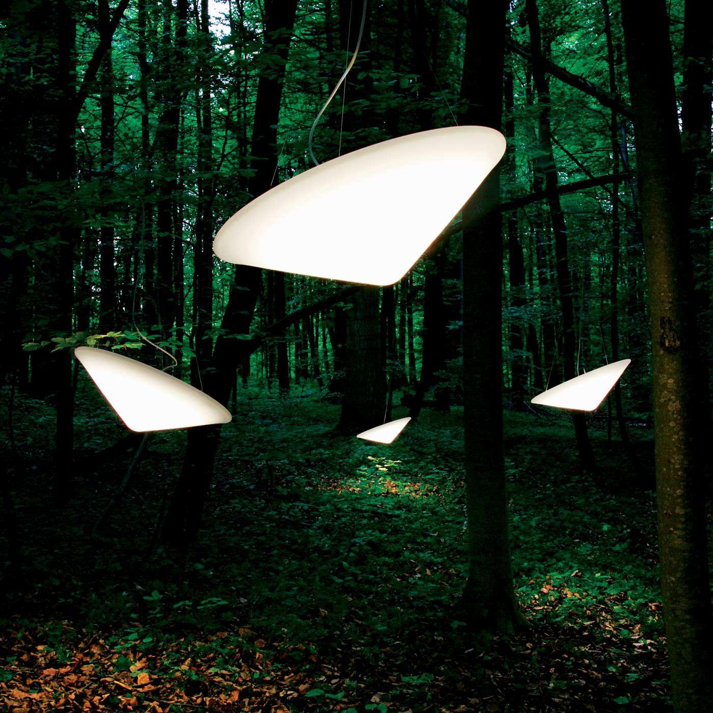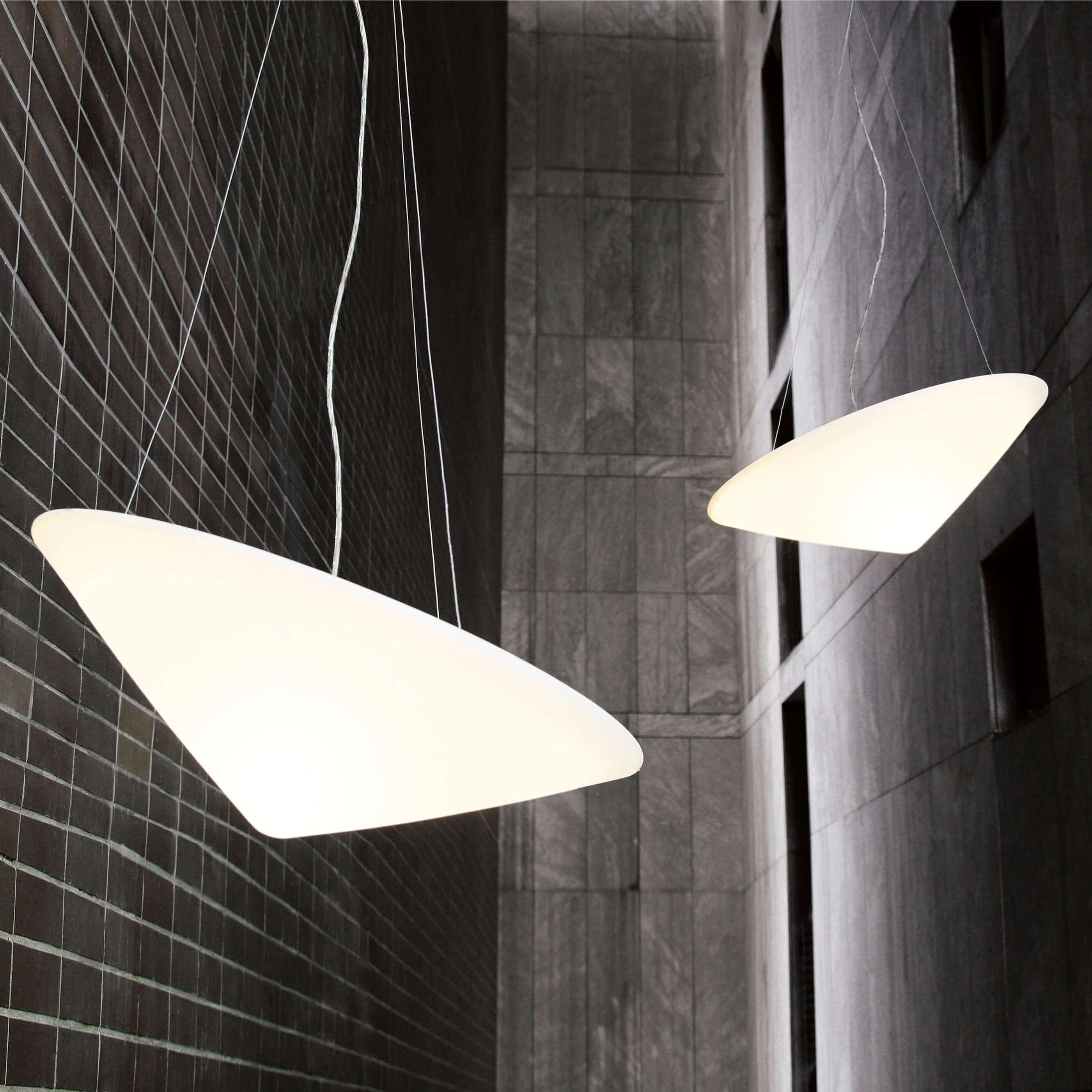 可使用外部相位調光器進行調光。下一個吊燈曹茅的形狀像中國稻田工人的傳統帽子。儘管它的尺寸很大,但它似乎很輕。它的半透明聚乙烯擴散器高度可調,也可以傾斜以產生更令人驚訝的效果。