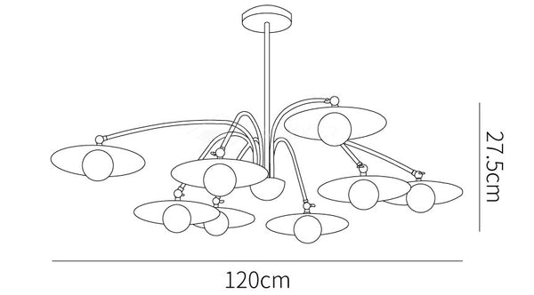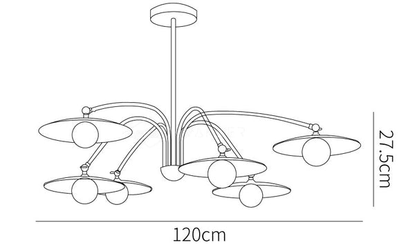 這款枝形吊燈的靈感來自蘑菇頂的形狀,將飾面與裝飾藝術風格的耀斑融為一體。玻璃燈罩的扁平形狀和乳白色散發出柔和、平靜的光芒。