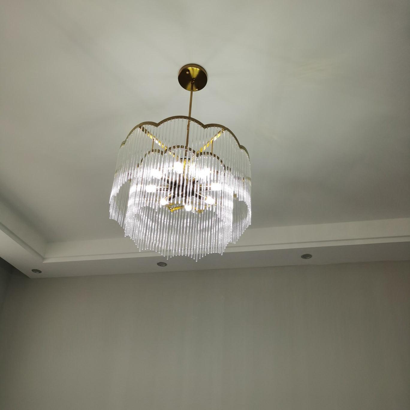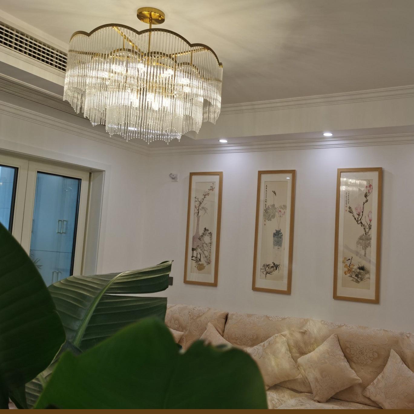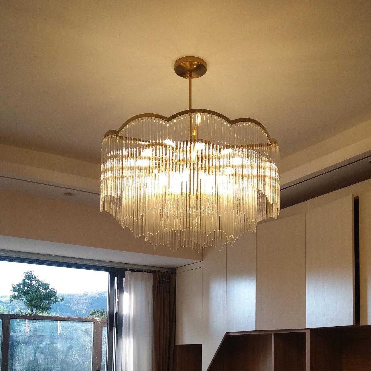 吊燈採用透明玻璃棒吊墜和全銅燈架,勾勒出極簡的波浪造型,看起來夢幻又浪漫。