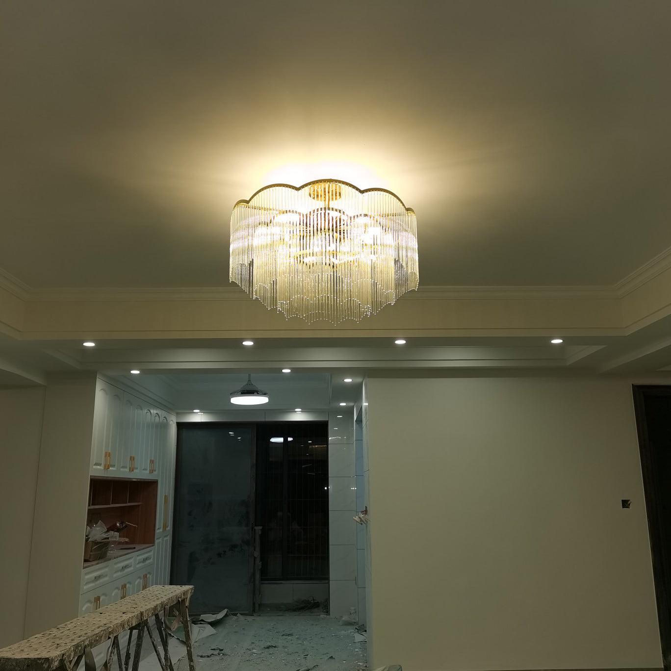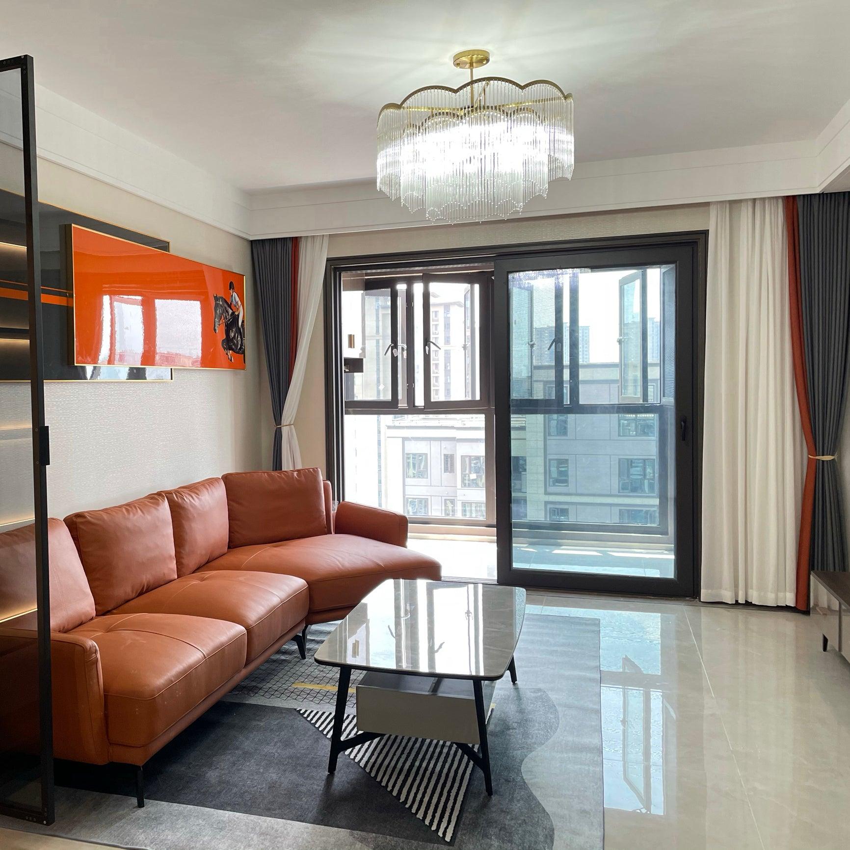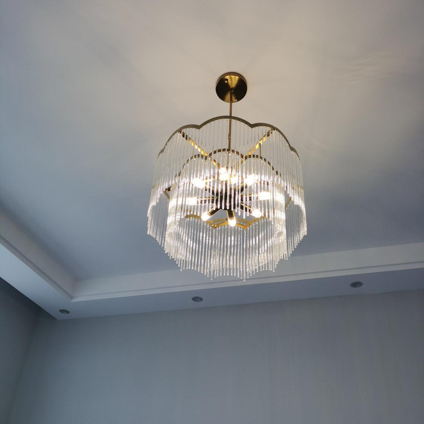 吊燈採用透明玻璃棒吊墜和全銅燈架,勾勒出極簡的波浪造型,看起來夢幻又浪漫。