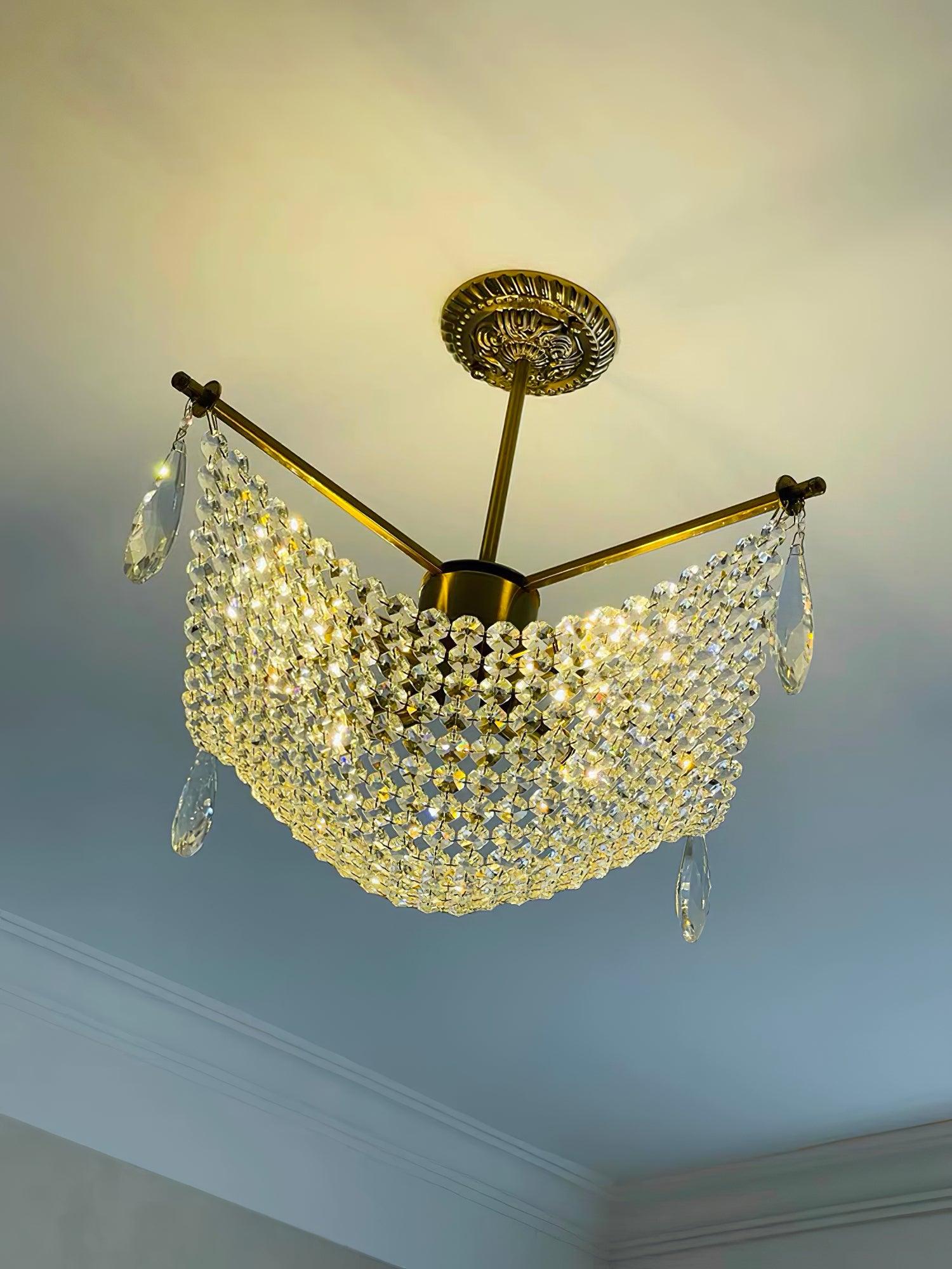 Corona 懸掛式燈具讓家裡充滿明亮的光線。框架的底部形成一個充滿透明水晶的半球,頂部有相配的水晶吊墜,垂墜的水晶八角形鏈條沿著燈身垂下,而華麗的水晶“皇冠”與框架的邊緣相匹配,完成了外觀和為設計命名。