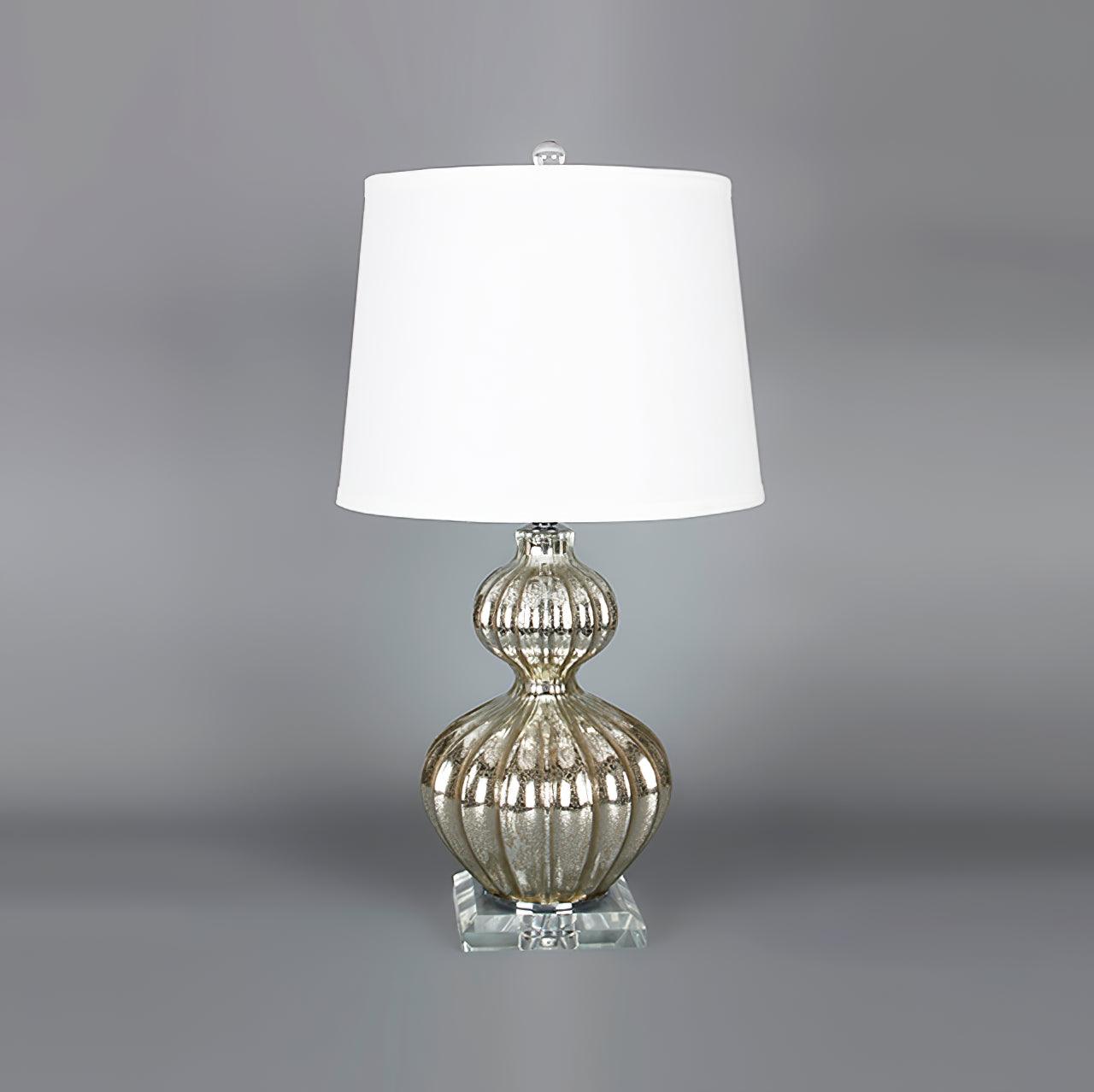 這款水銀玻璃檯燈位於圓形底座上,為您的裝飾增添優雅氣息。身體的冷銀色調與鼓罩中的暖色相得益彰。
