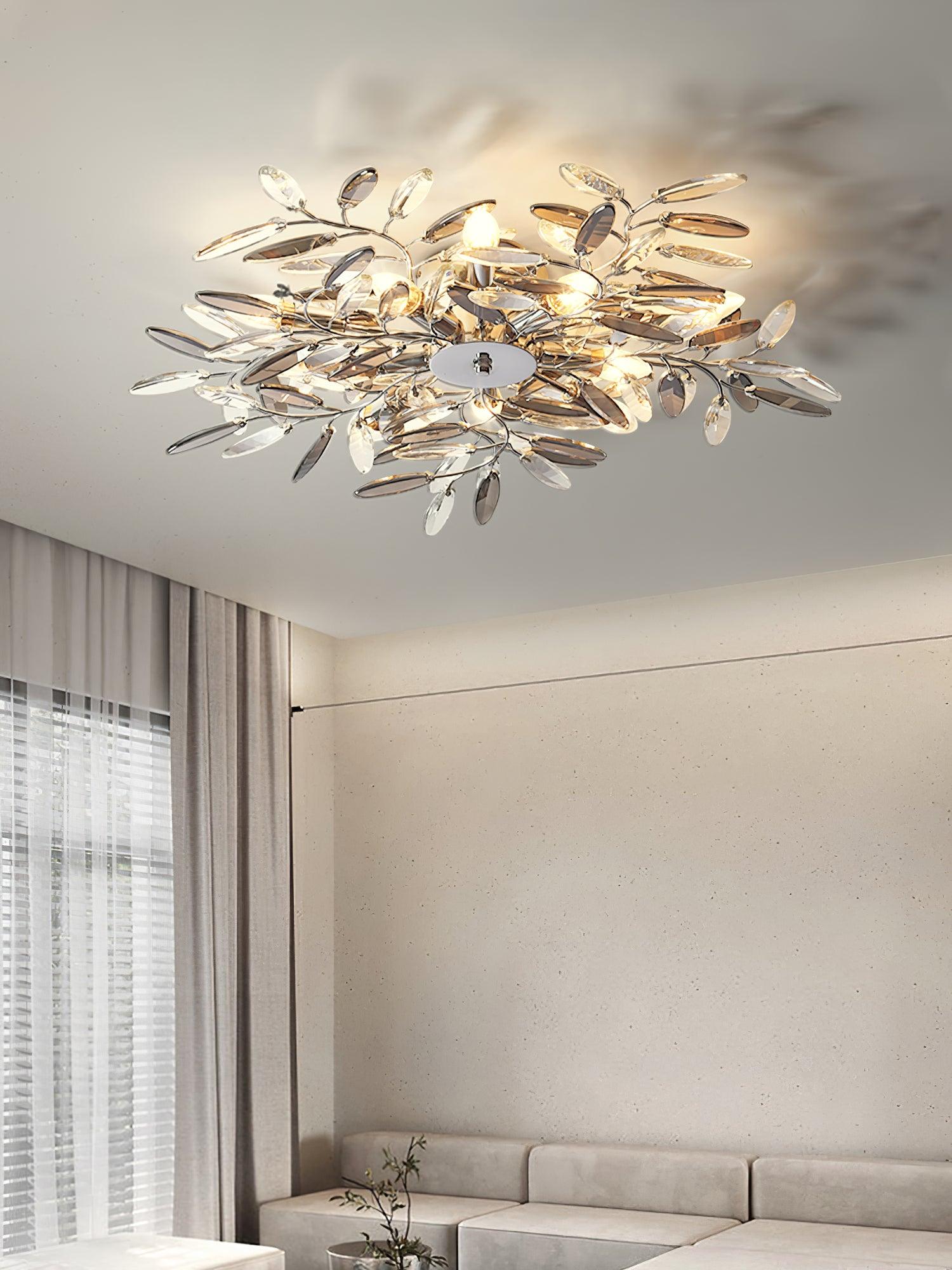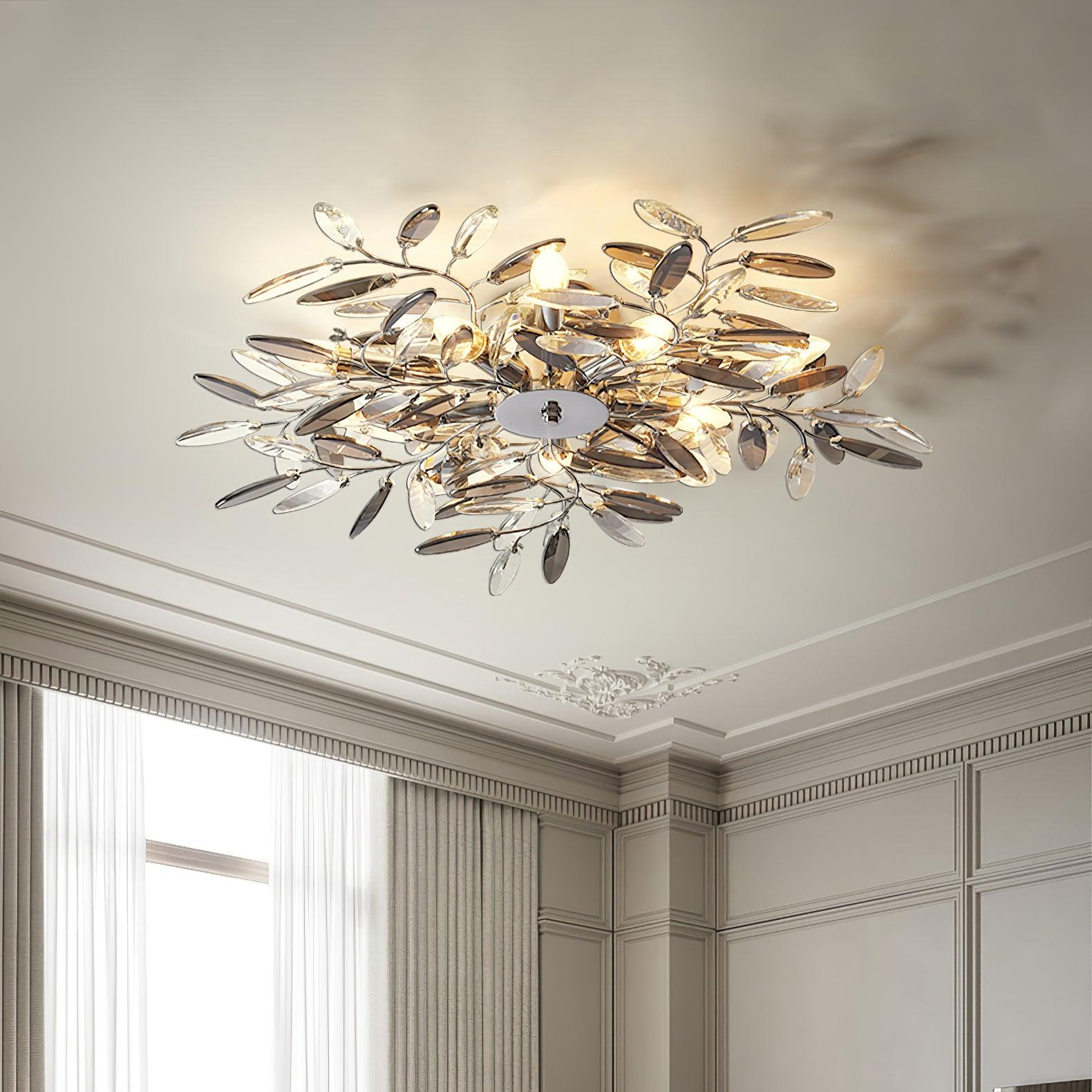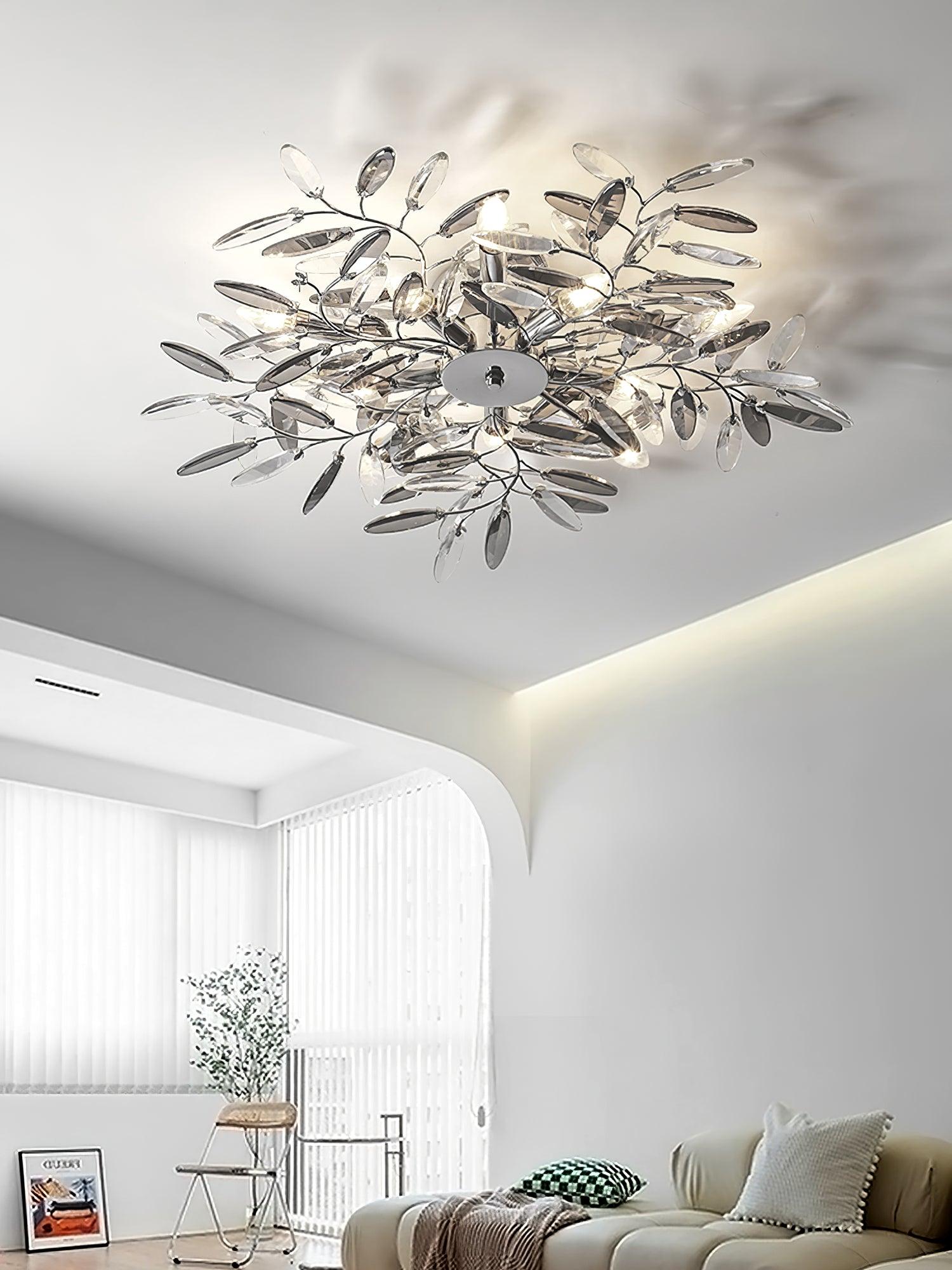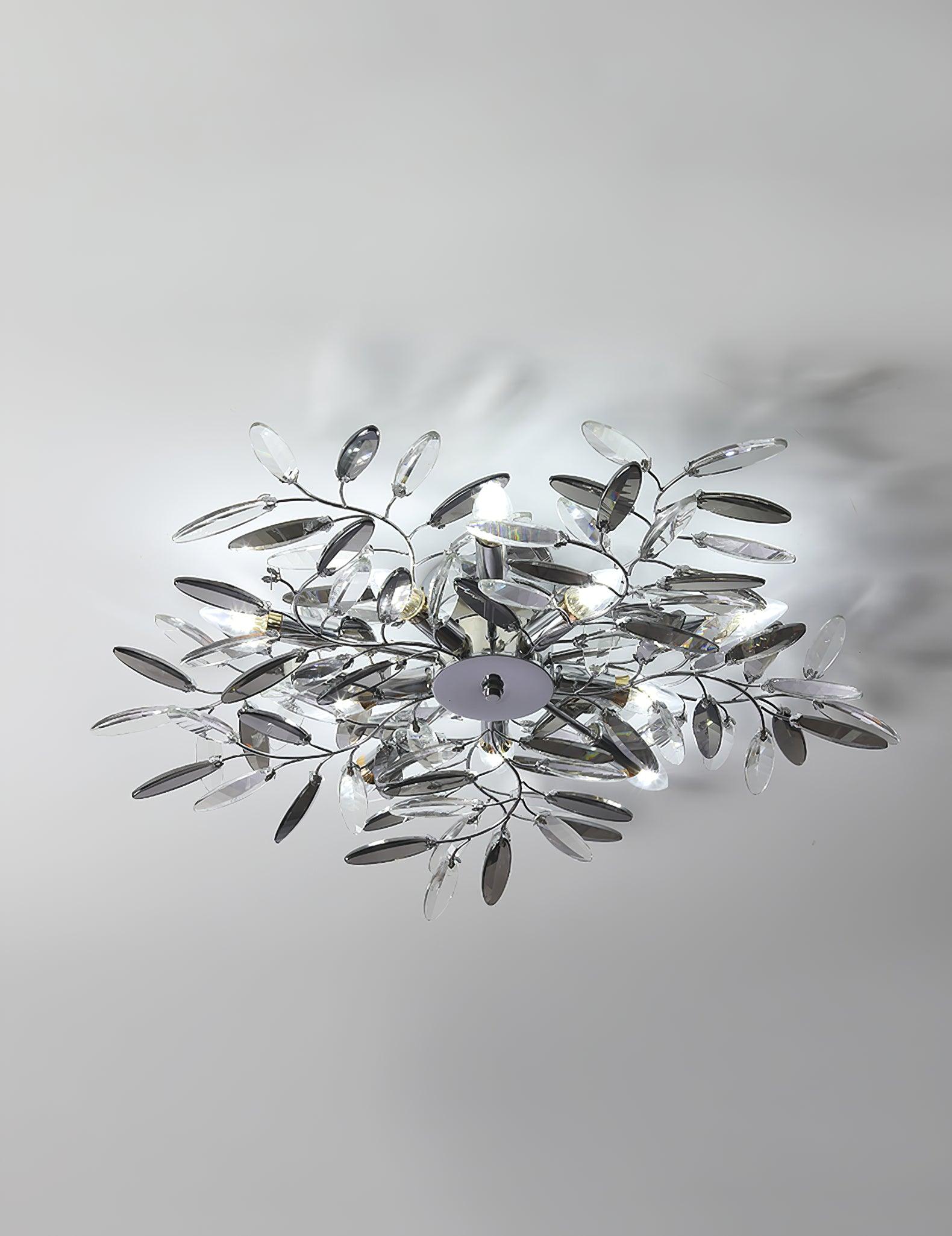 Crislett 系列的靈感來自冬季森林的輪廓,擁抱樹枝的曲折。在這些樹枝的末端是大量大尺寸的水晶“花蕾”,在這款四燈半嵌裝天花板燈具的日光鍍鉻飾面中增添了冬日般的光彩。