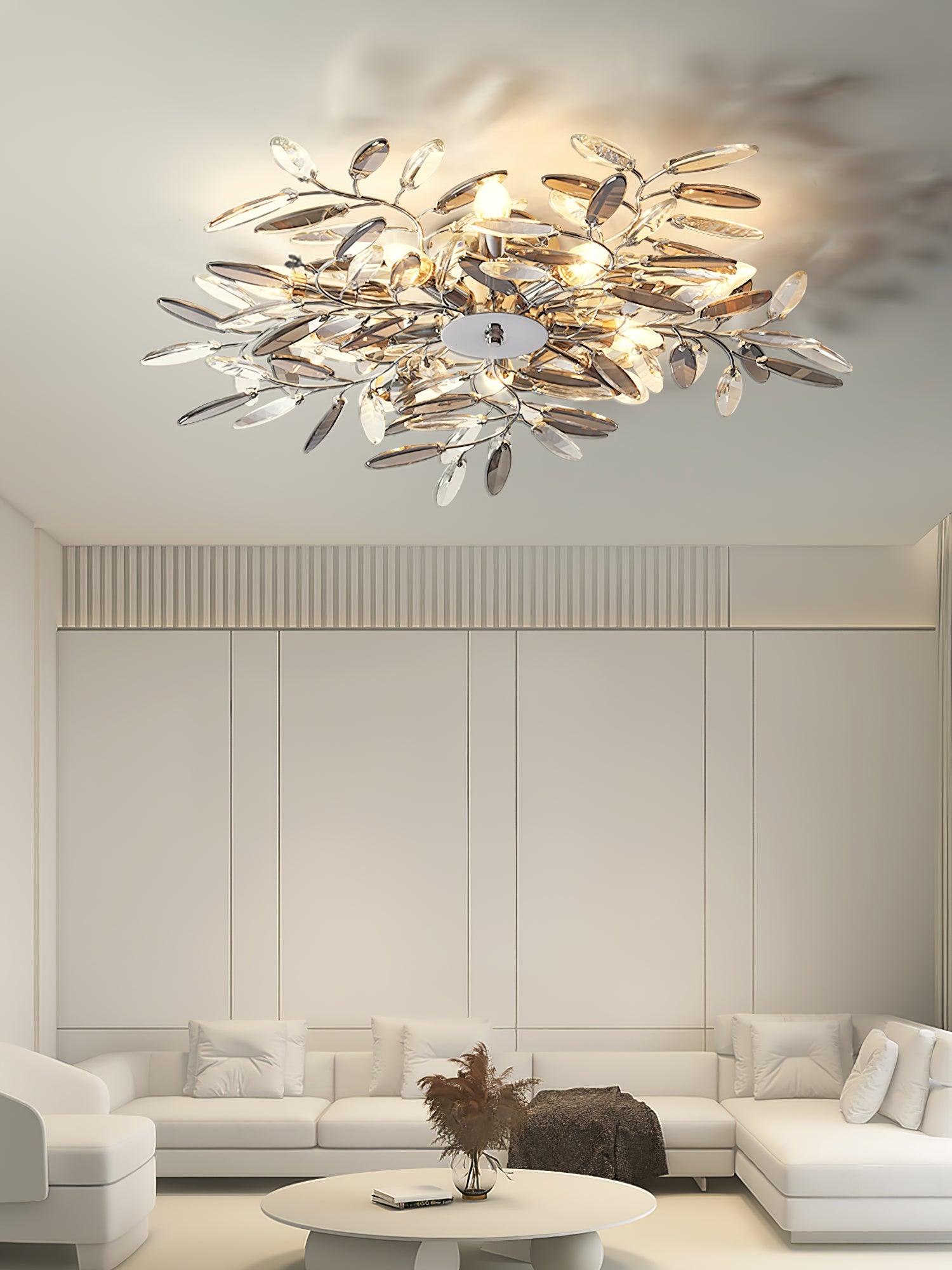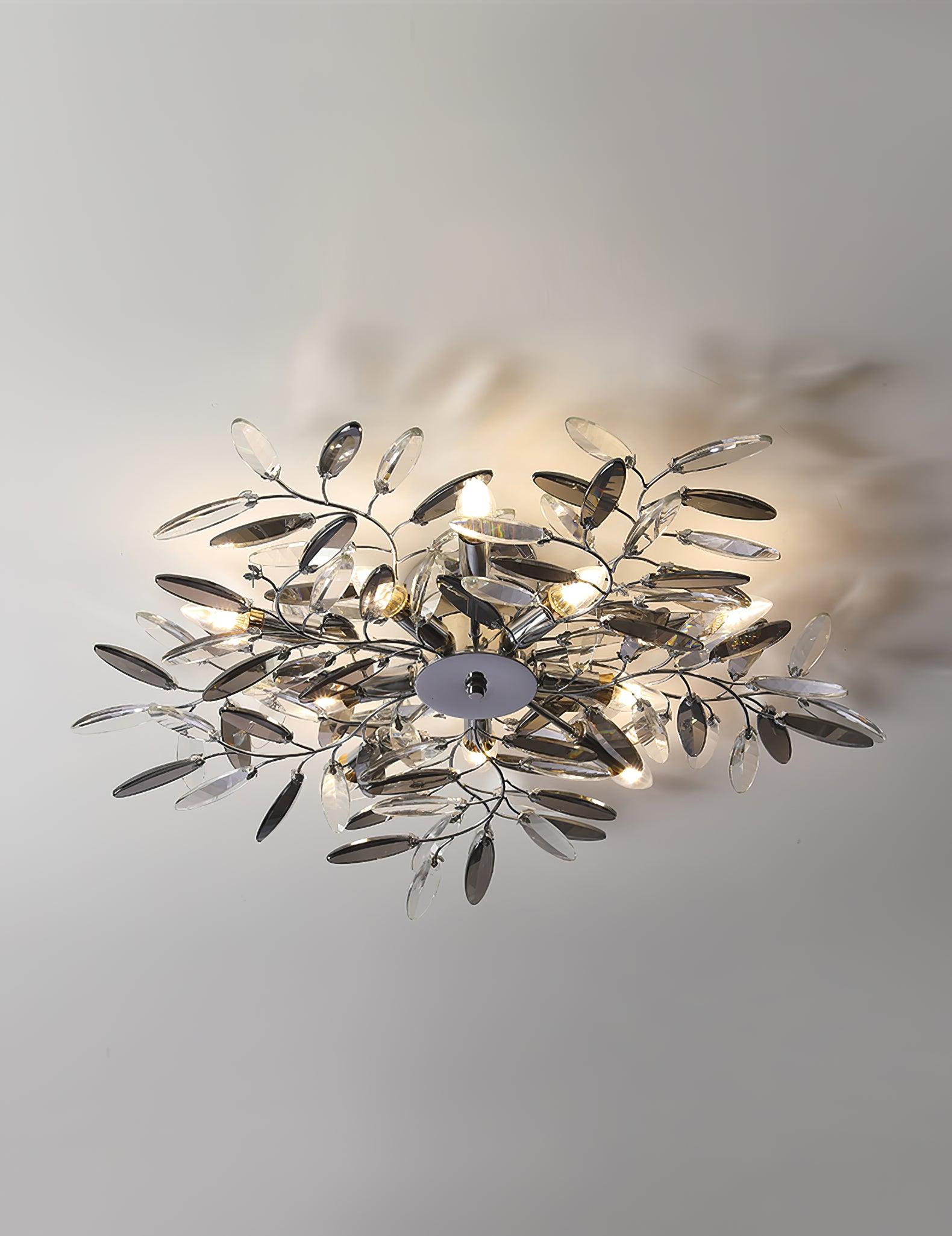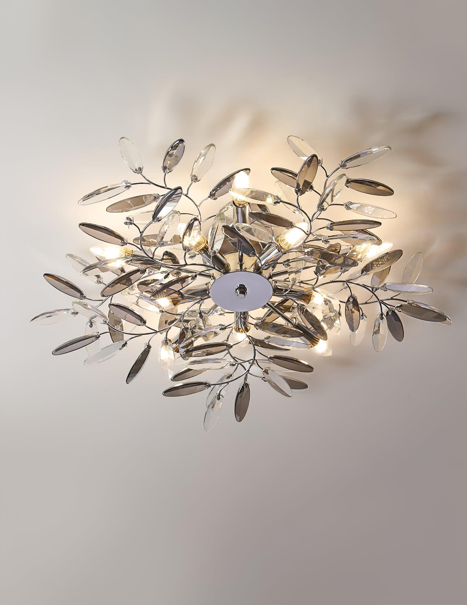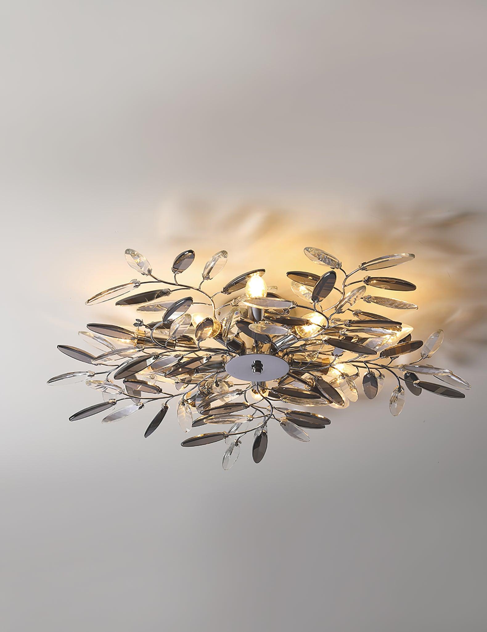 Crislett 系列的靈感來自冬季森林的輪廓,擁抱樹枝的曲折。在這些樹枝的末端是大量大尺寸的水晶“花蕾”,在這款四燈半嵌裝天花板燈具的日光鍍鉻飾面中增添了冬日般的光彩。