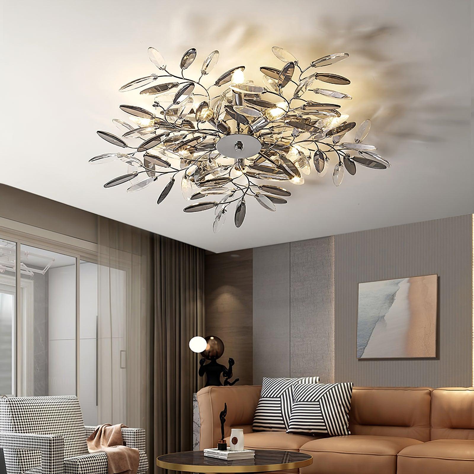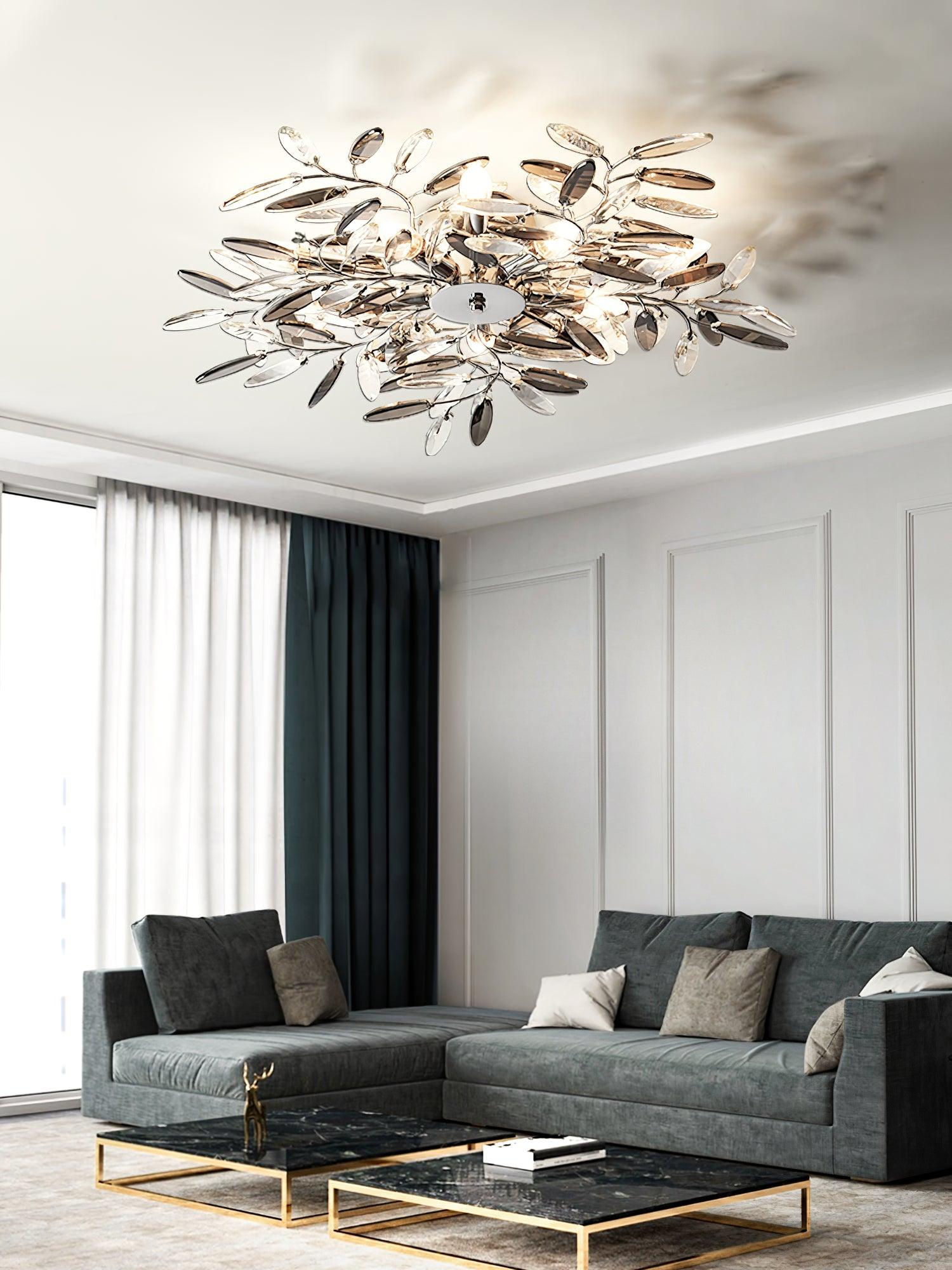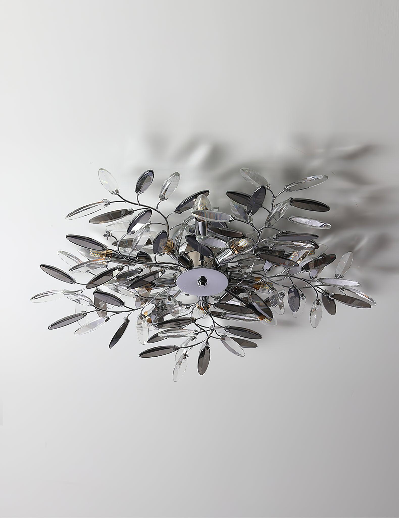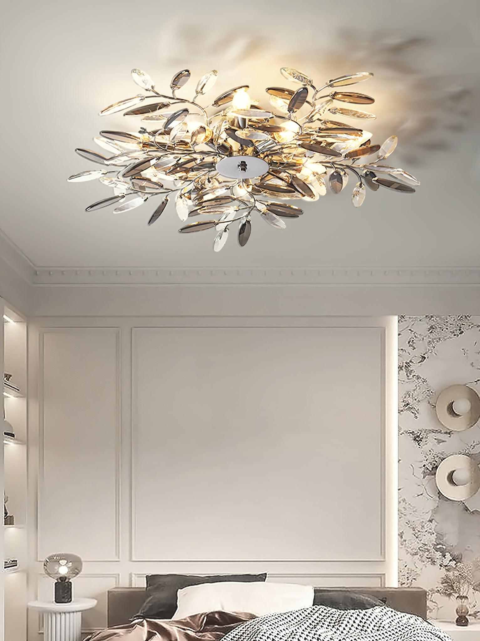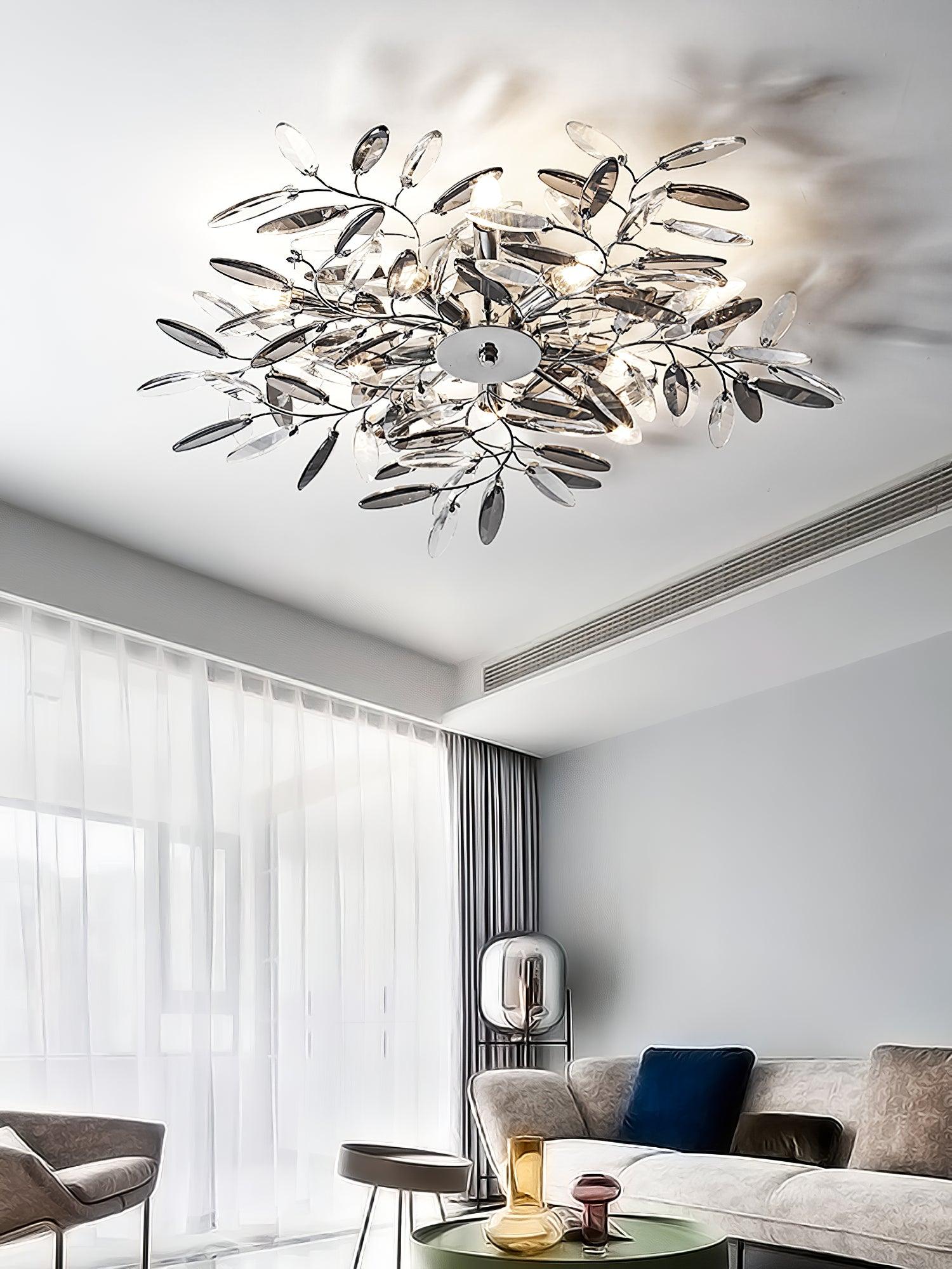 Crislett 系列的靈感來自冬季森林的輪廓,擁抱樹枝的曲折。在這些樹枝的末端是大量大尺寸的水晶“花蕾”,在這款四燈半嵌裝天花板燈具的日光鍍鉻飾面中增添了冬日般的光彩。