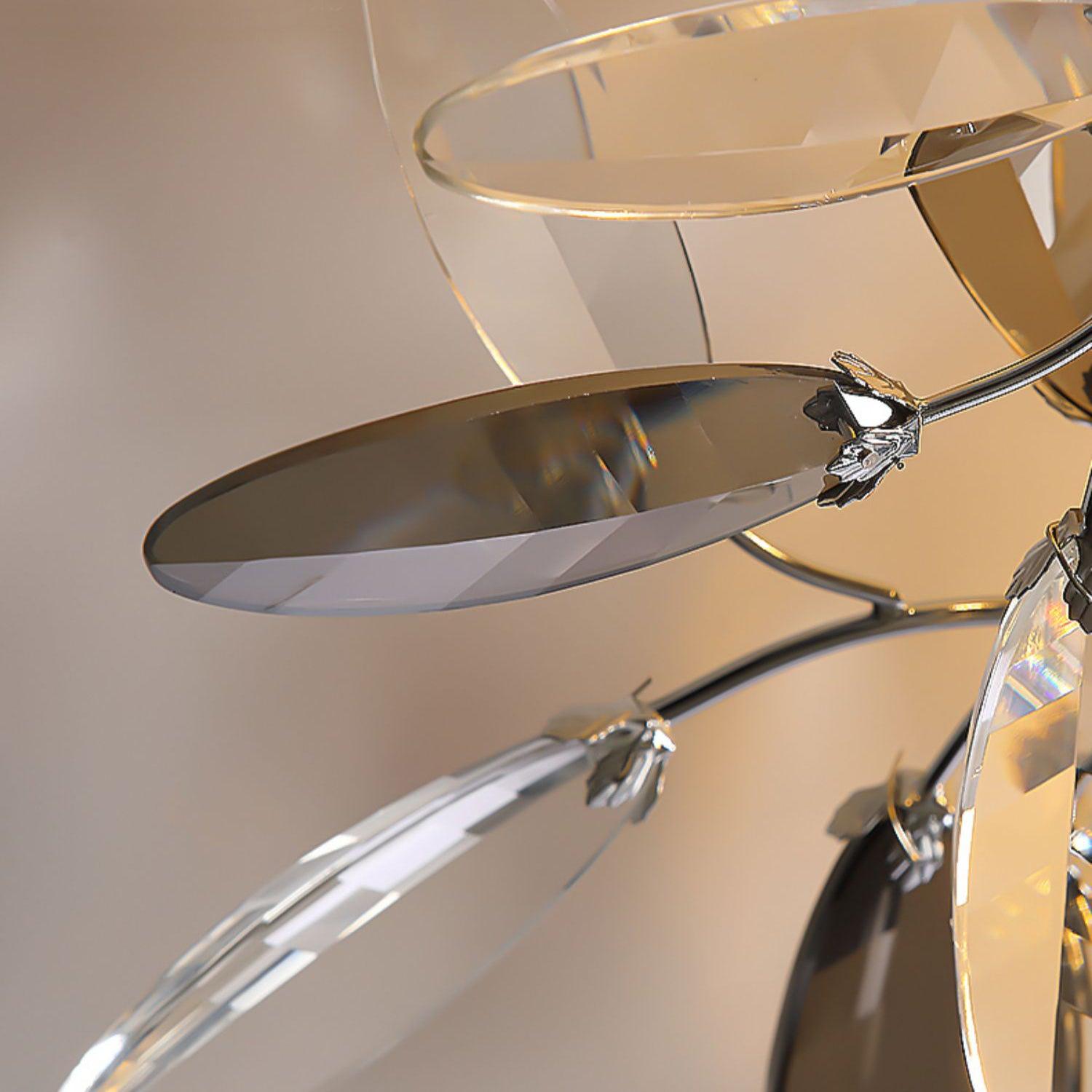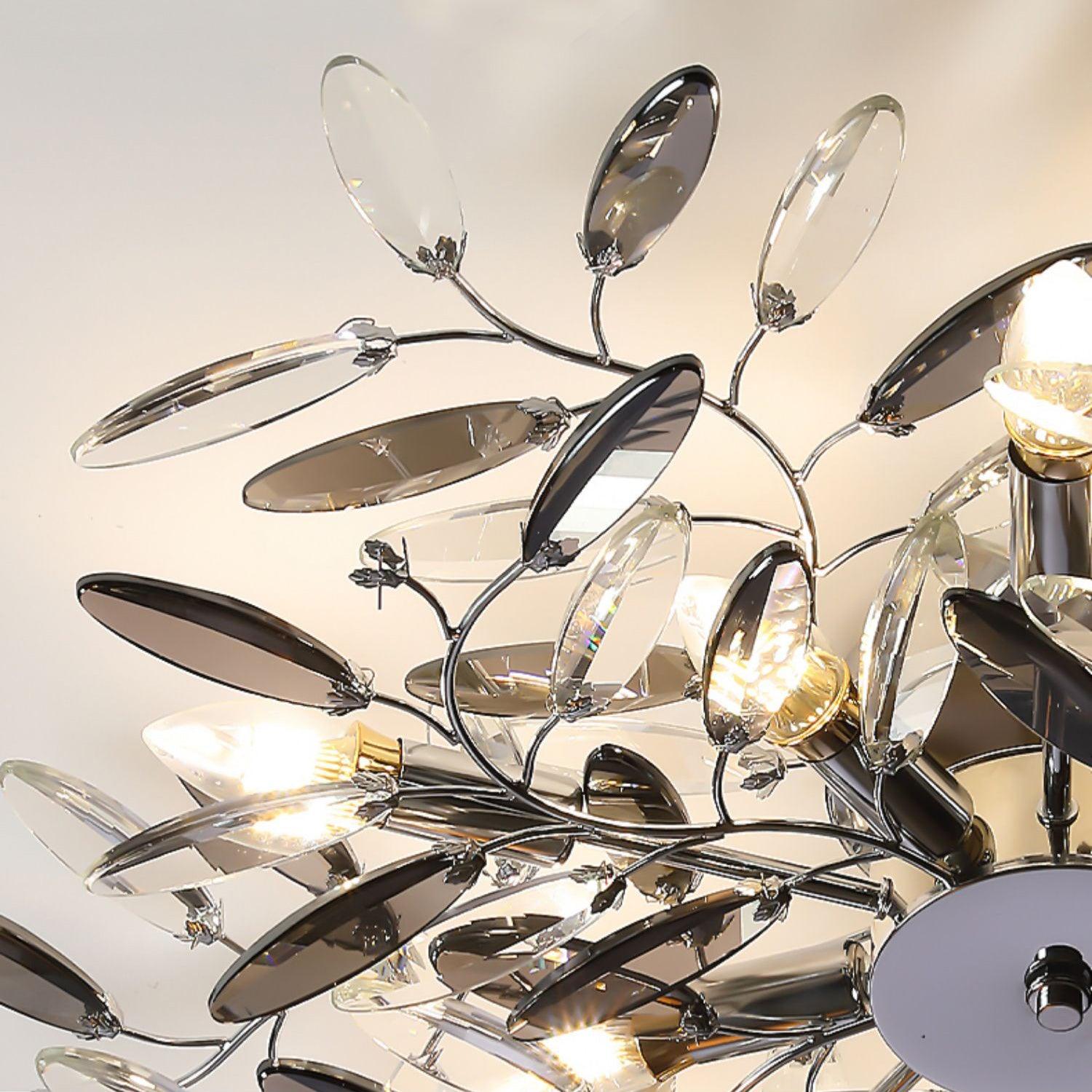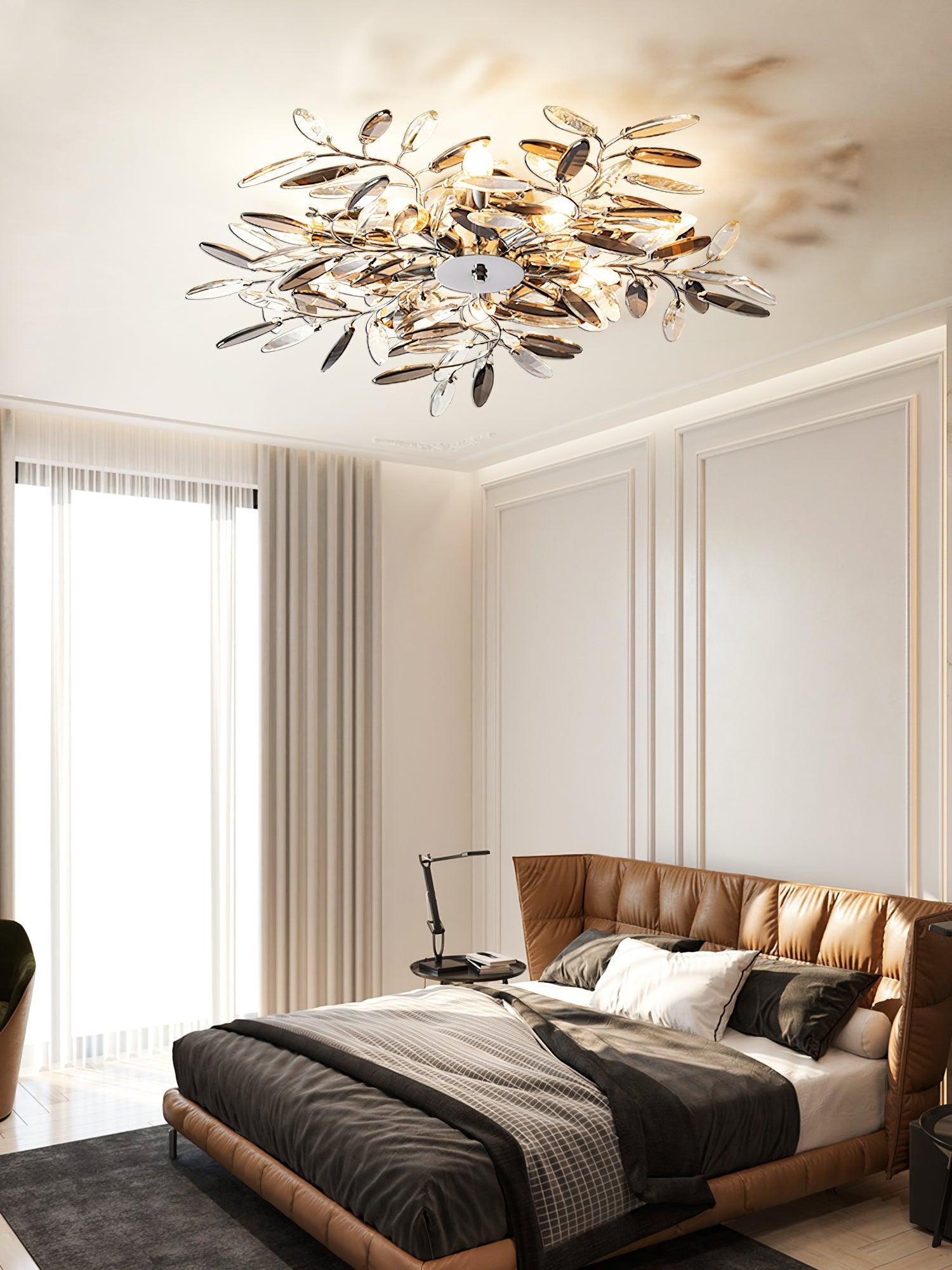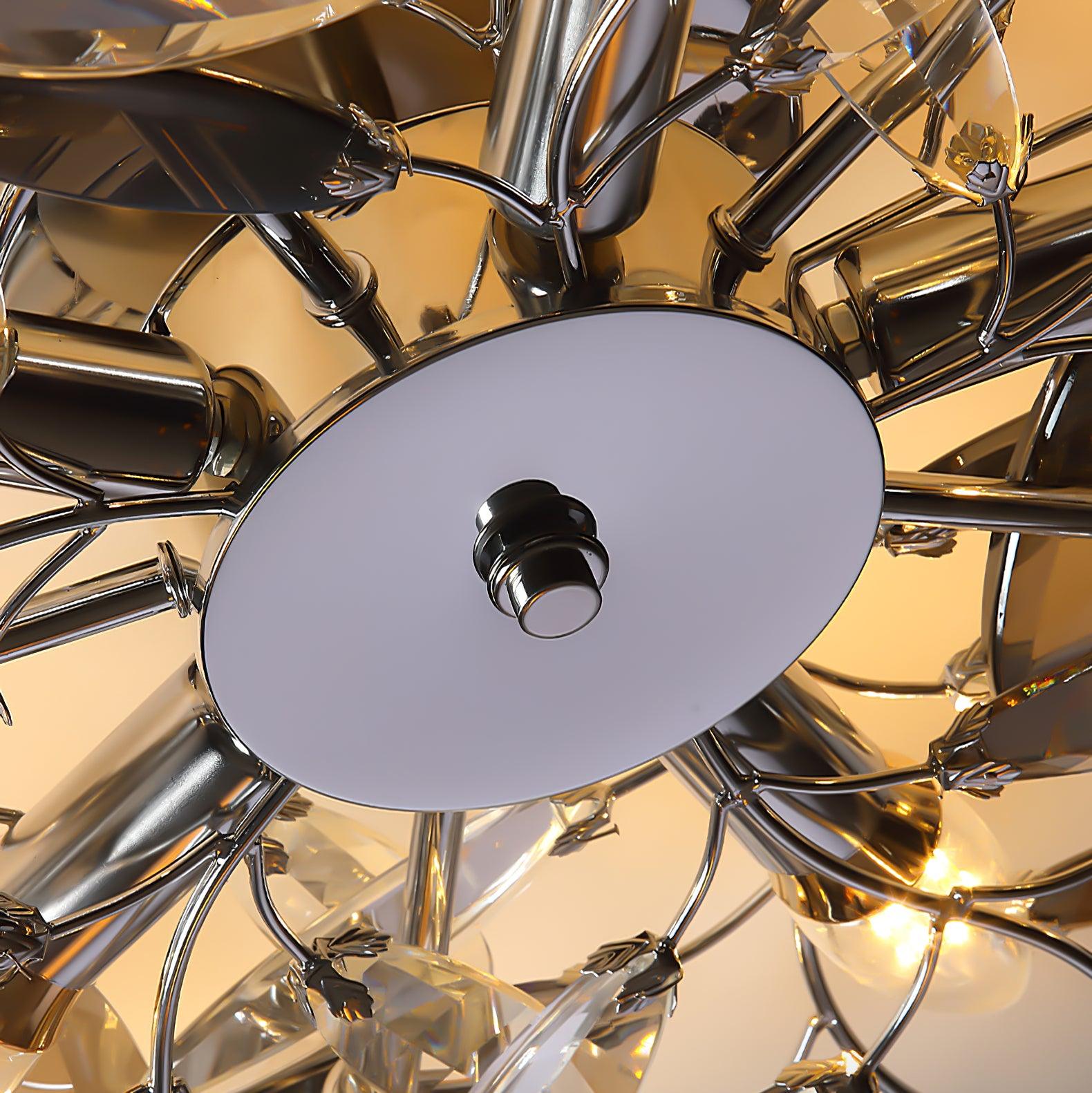 Crislett 系列的靈感來自冬季森林的輪廓,擁抱樹枝的曲折。在這些樹枝的末端是大量大尺寸的水晶“花蕾”,在這款四燈半嵌裝天花板燈具的日光鍍鉻飾面中增添了冬日般的光彩。