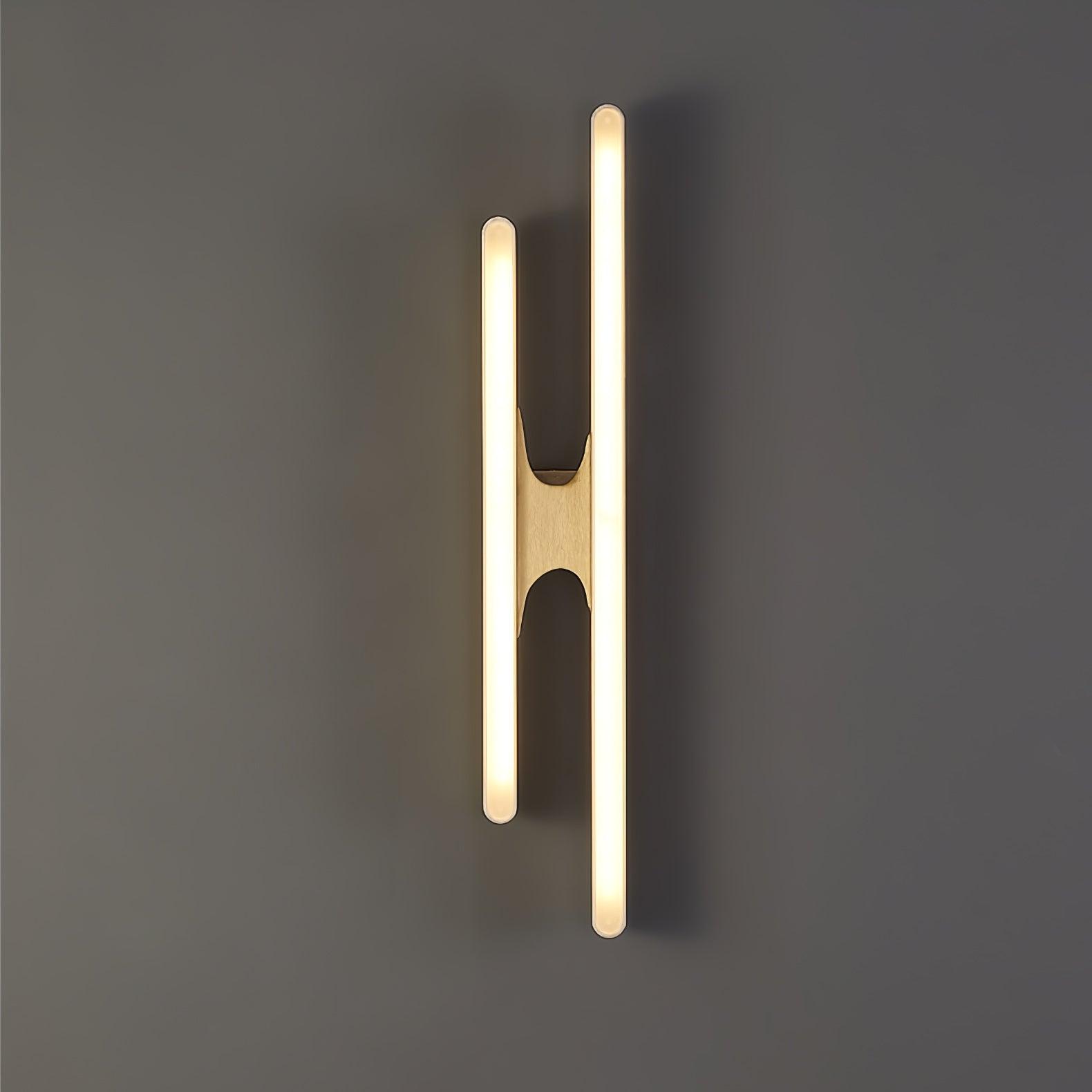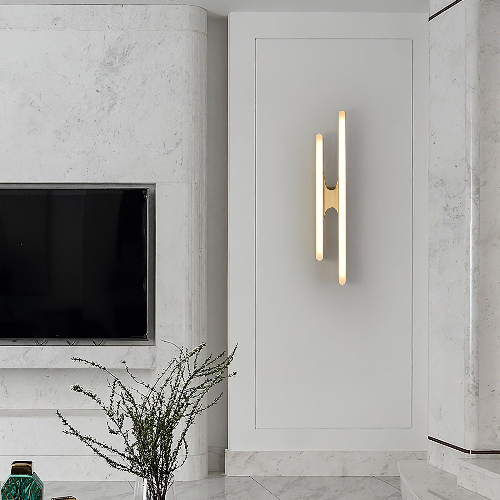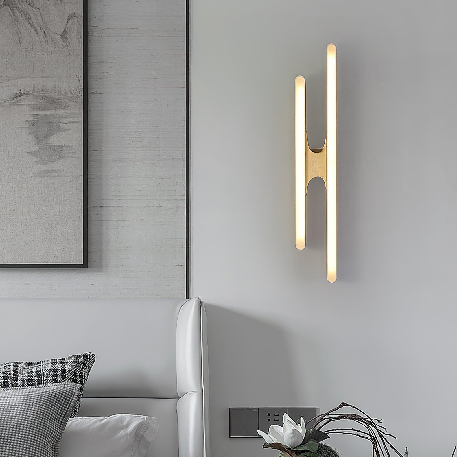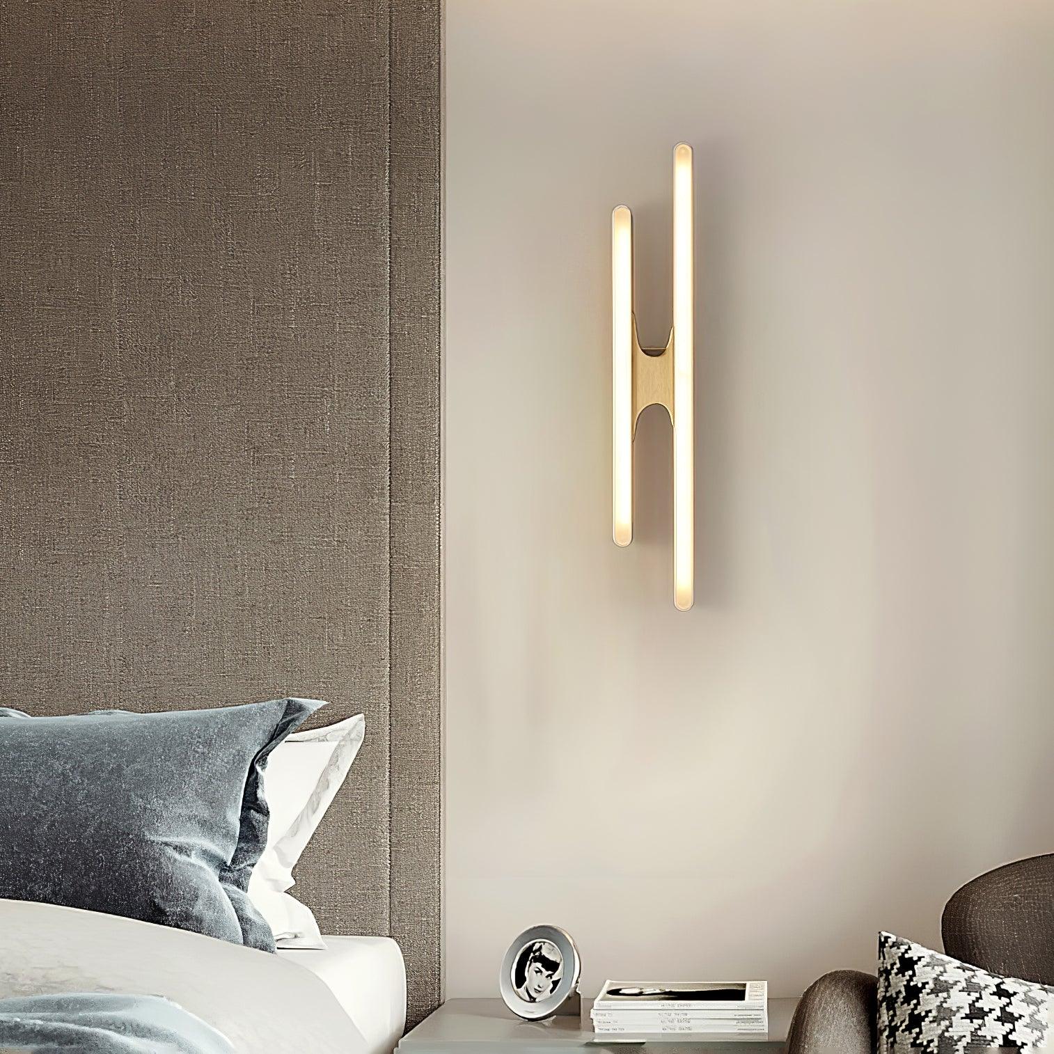 時尚別緻的外觀 2 燈壁燈。從矩形底座的兩側對稱連接分佈的1短1長管結構。亞克力管就在燈的中央。酷炫的設計使它不僅是一盞燈,也是不亮燈時的裝飾品。