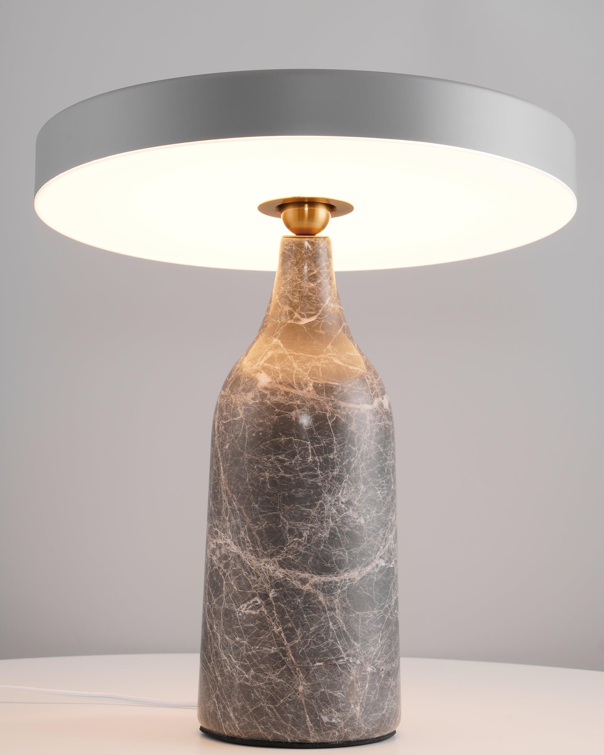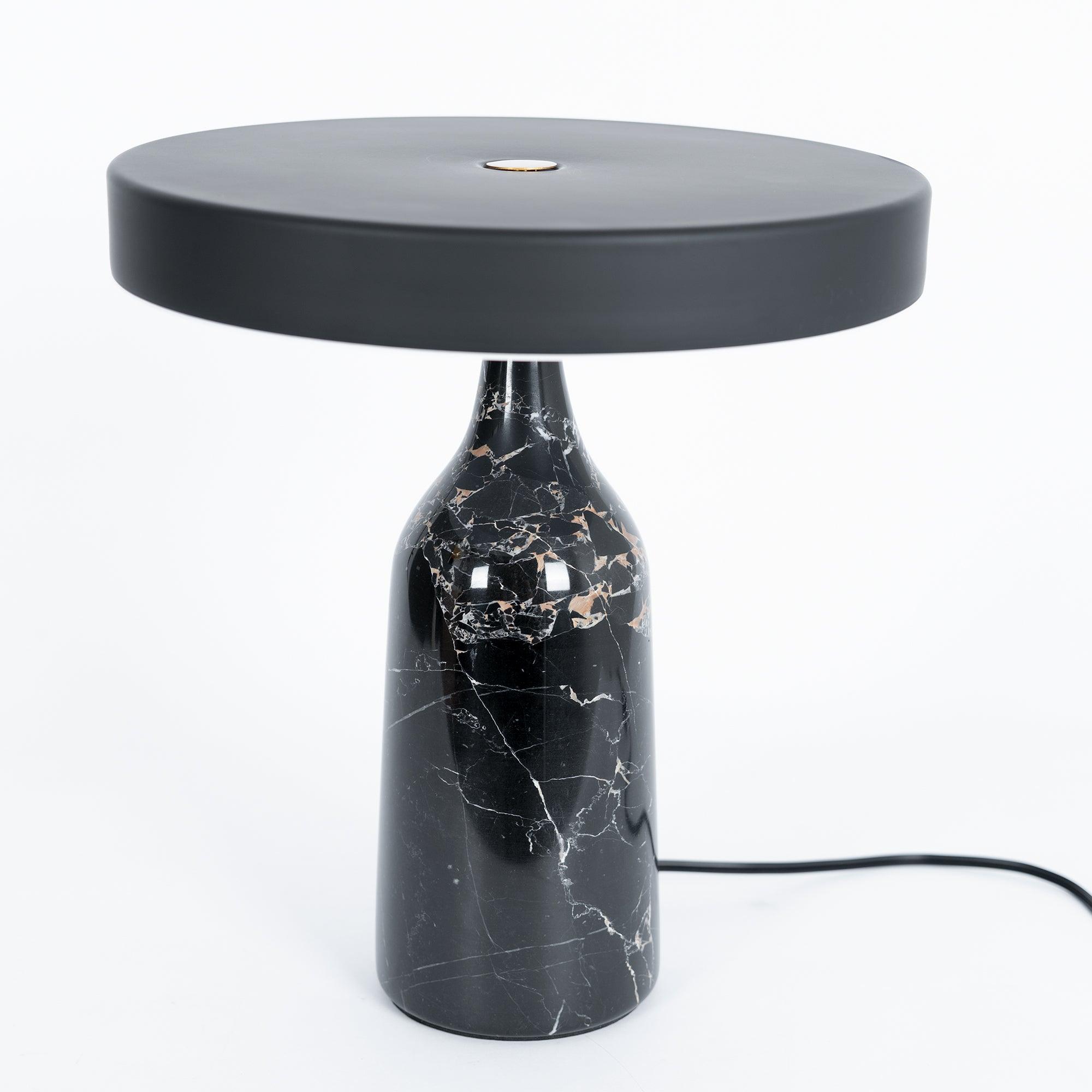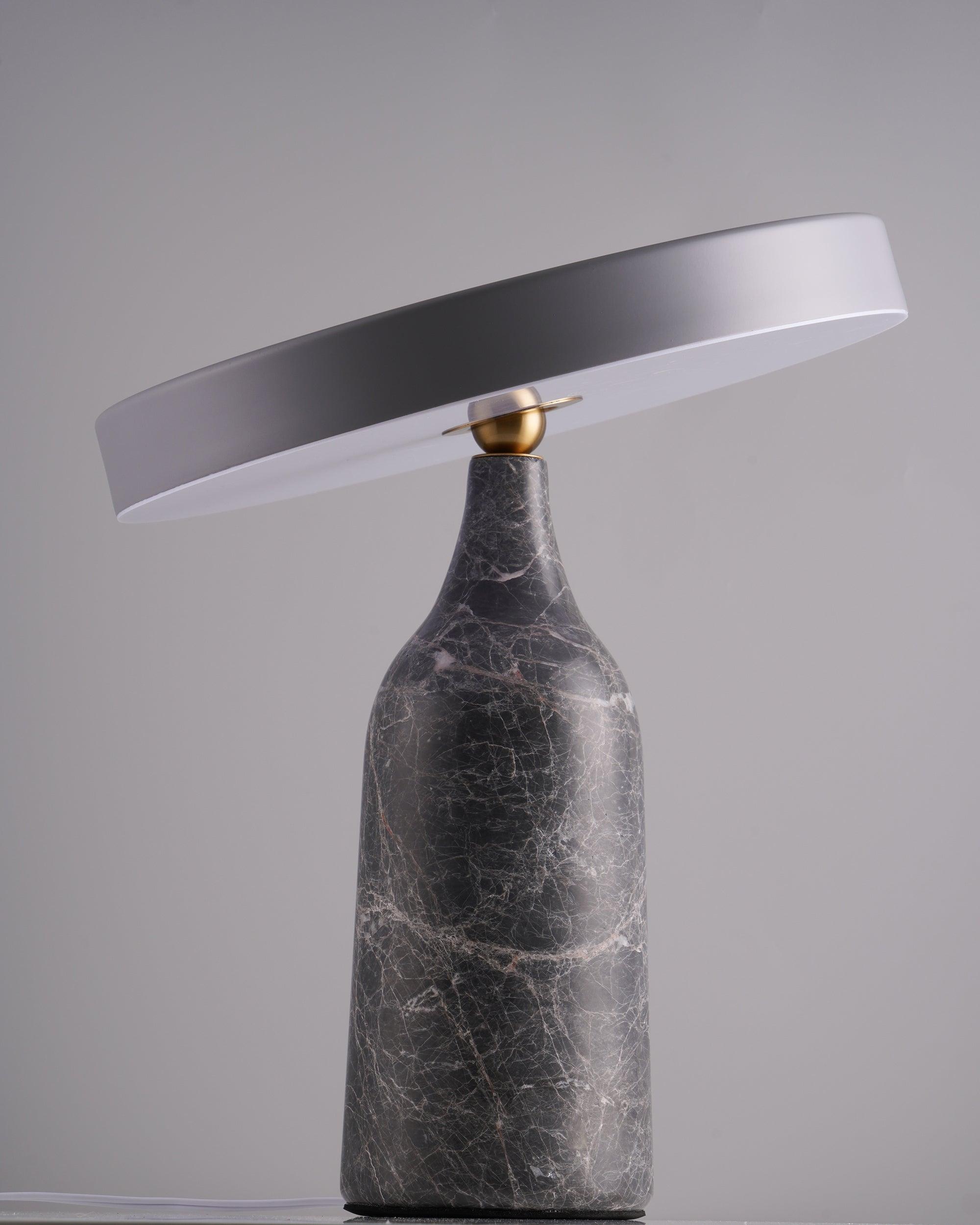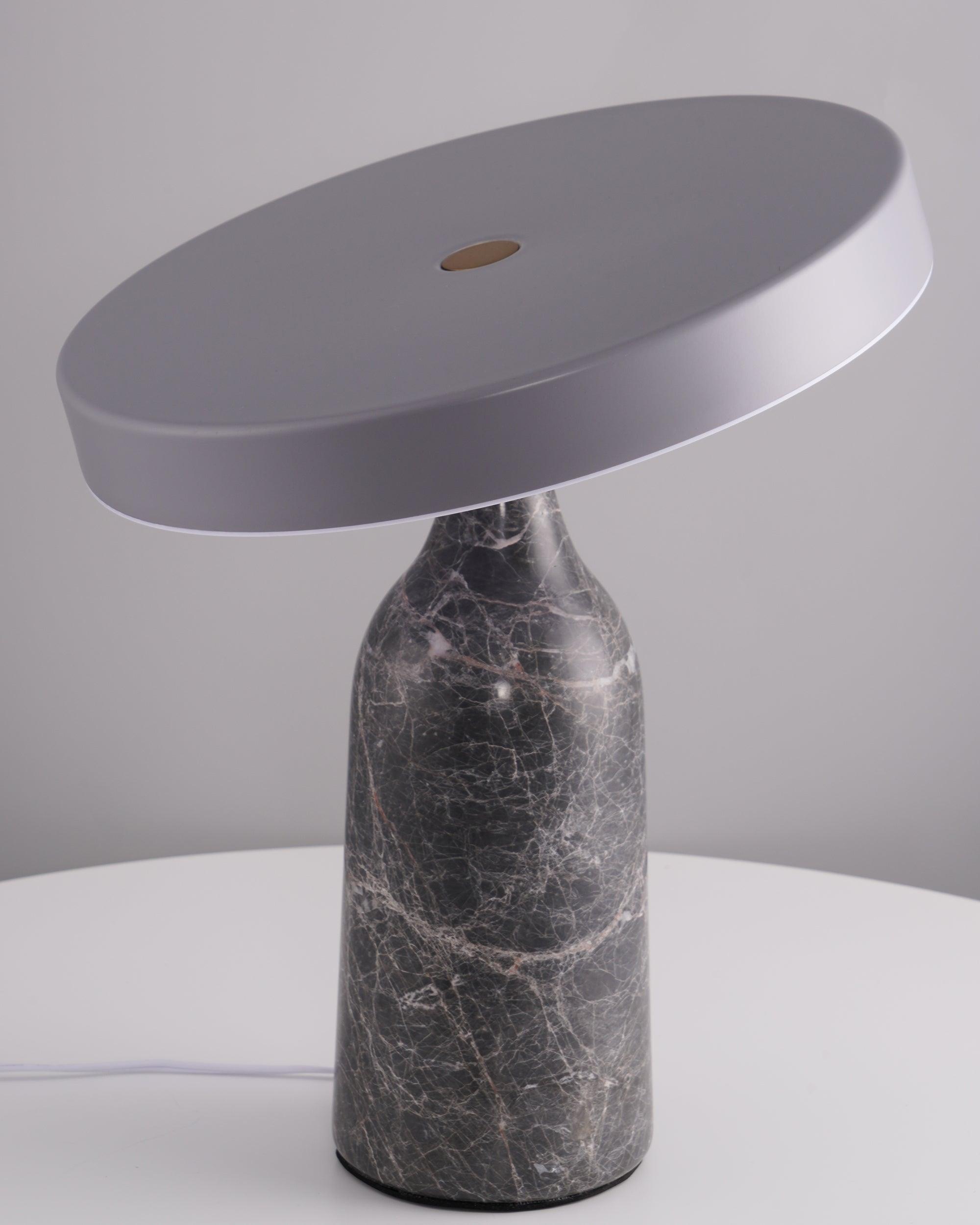 檯燈由帶有集成 LED 光源的鋼製屏幕和由手工打磨的大理石製成的燈座組成。燈罩和底座在一個旋轉點相遇:一個金屬球,燈罩可以圍繞它傾斜以控制光線的方向。燈罩頂部的黃銅調光器。織物覆蓋的繩索。