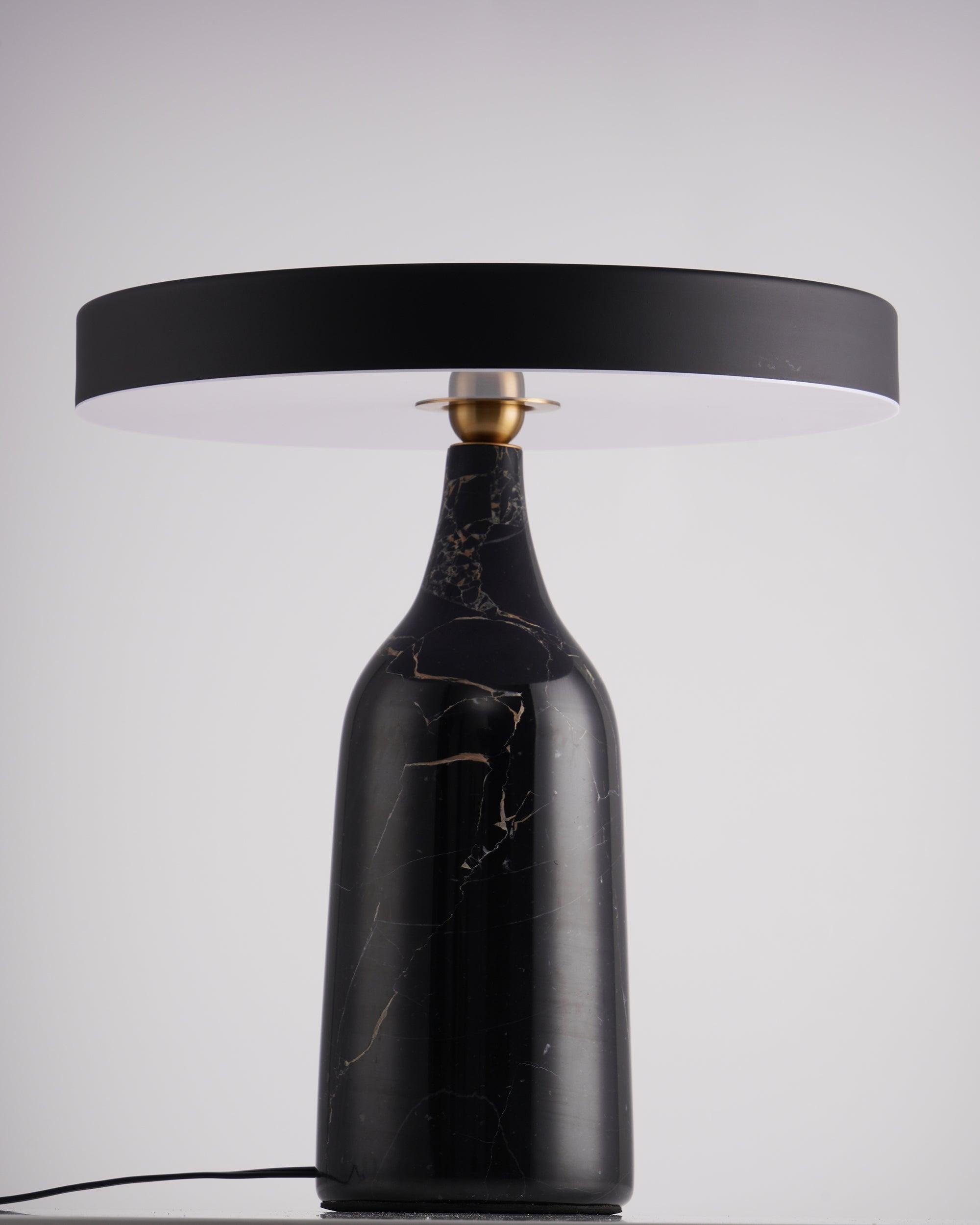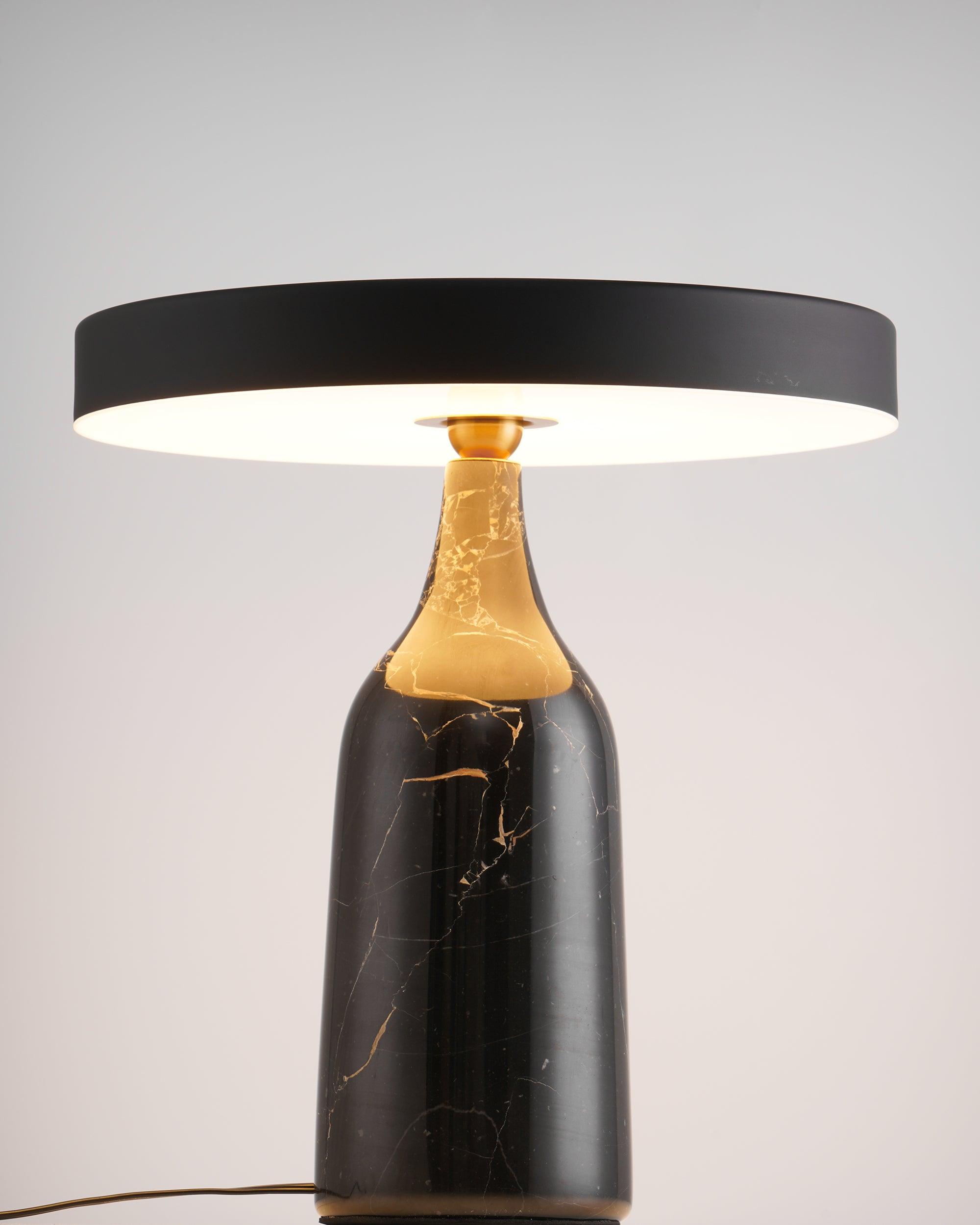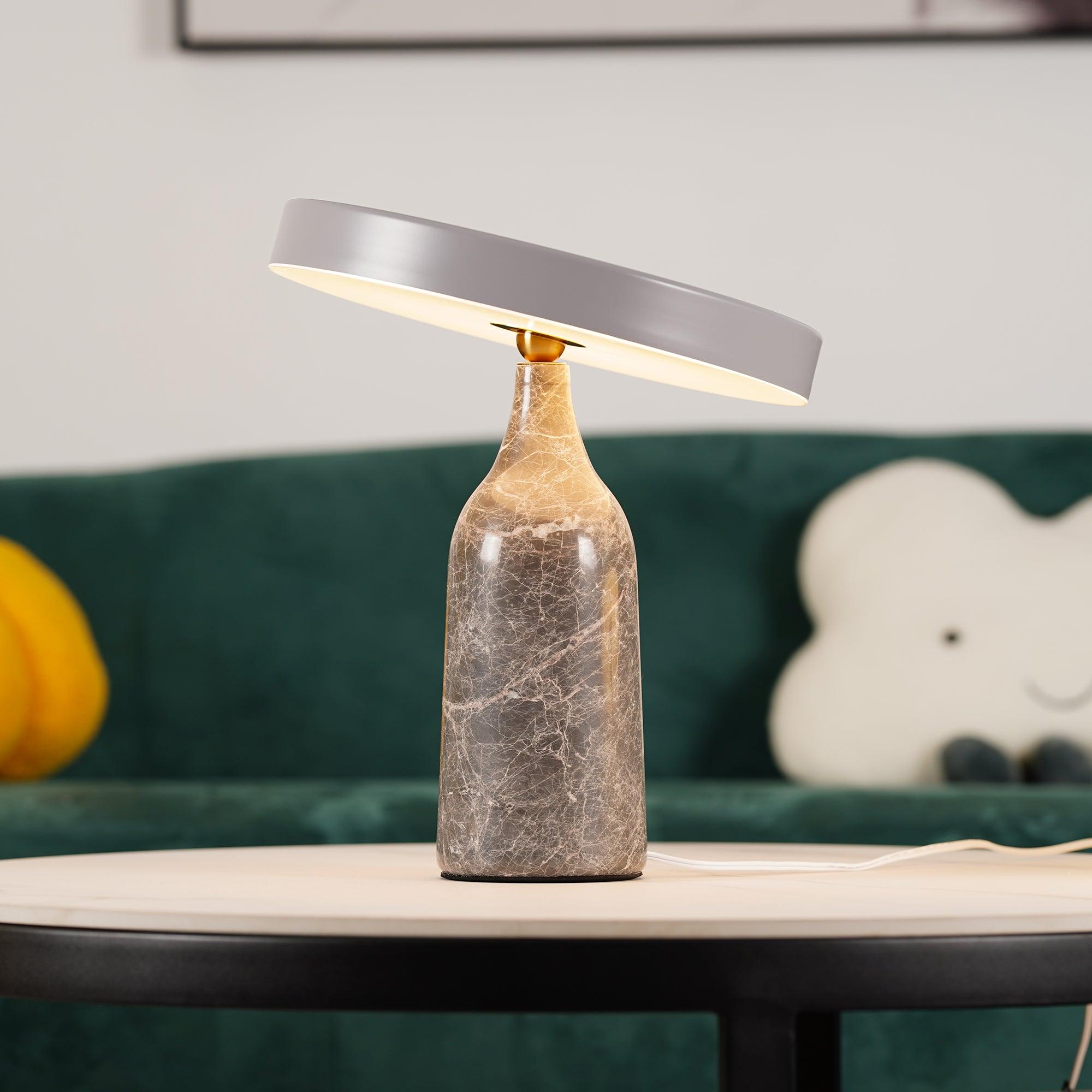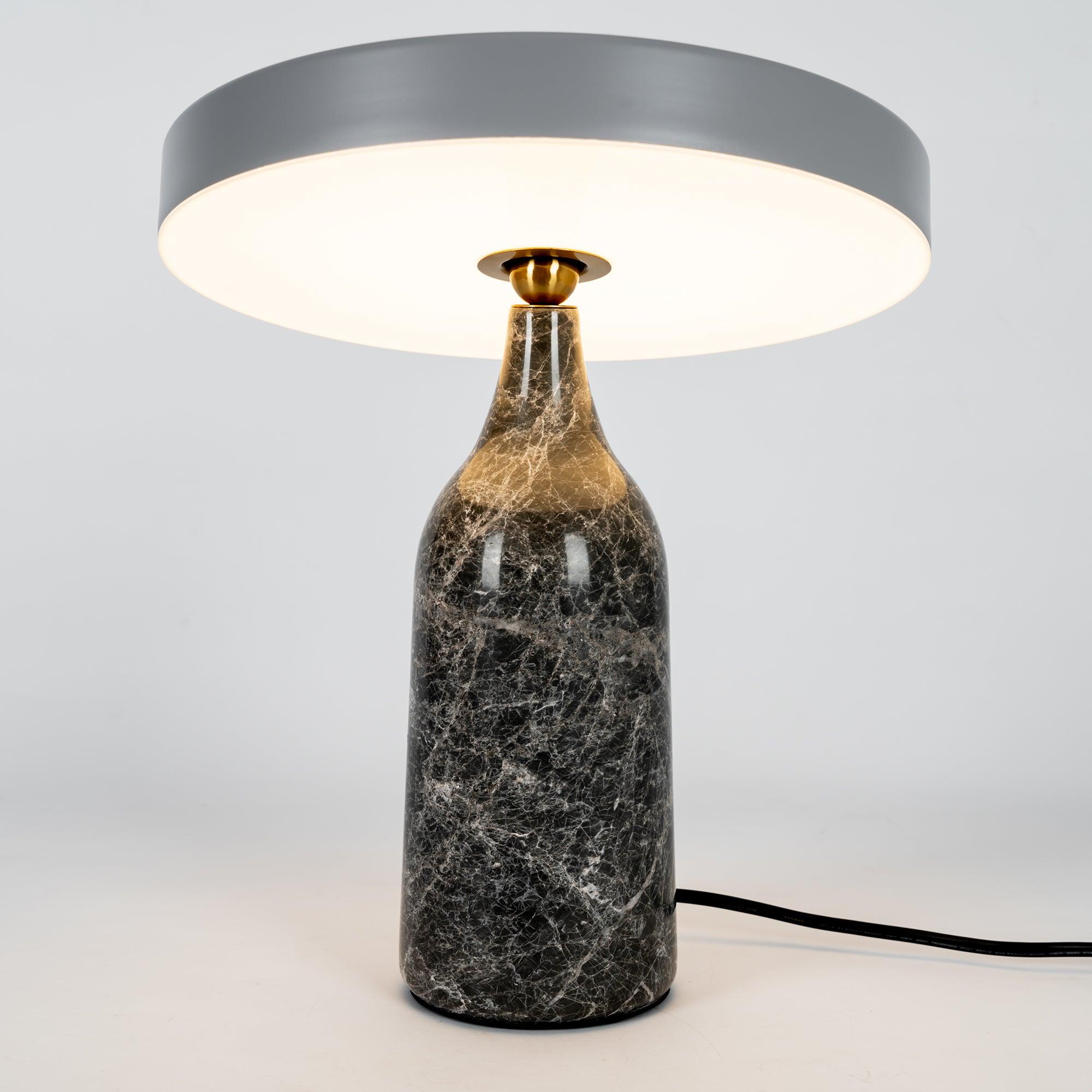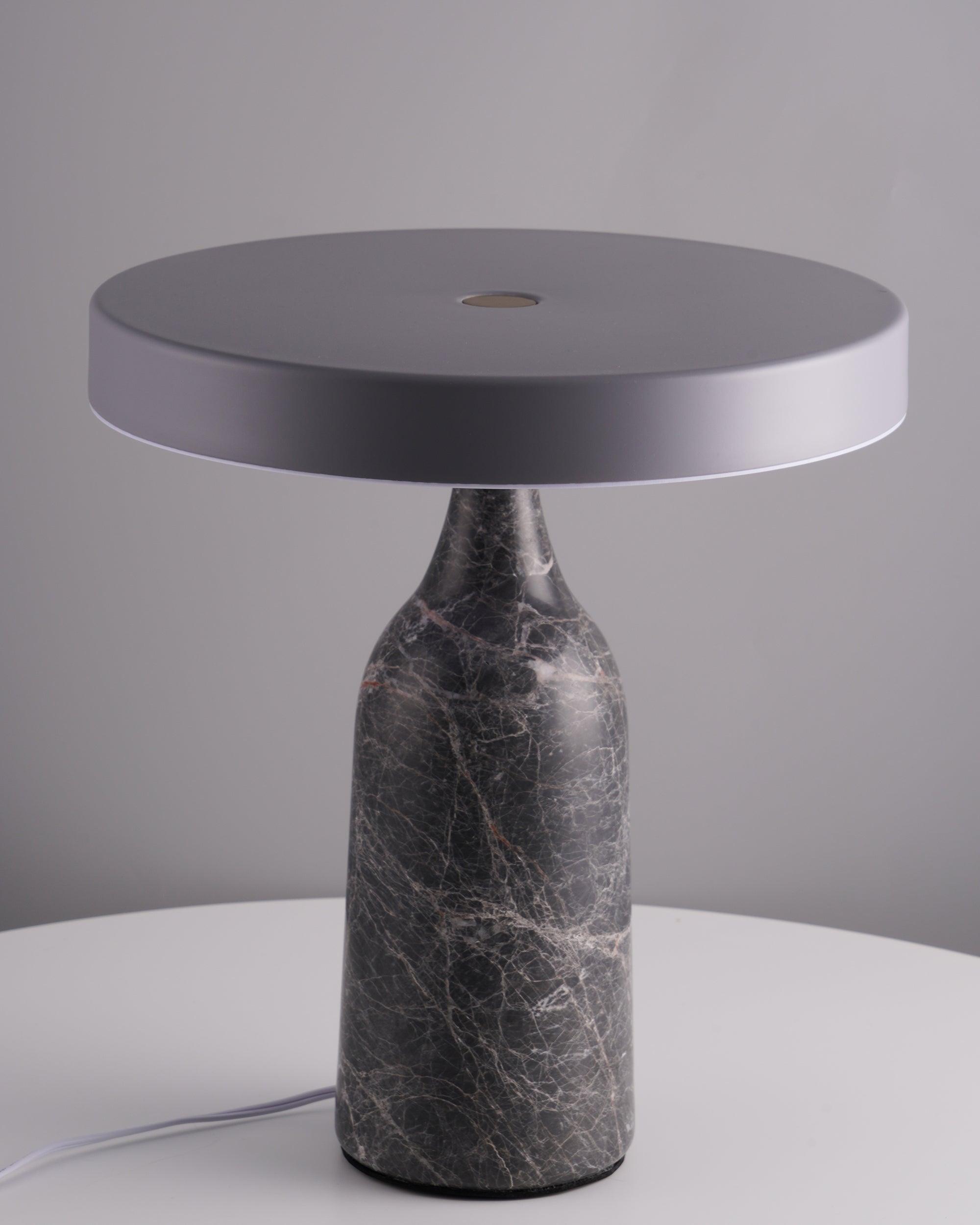 檯燈由帶有集成 LED 光源的鋼製屏幕和由手工打磨的大理石製成的燈座組成。燈罩和底座在一個旋轉點相遇:一個金屬球,燈罩可以圍繞它傾斜以控制光線的方向。燈罩頂部的黃銅調光器。織物覆蓋的繩索。