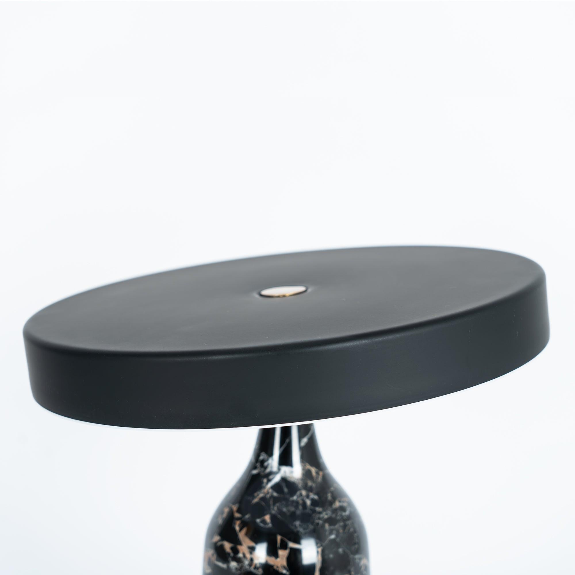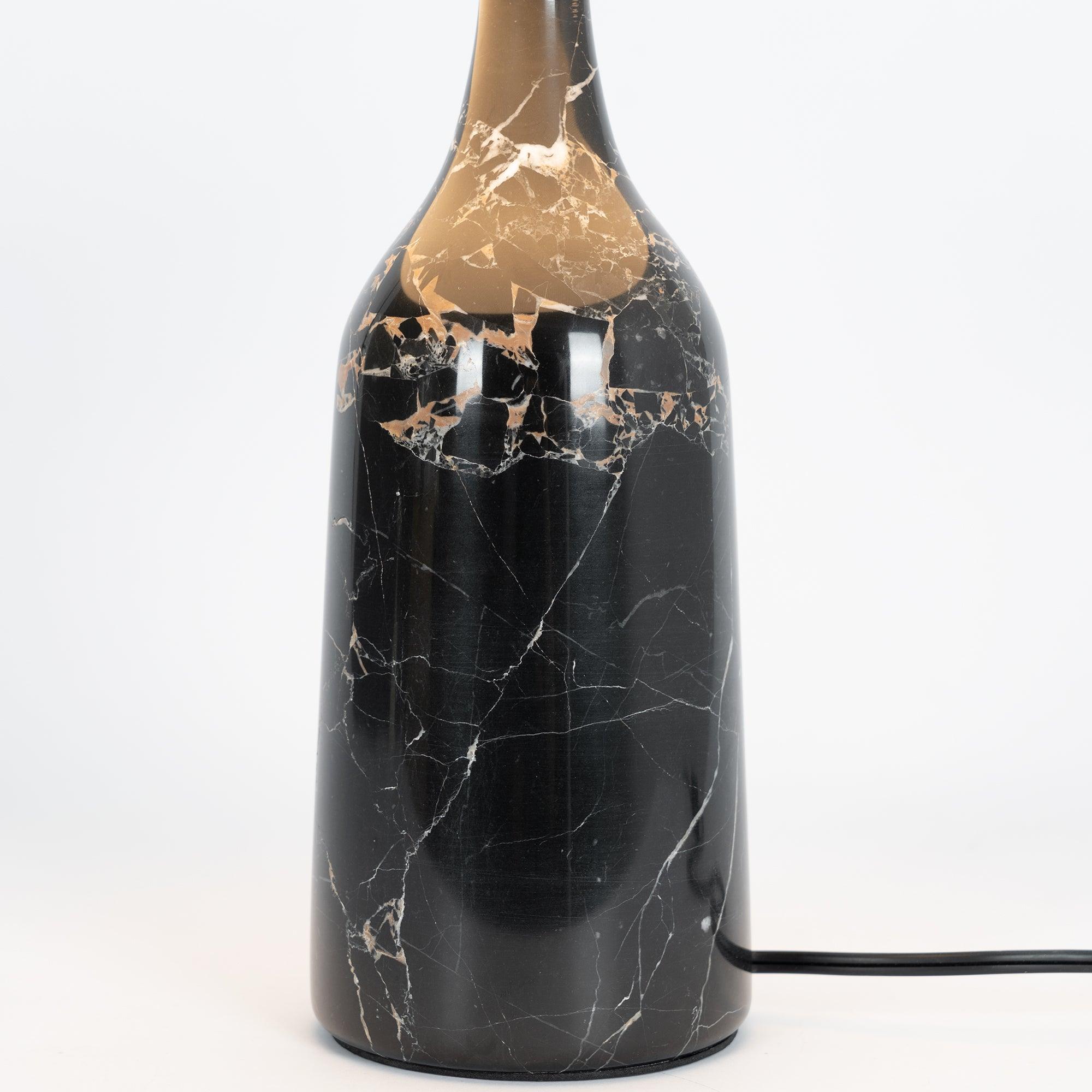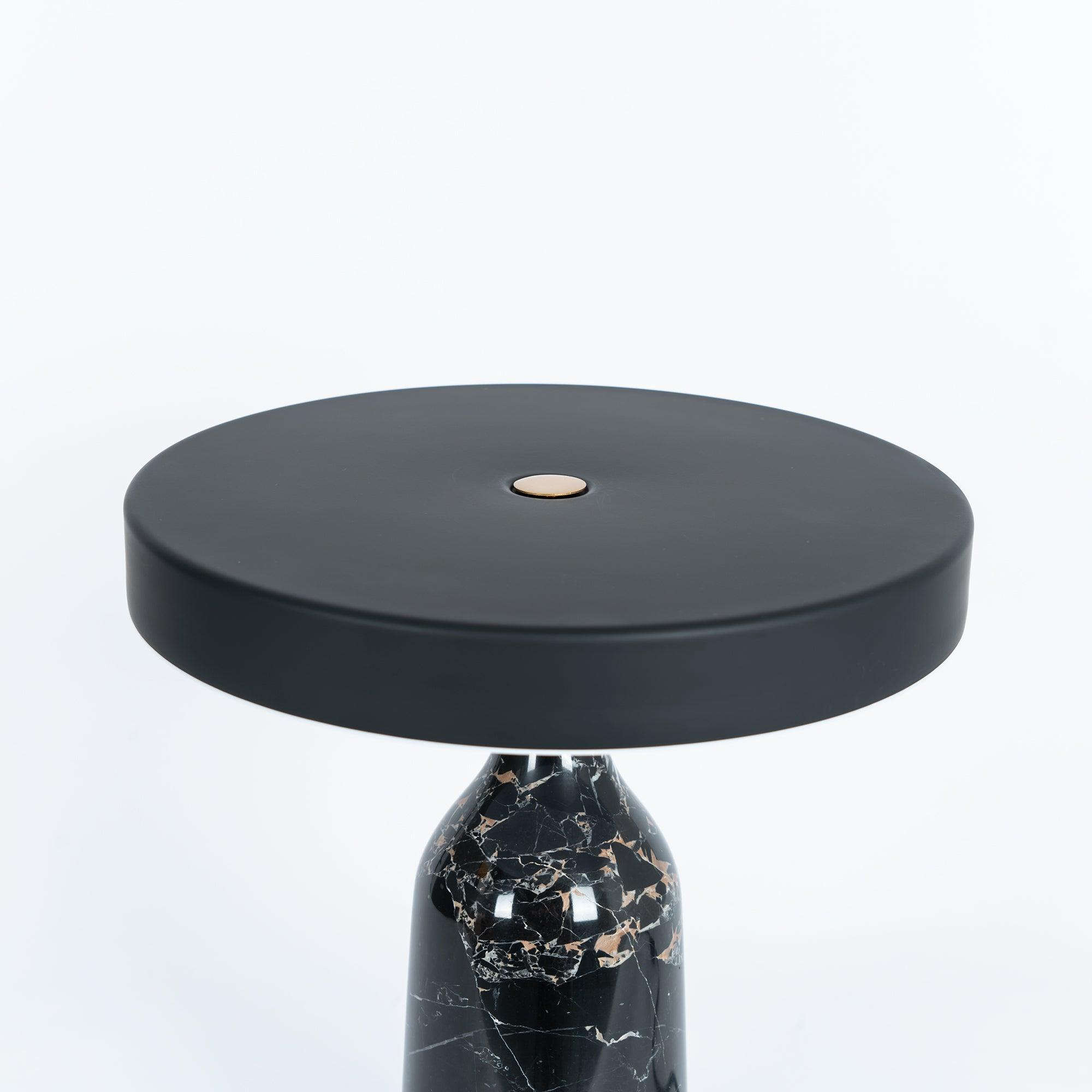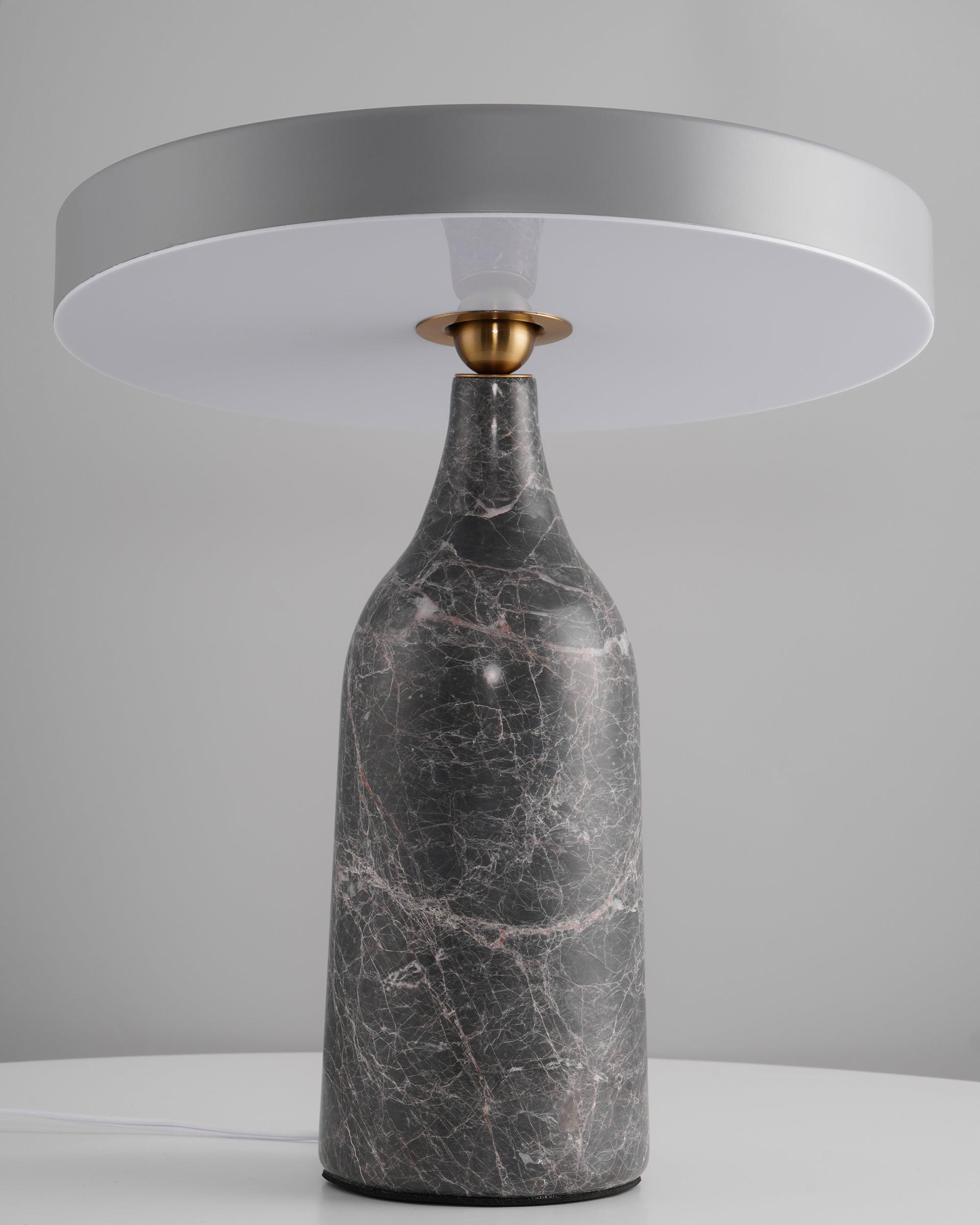 檯燈由帶有集成 LED 光源的鋼製屏幕和由手工打磨的大理石製成的燈座組成。燈罩和底座在一個旋轉點相遇:一個金屬球,燈罩可以圍繞它傾斜以控制光線的方向。燈罩頂部的黃銅調光器。織物覆蓋的繩索。
