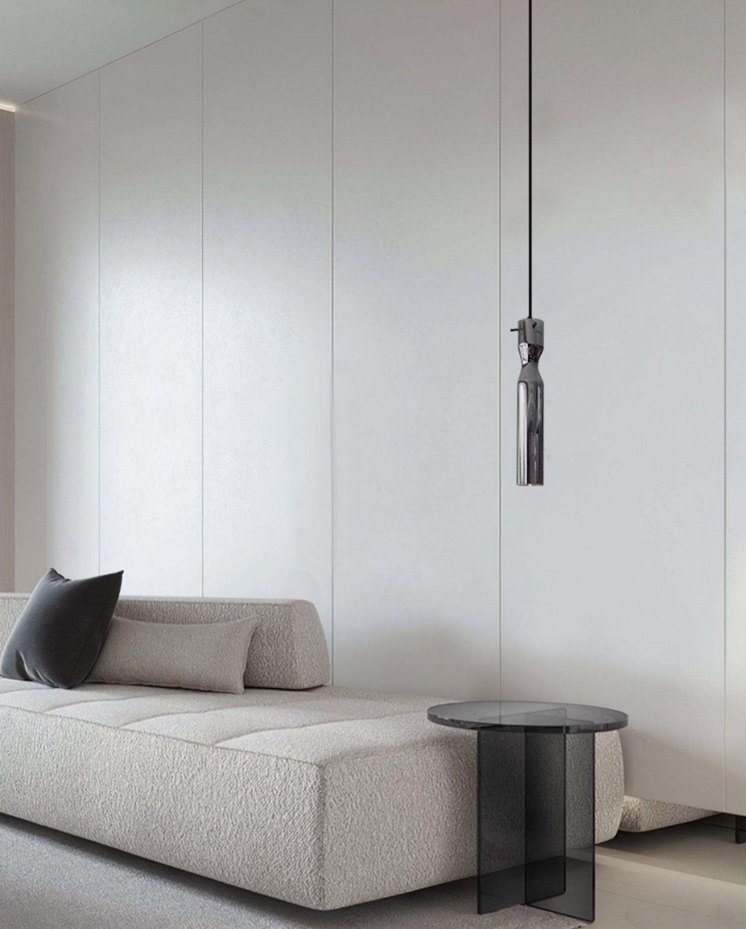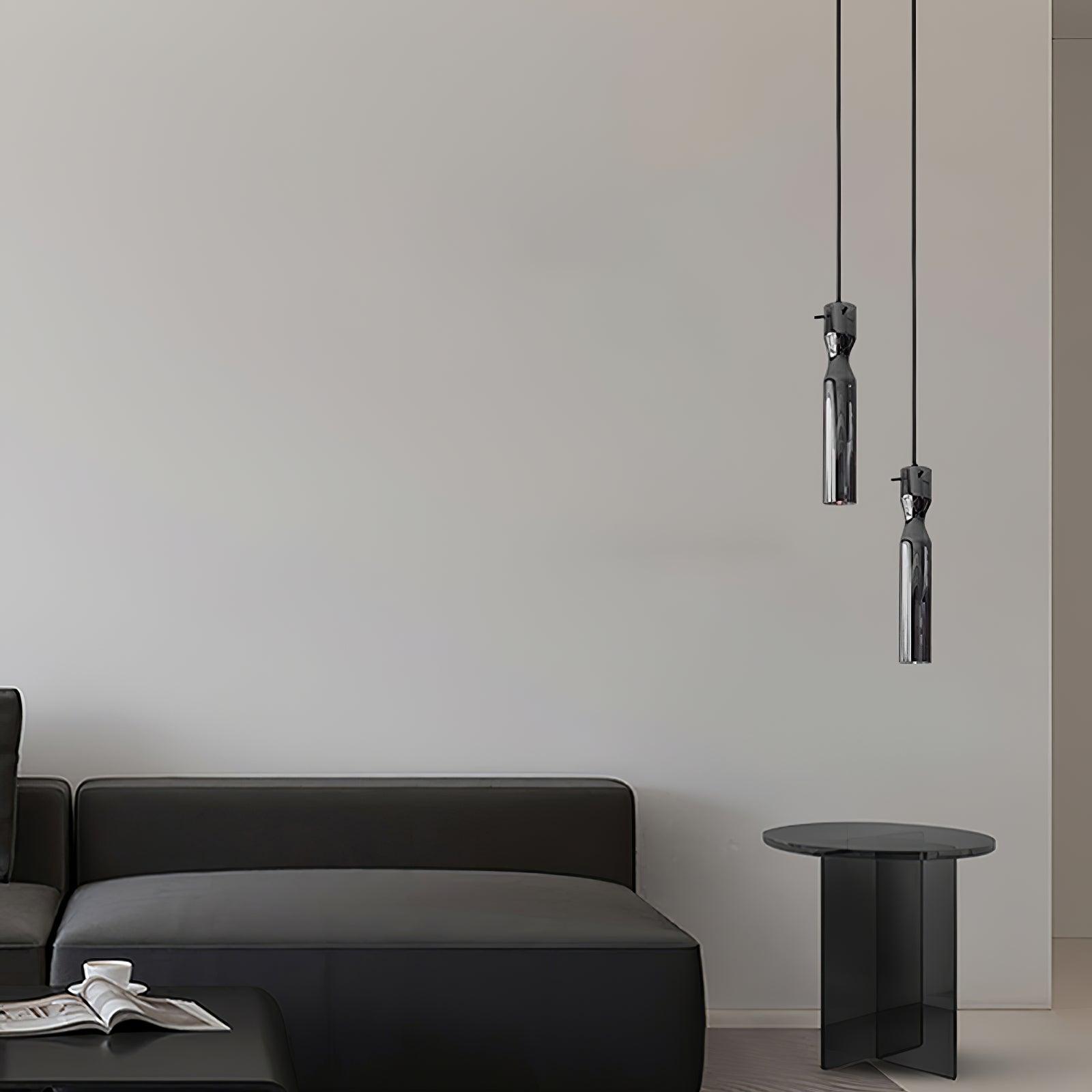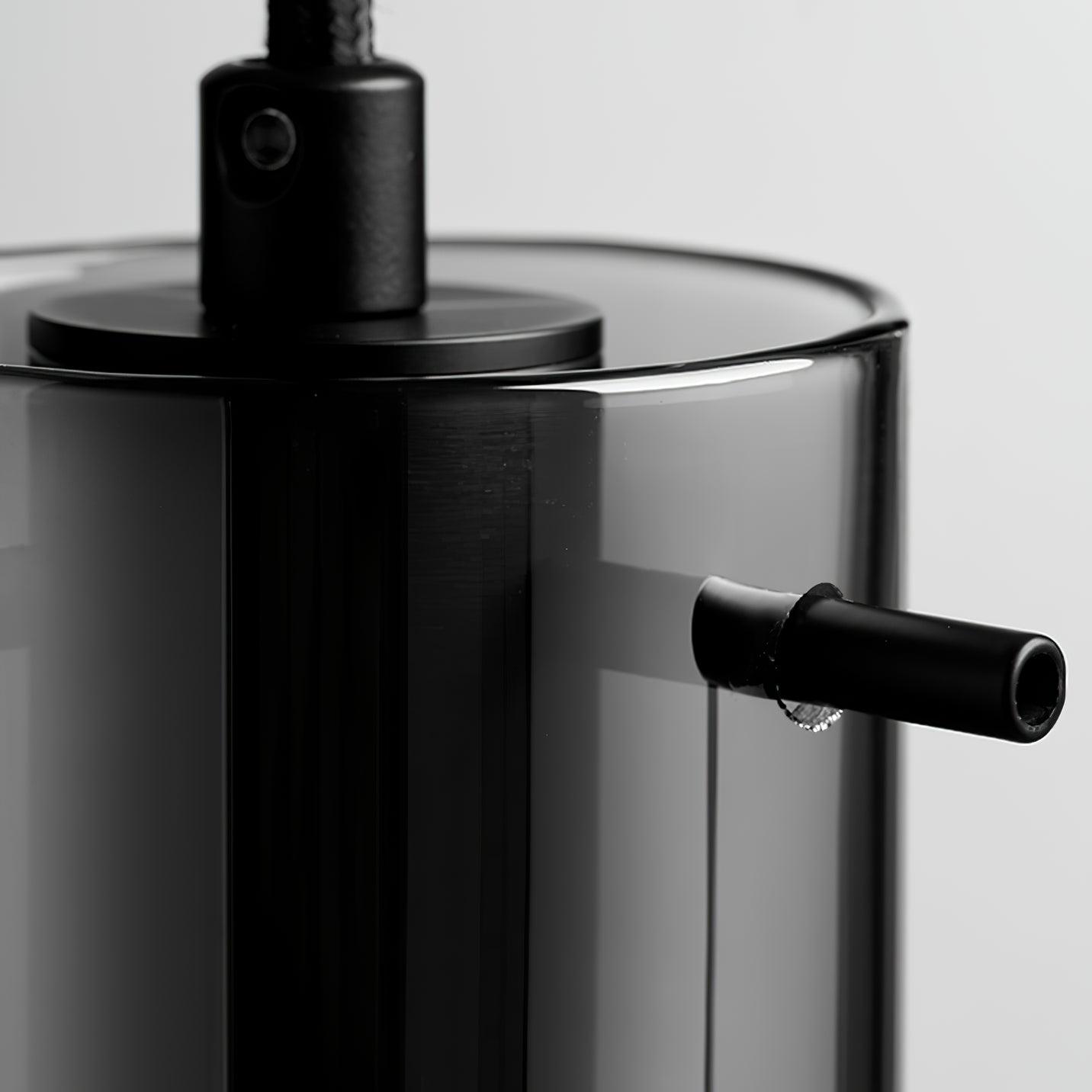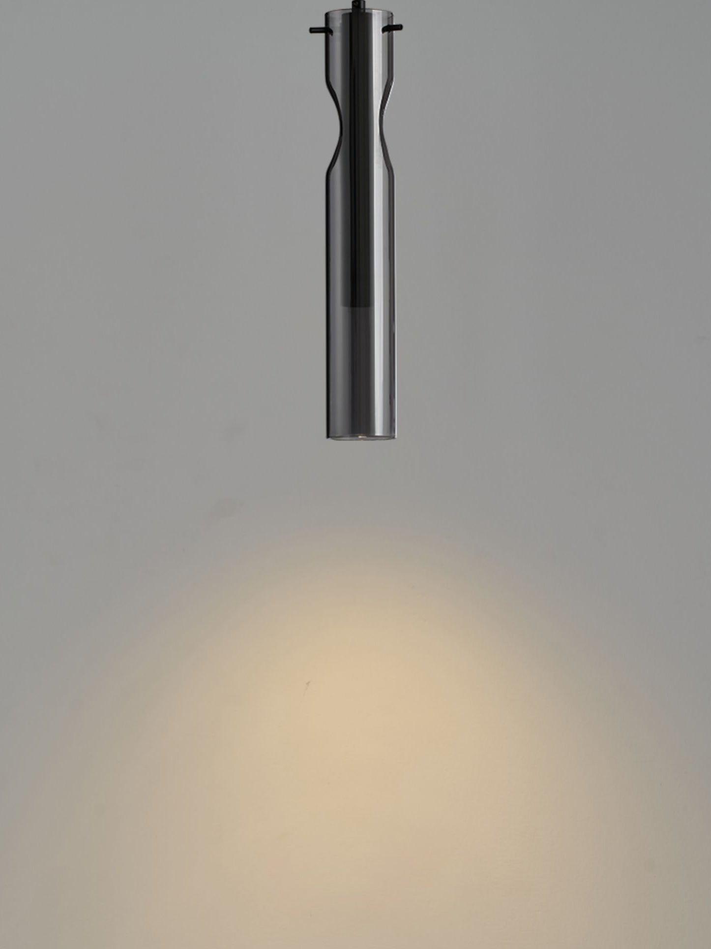 時尚現代的單吊墜,採用圓柱形玻璃和不尋常的捲邊設計。玻璃是半透明的黑色,可以讓光線穿過,也可以透過玻璃看到燈。