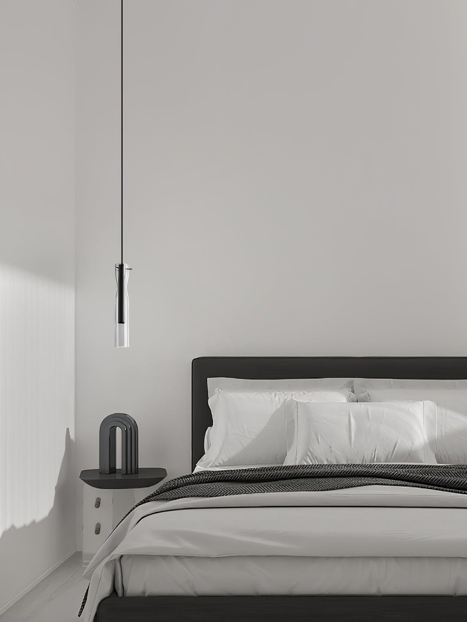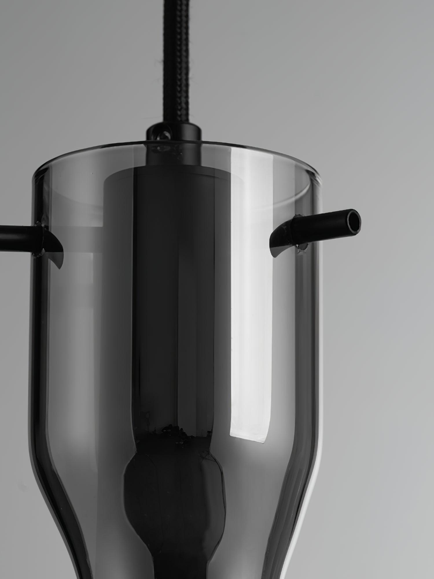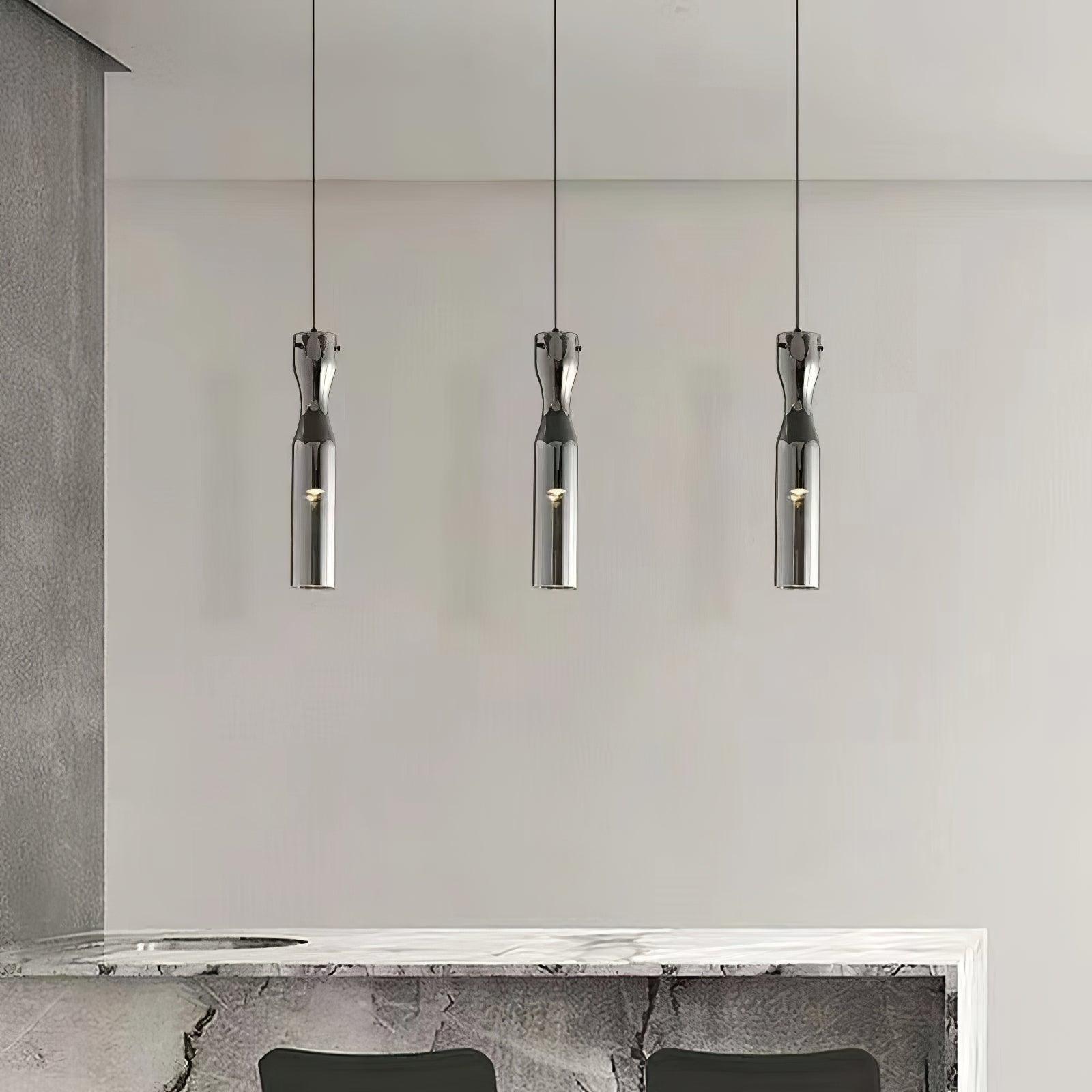 時尚現代的單吊墜,採用圓柱形玻璃和不尋常的捲邊設計。玻璃是半透明的黑色,可以讓光線穿過,也可以透過玻璃看到燈。