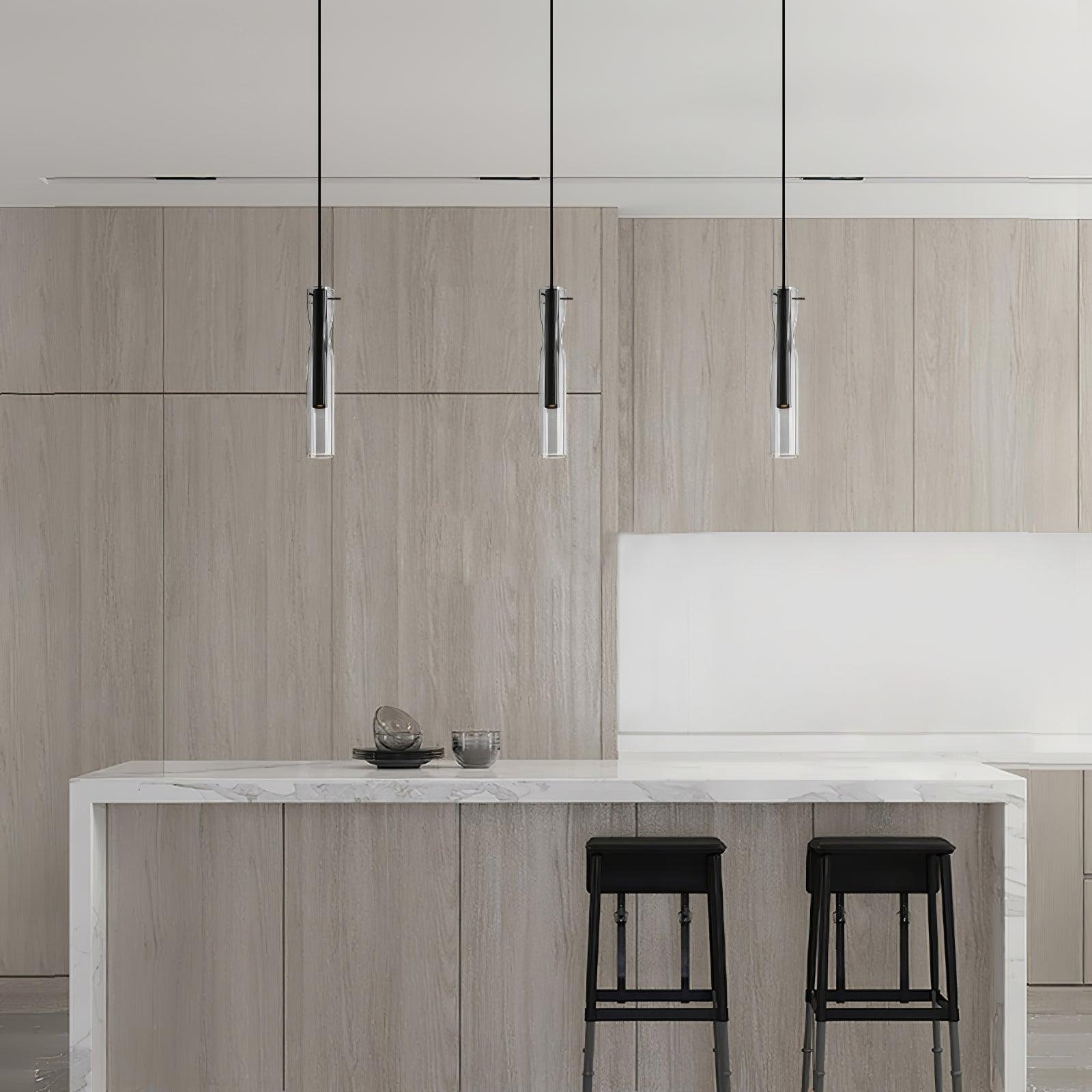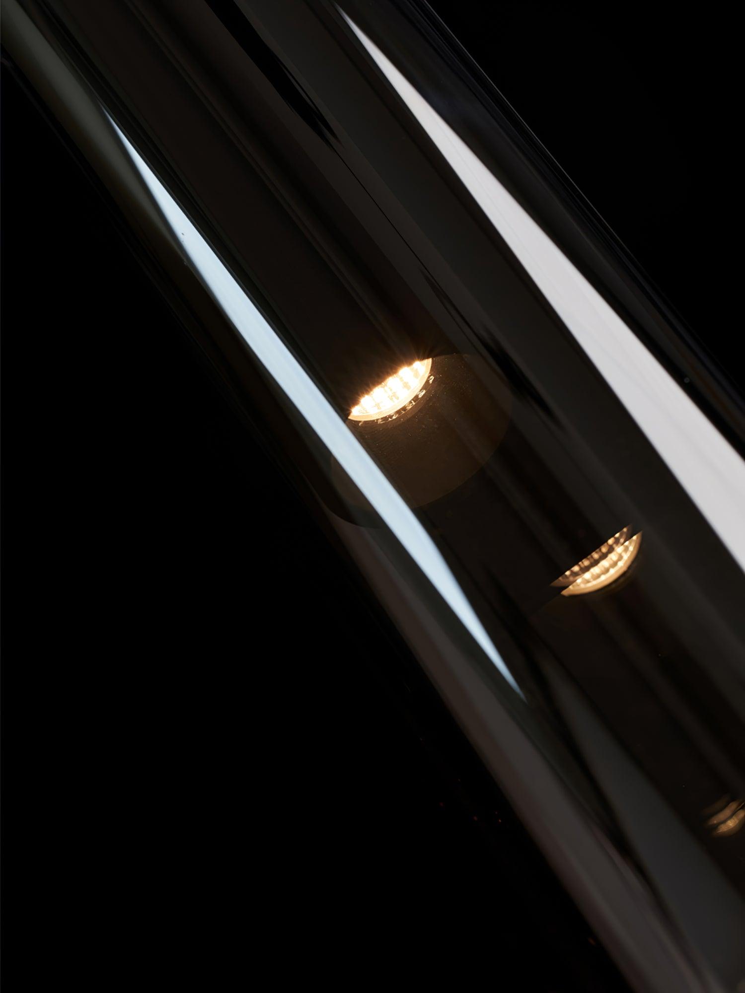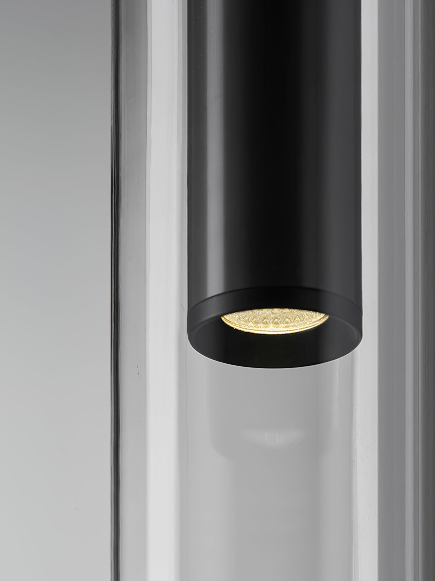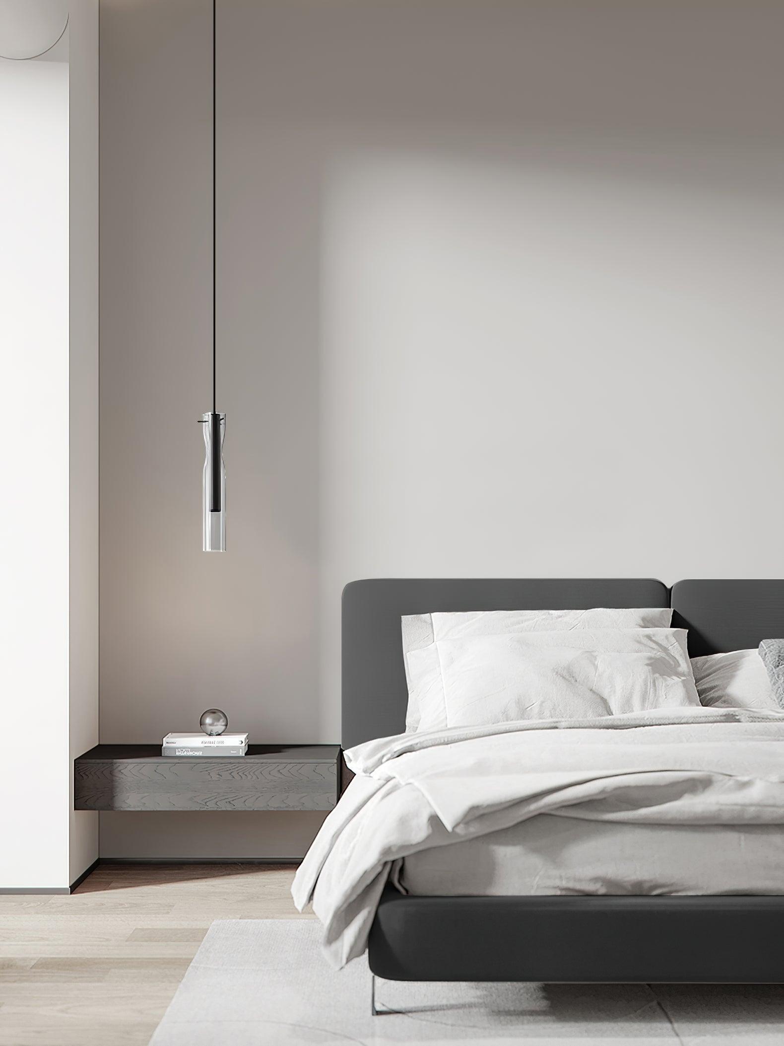 時尚現代的單吊墜,採用圓柱形玻璃和不尋常的捲邊設計。玻璃是半透明的黑色,可以讓光線穿過,也可以透過玻璃看到燈。
