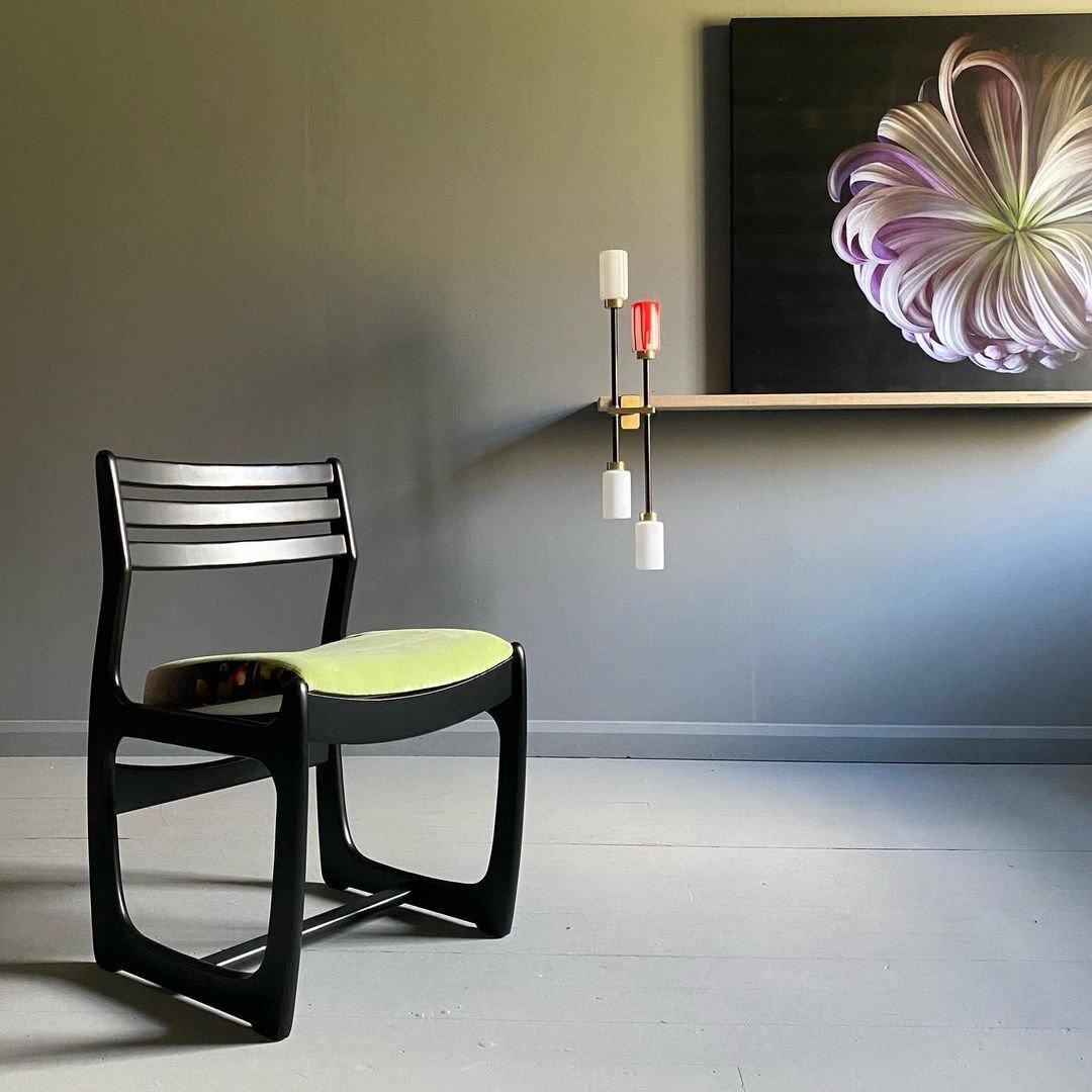 兩條細長的手臂在不對稱的高度設置了四個圓柱形玻璃燈罩。以黃銅和青銅製成。提供蛋白石或煙熏玻璃燈罩以及左手或右手版本。