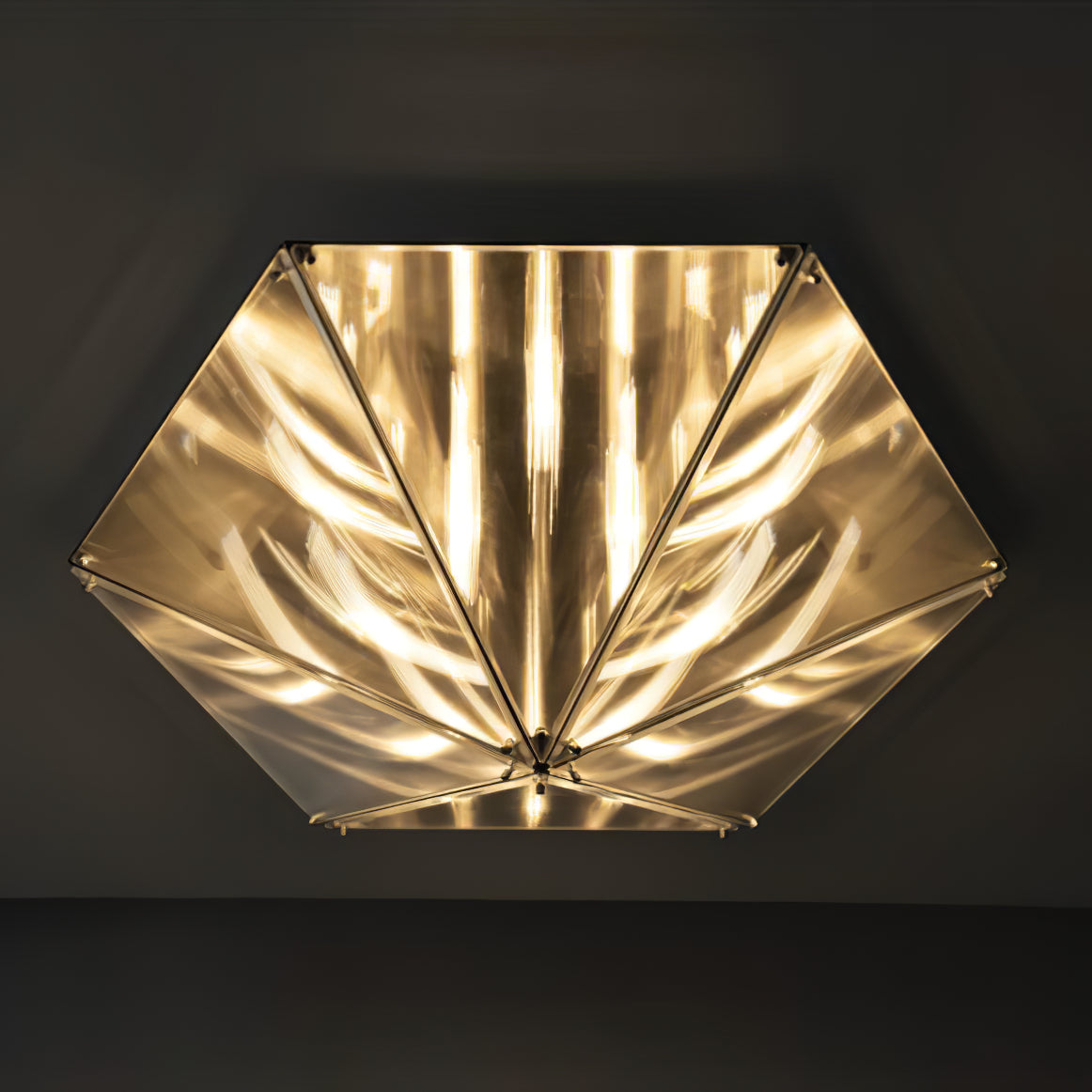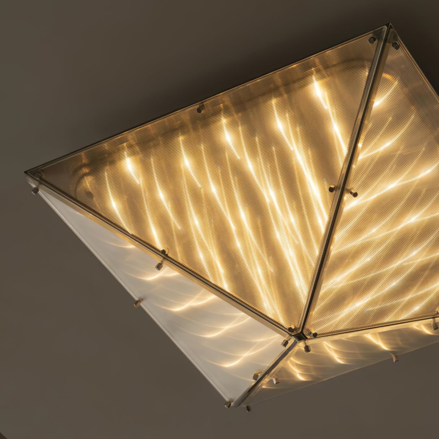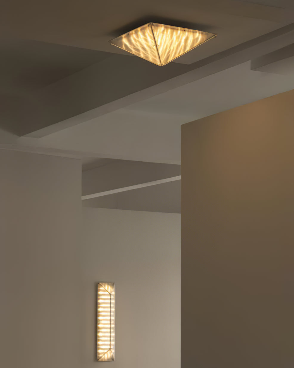 'Fragment' Celing燈採用壓花玻璃,可以扭曲光線的方向,創造特殊效果,靈感來自西方哥特式教堂的原型和教堂彩色窗戶營造的神秘氛圍,將建築語言轉化為他的燈飾系列'分段'。