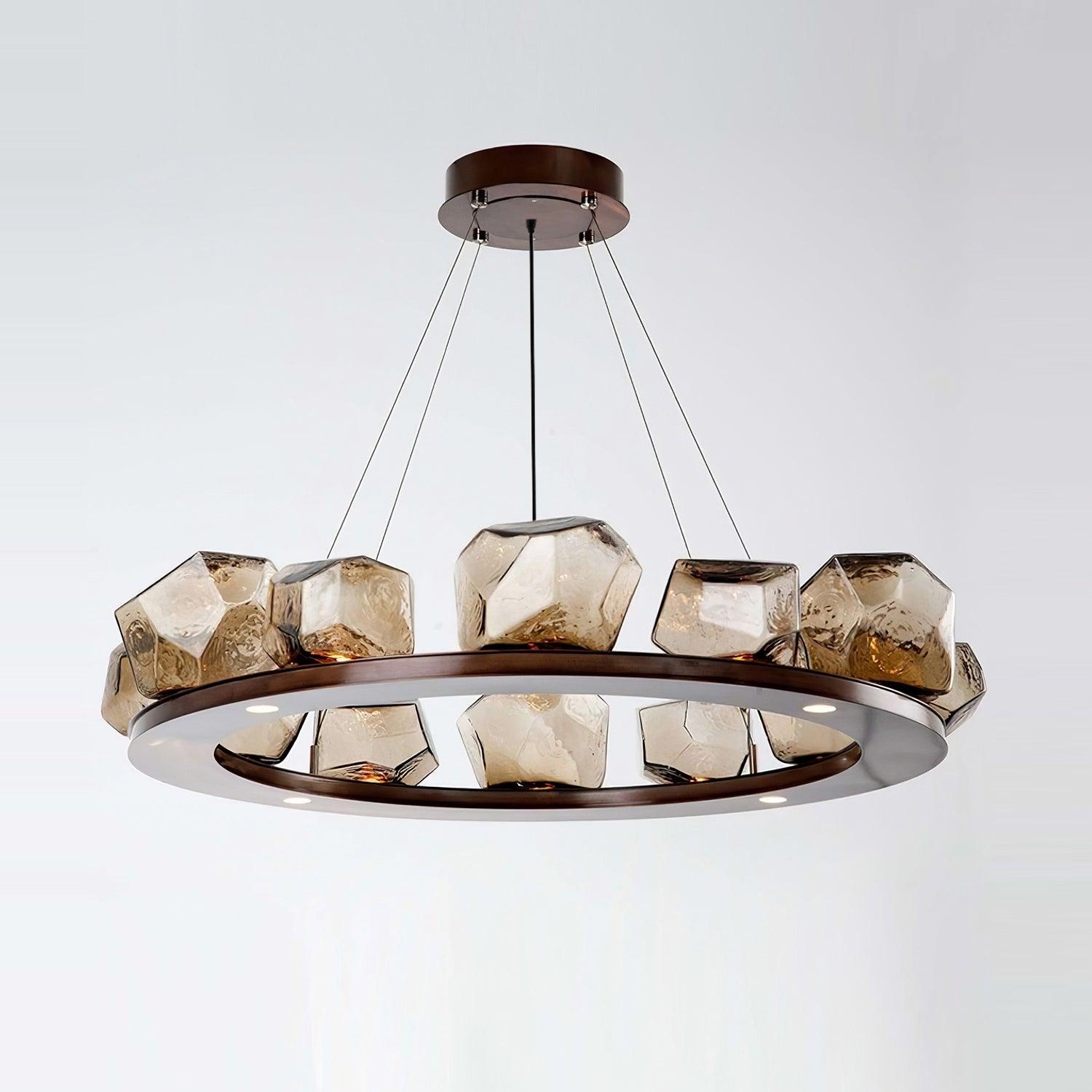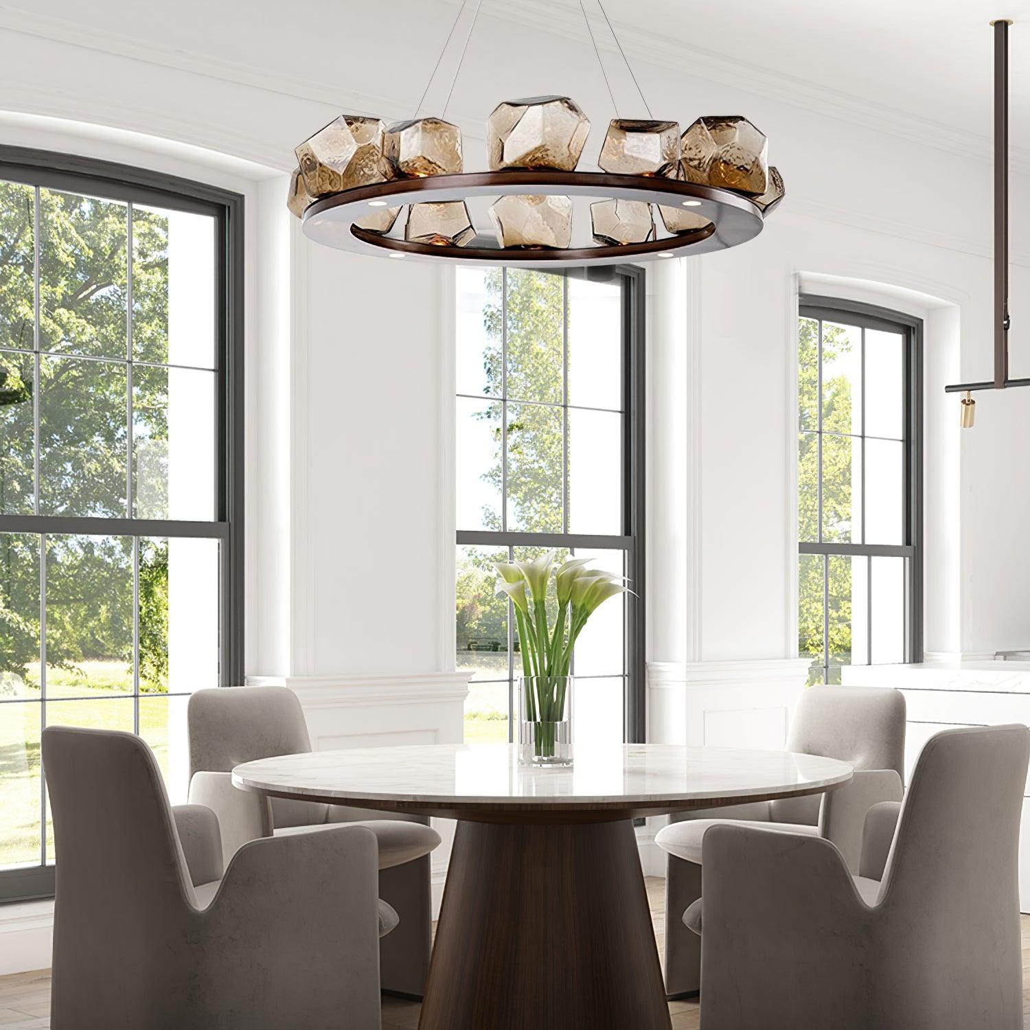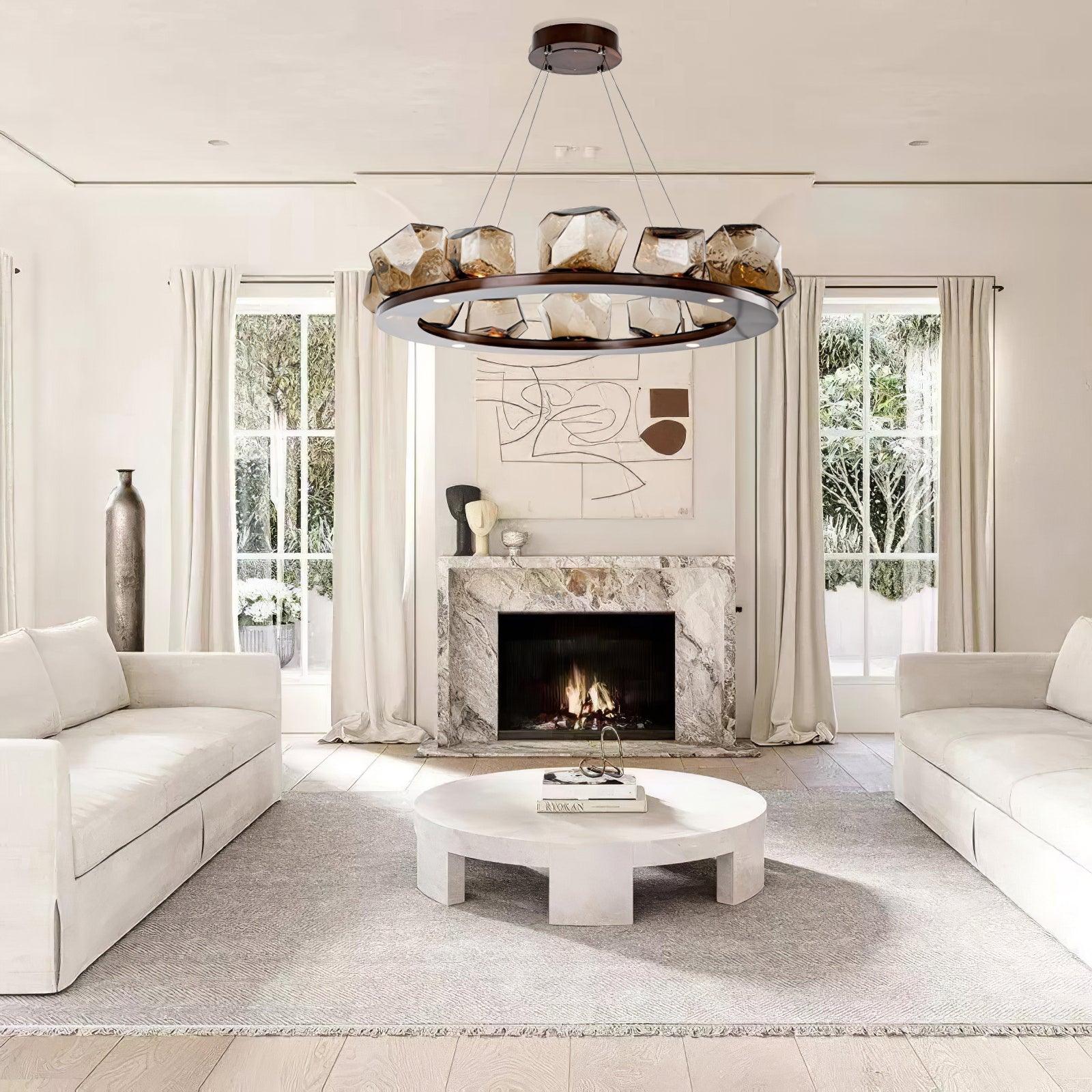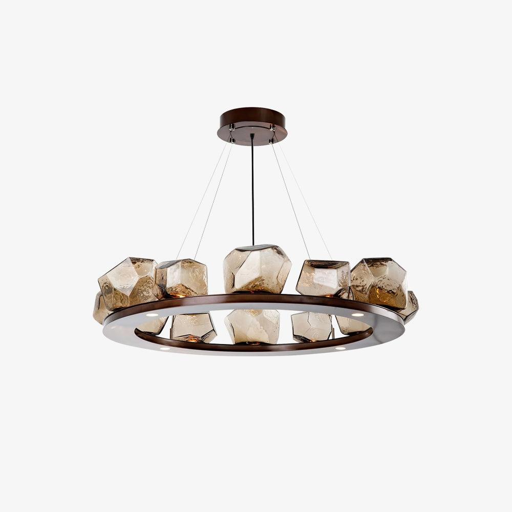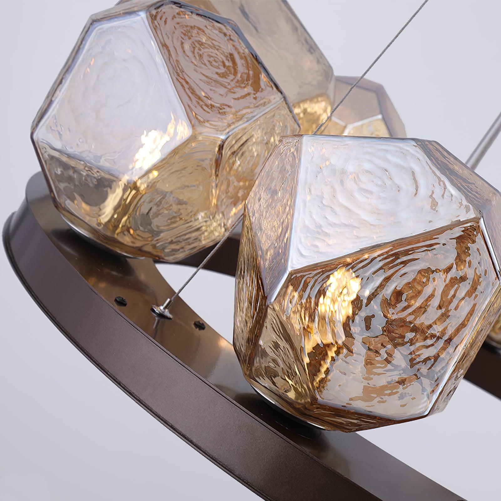 這款引人注目的兩層環形吊燈在光滑的圓形金屬底座上採用閃閃發光的 LED 燈手工吹製玻璃“寶石”。每個玻璃燈罩均由 vakkerlighting 工匠精心製作。筒燈提供額外的工作照明。