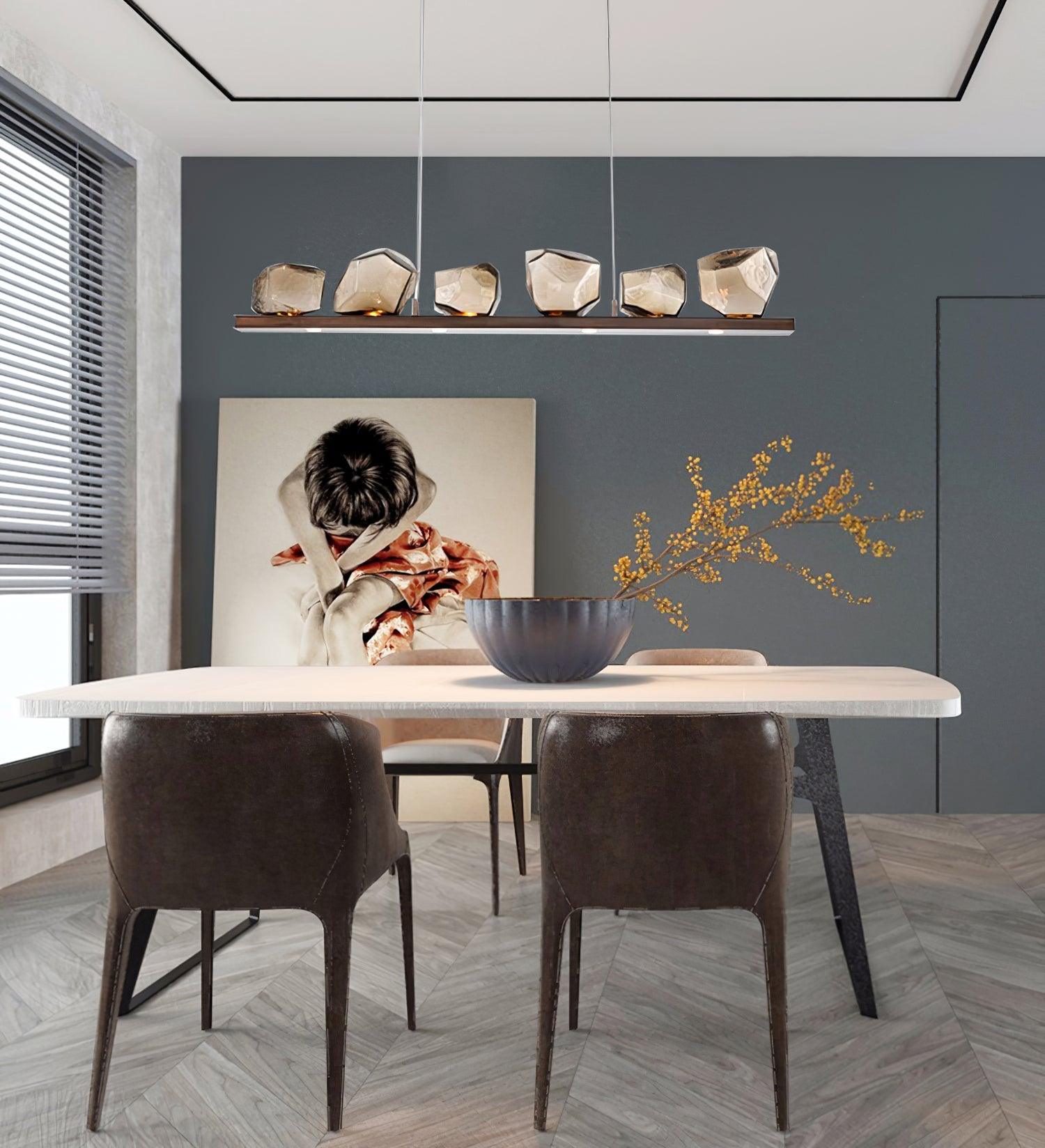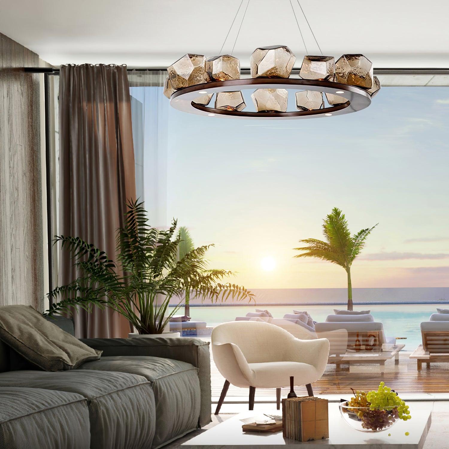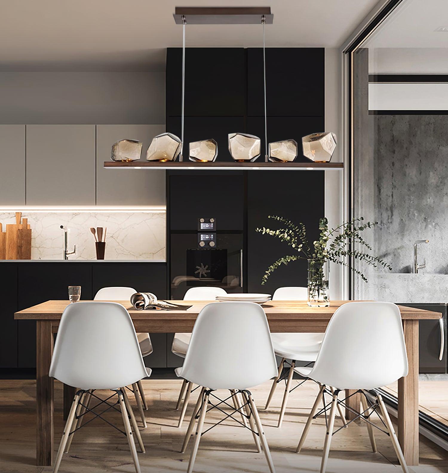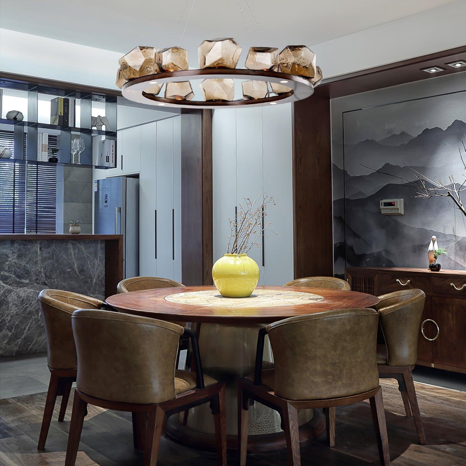 這款引人注目的兩層環形吊燈在光滑的圓形金屬底座上採用閃閃發光的 LED 燈手工吹製玻璃“寶石”。每個玻璃燈罩均由 vakkerlighting 工匠精心製作。筒燈提供額外的工作照明。