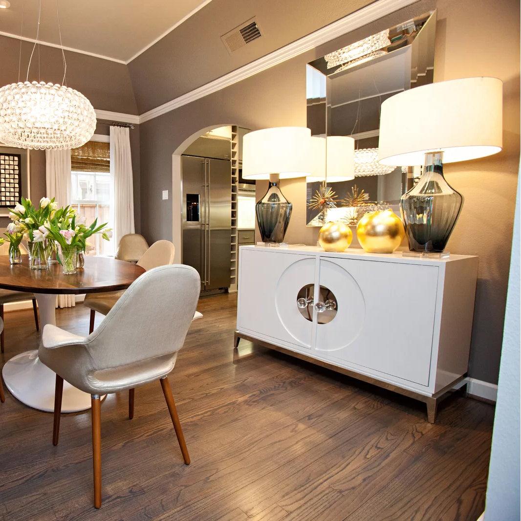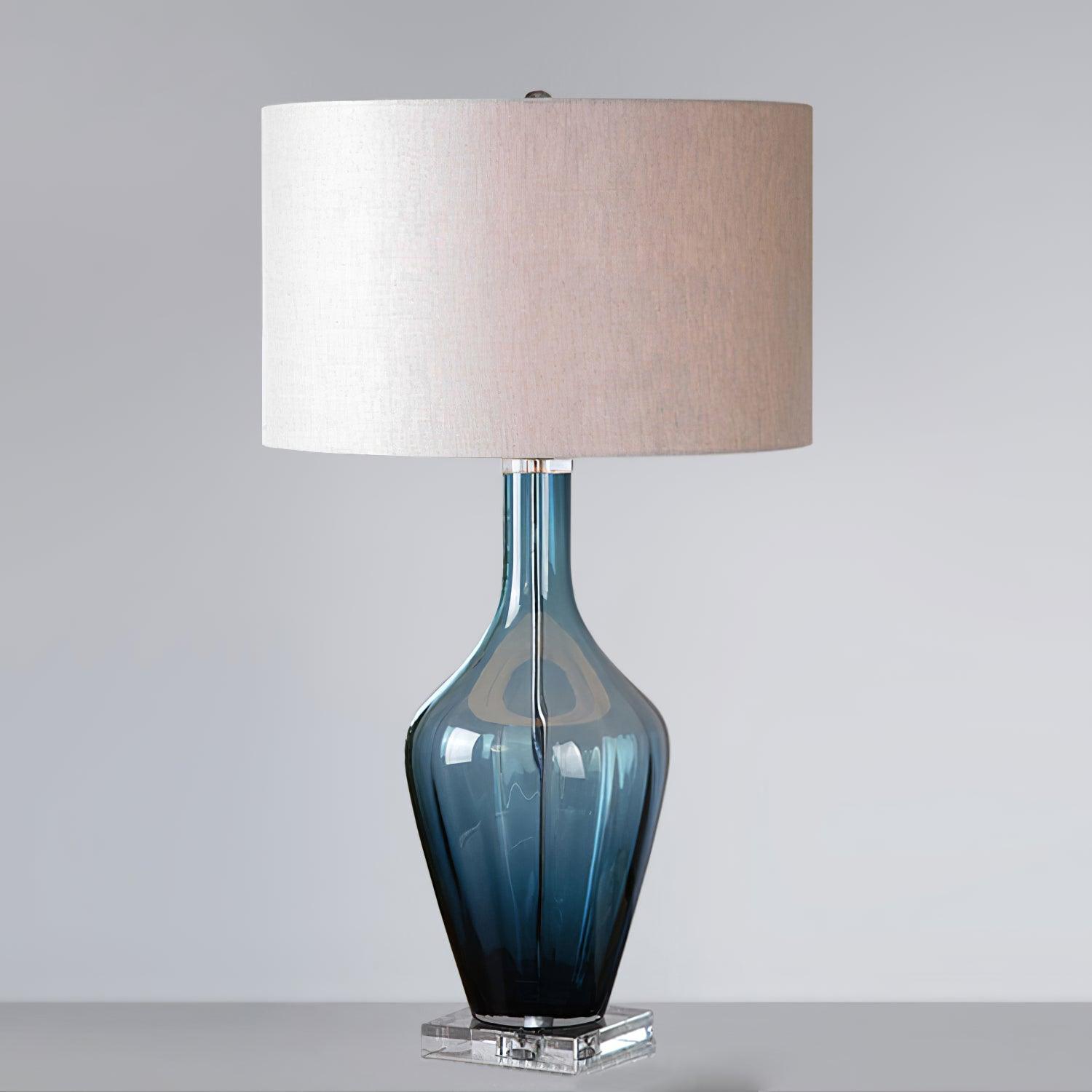 半透明的深藍色玻璃,點綴著水晶細節。圓形精裝鼓罩是米色亞麻麵料,細節自然。