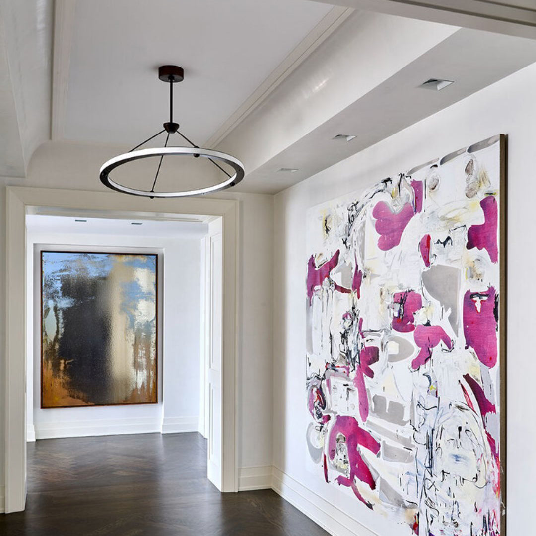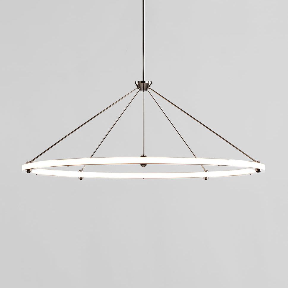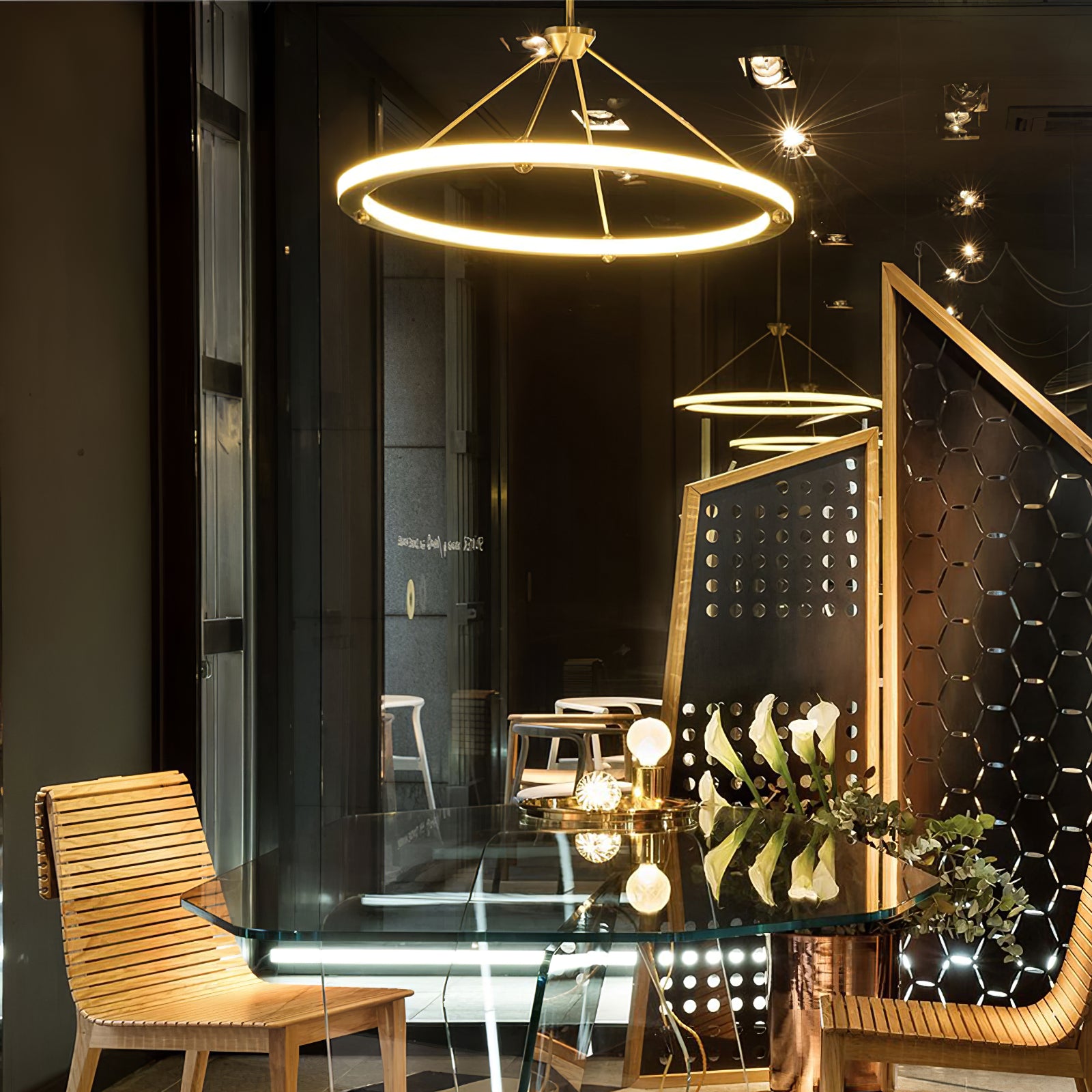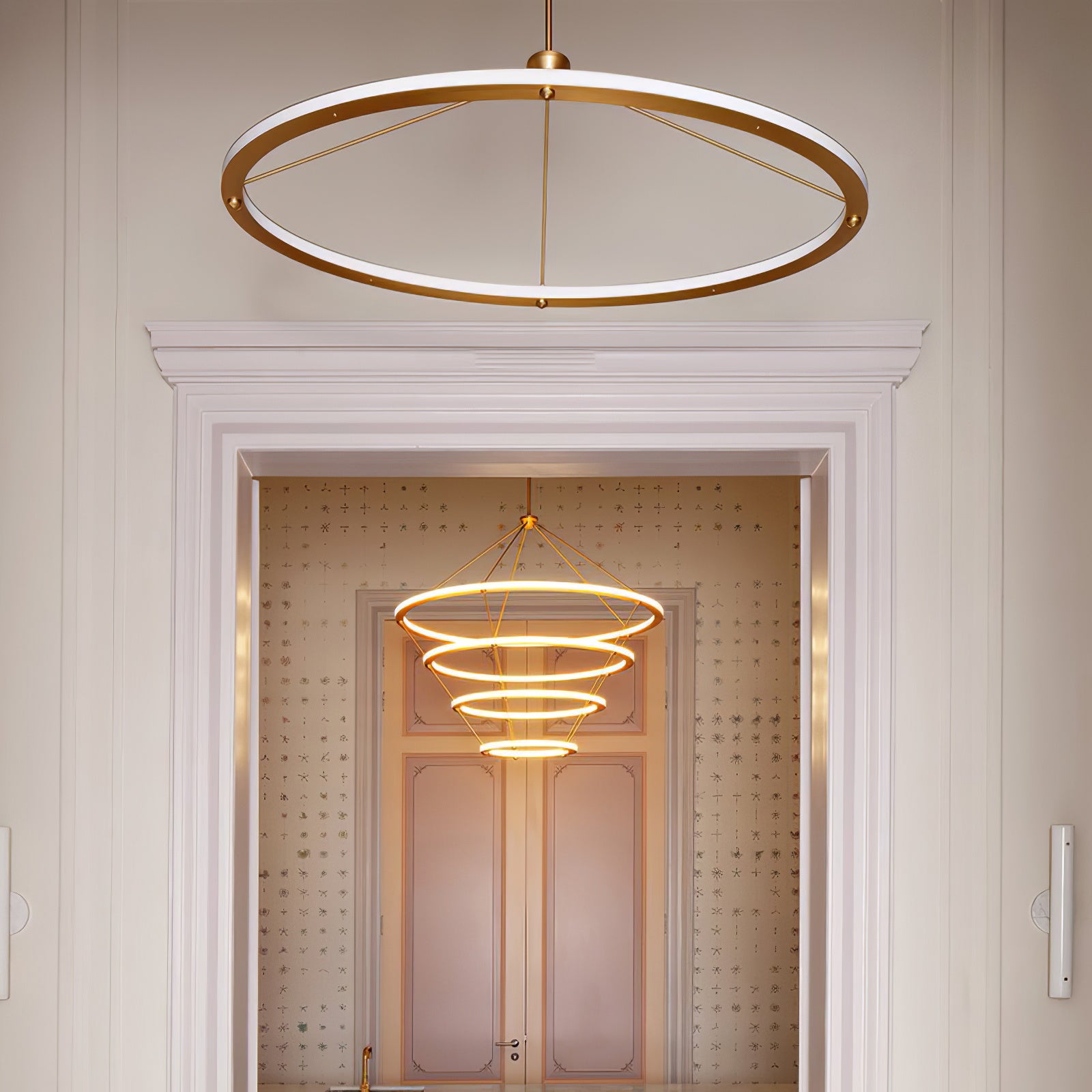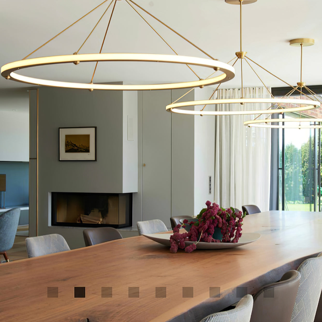 Halo 吊燈作為一種優雅的運動,採用節能 LED 技術。該系列以層疊環和光條的使用而著稱。