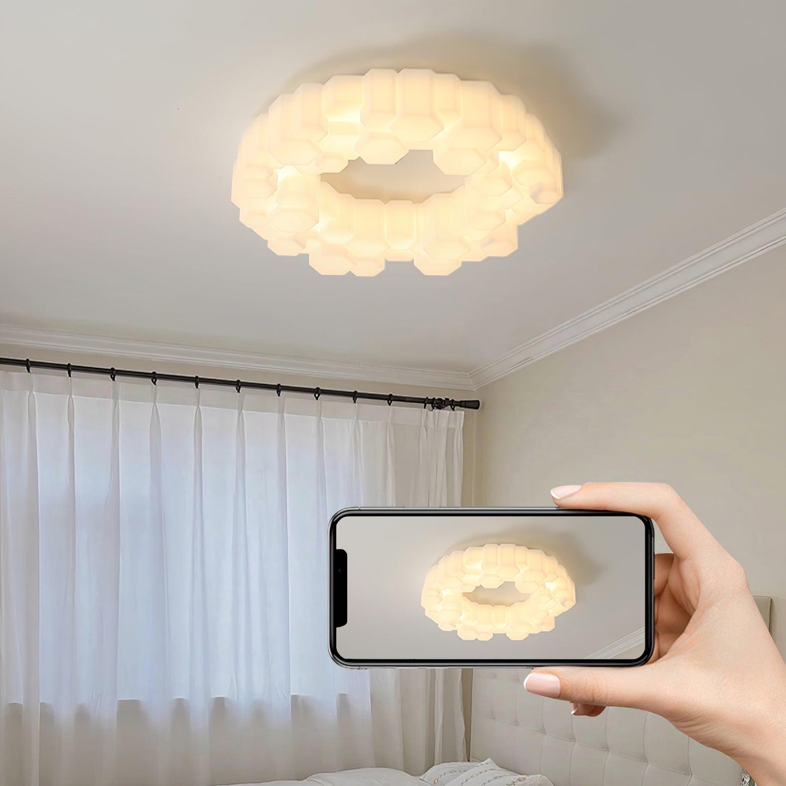 這些燈由光滑的白色聚碳酸酯模塊製成,這是一種類似玻璃的耐用材料,其設計讓人聯想到蜂窩的六邊形圖案。天花板燈發出溫暖宜人的光線。