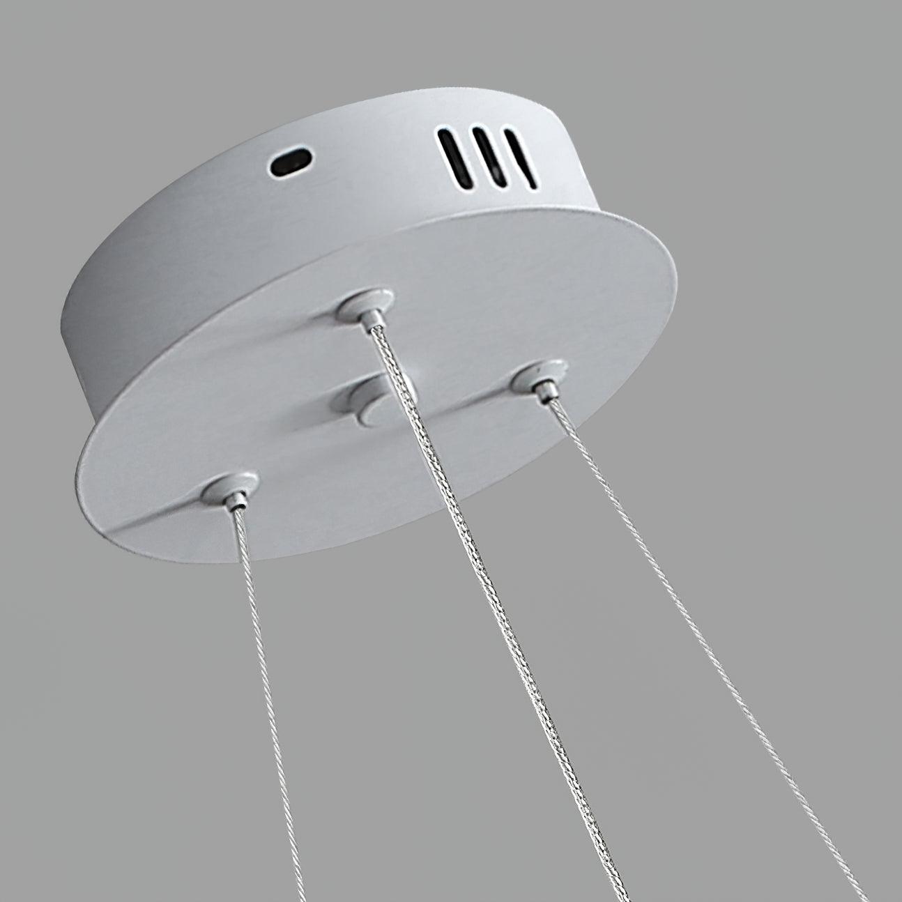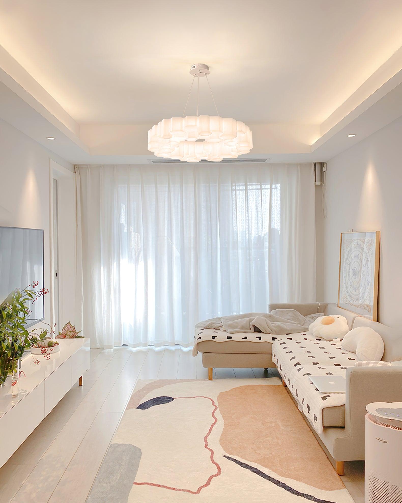 燈具由光滑的白色聚碳酸酯模塊製成,這是一種類似玻璃的耐用材料,其設計讓人聯想到蜂窩的六邊形圖案。吊燈散發出溫暖宜人的光芒。
