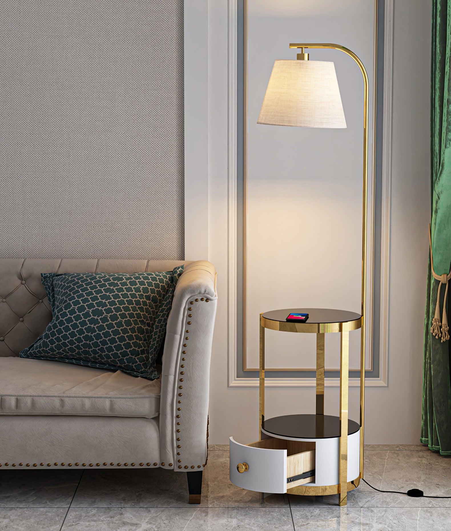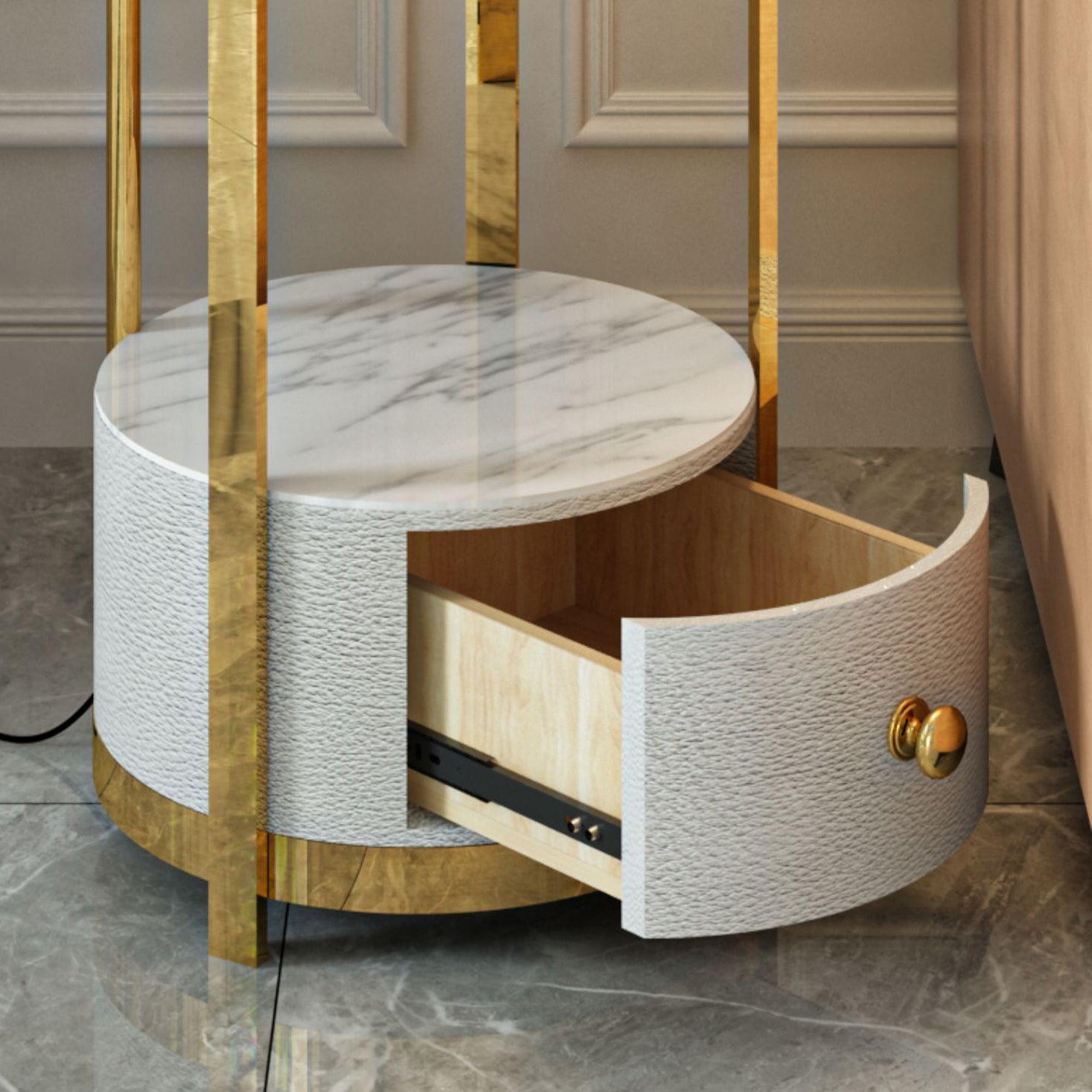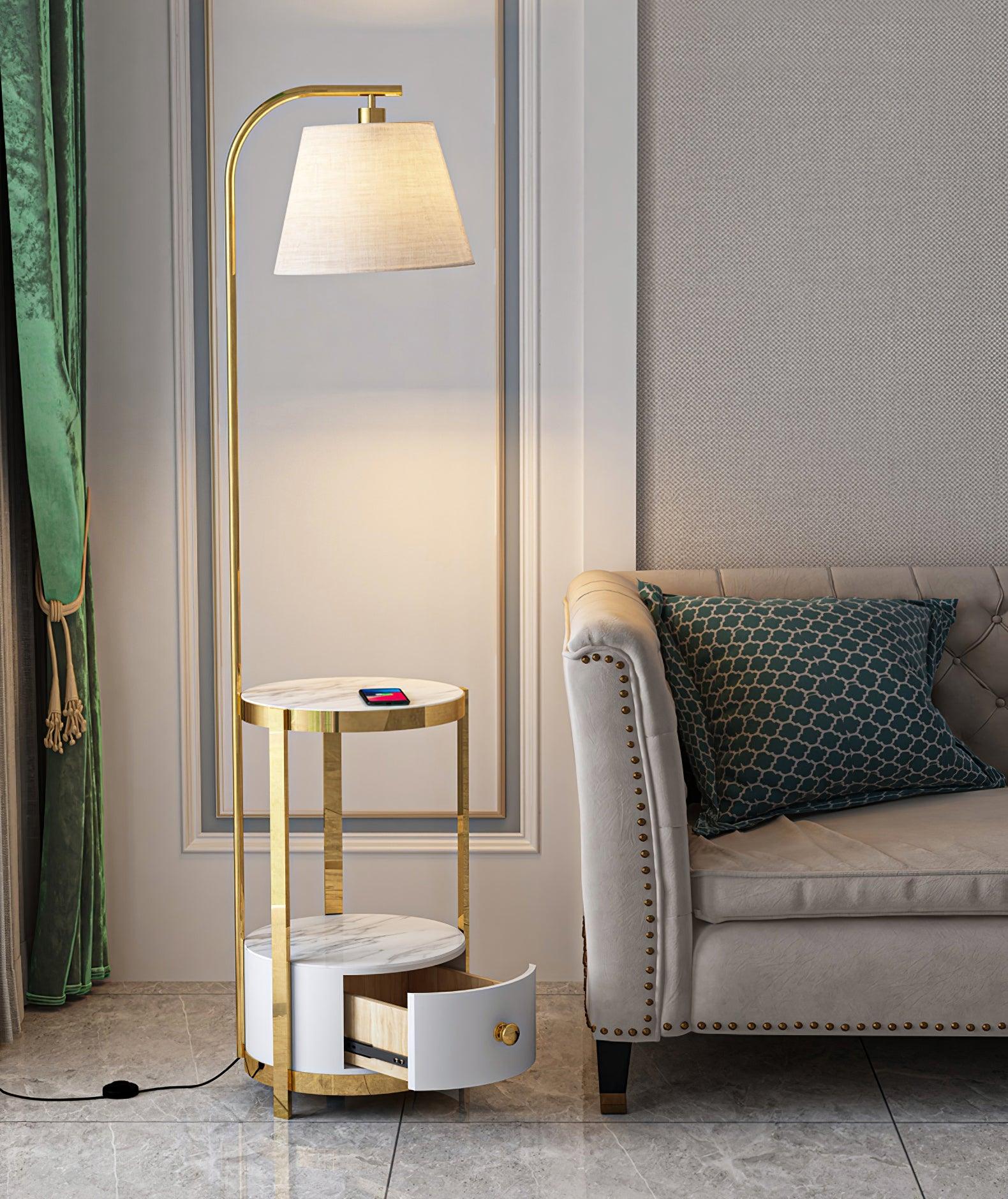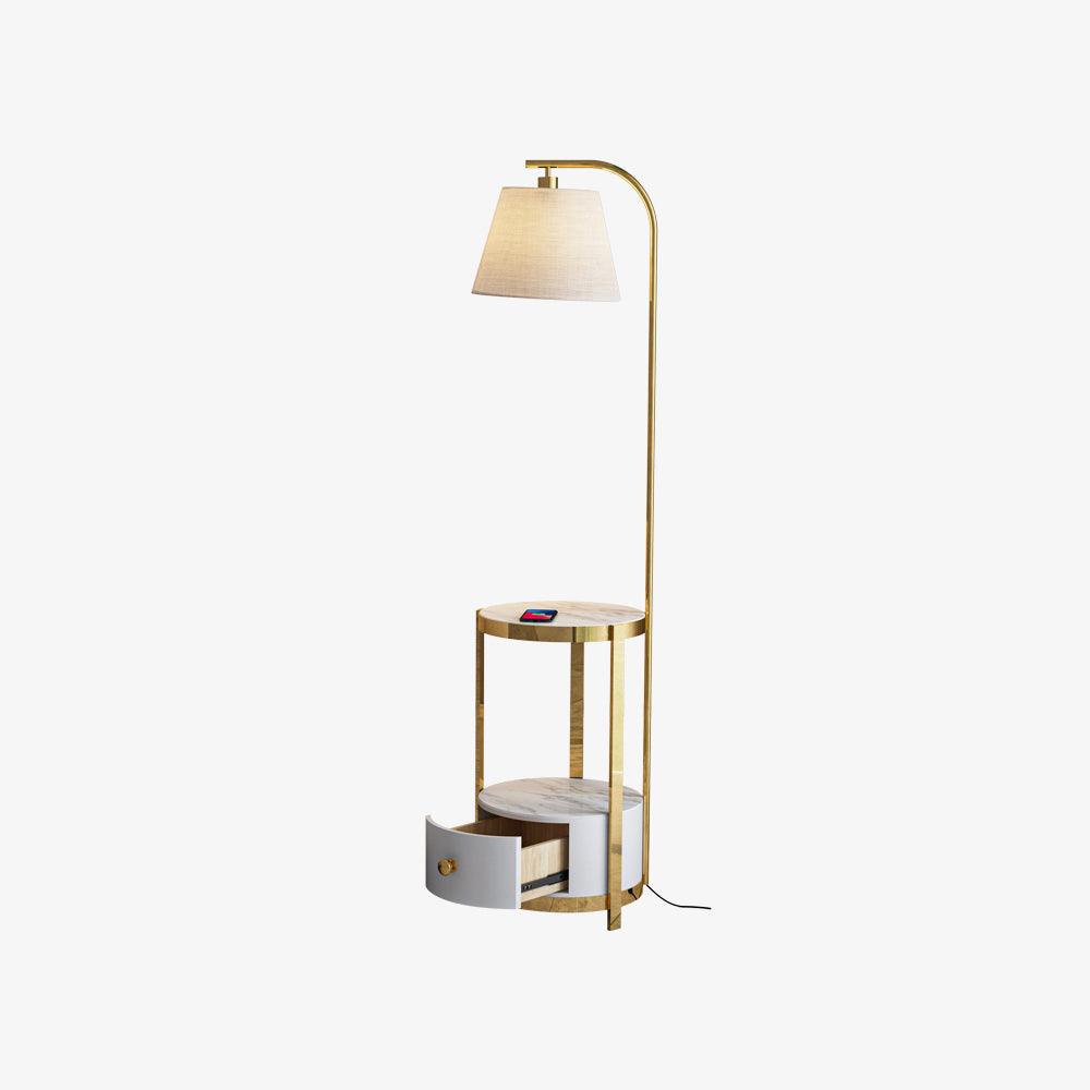 使用帶儲物架的 Lilah 落地燈茶几增添功能表面,照亮您的空間。這款桌子和檯燈組合採用金色飾面金屬底座、米色鼓形燈罩和人造大理石桌面,為您的臥室或起居空間增添現代氣息。這張桌子在桌面下方設有儲物架,可為您提供充足的空間您的電話、遙控器、書籍和其他小物品。