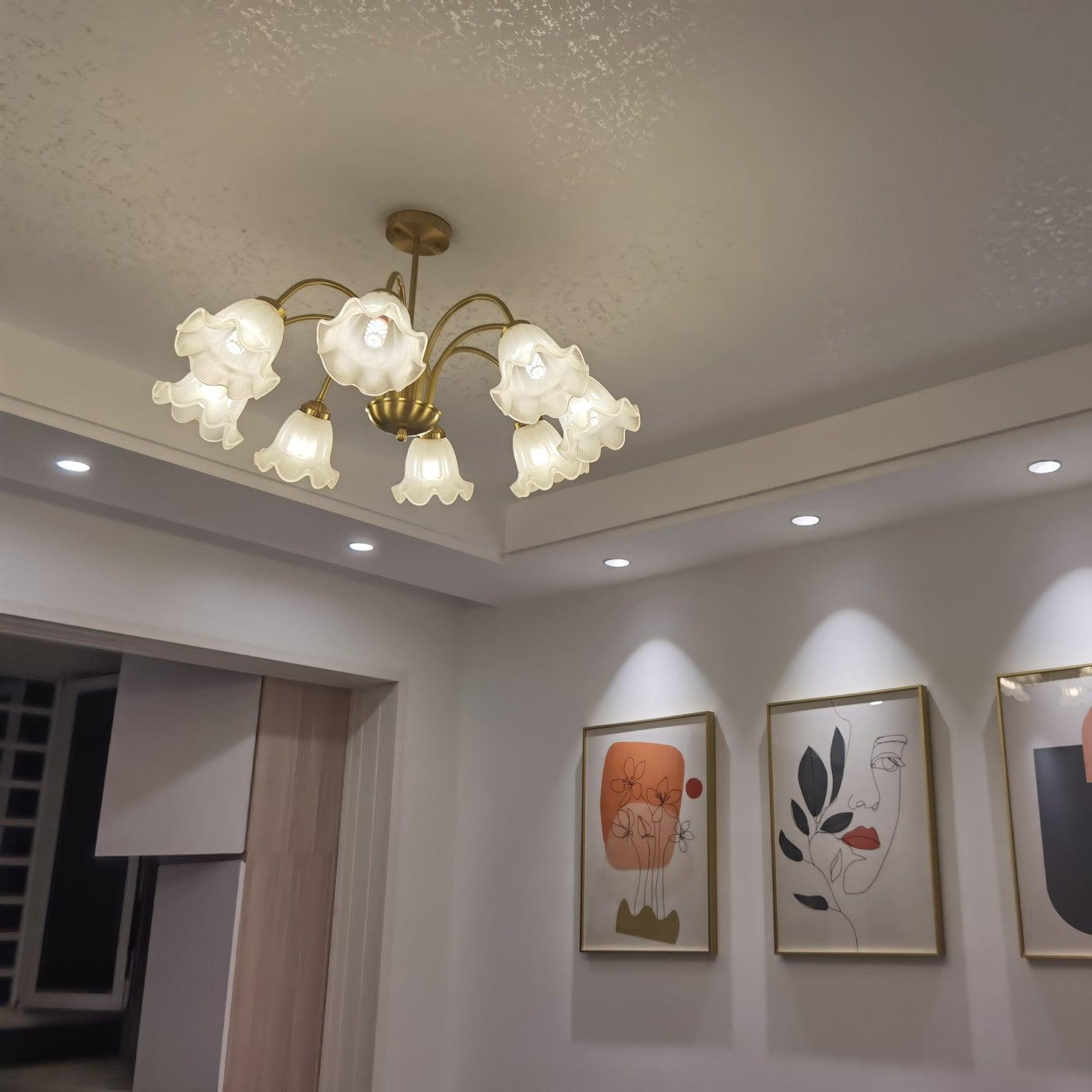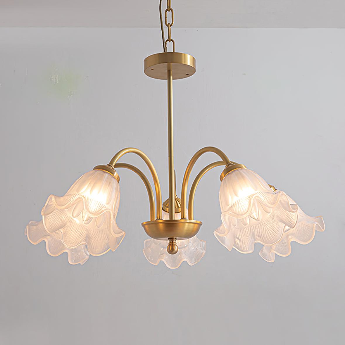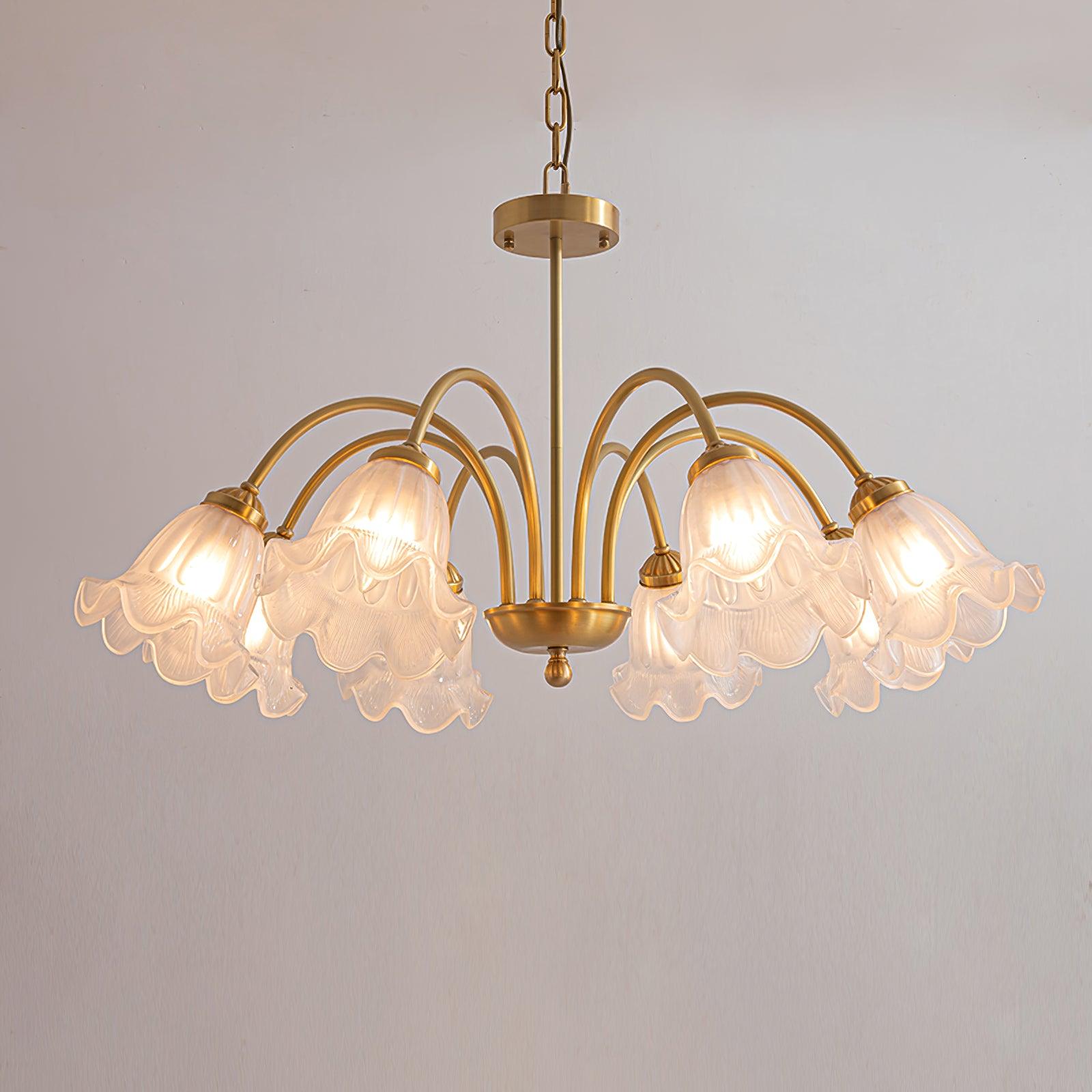 這款斑駁豐富的透明陰影八燈枝形吊燈提供迷人、精緻的設計,採用口吹藝術玻璃製成的燈罩。在這款燈具中,百合燈罩懸掛在優雅彎曲的手臂上,採用金色鐵框手工完成。
