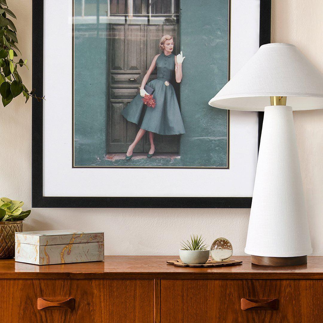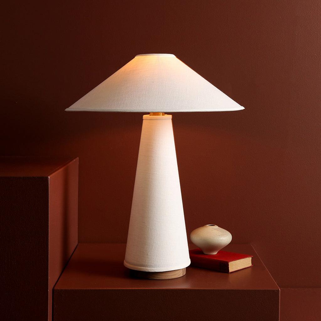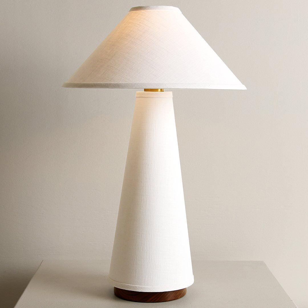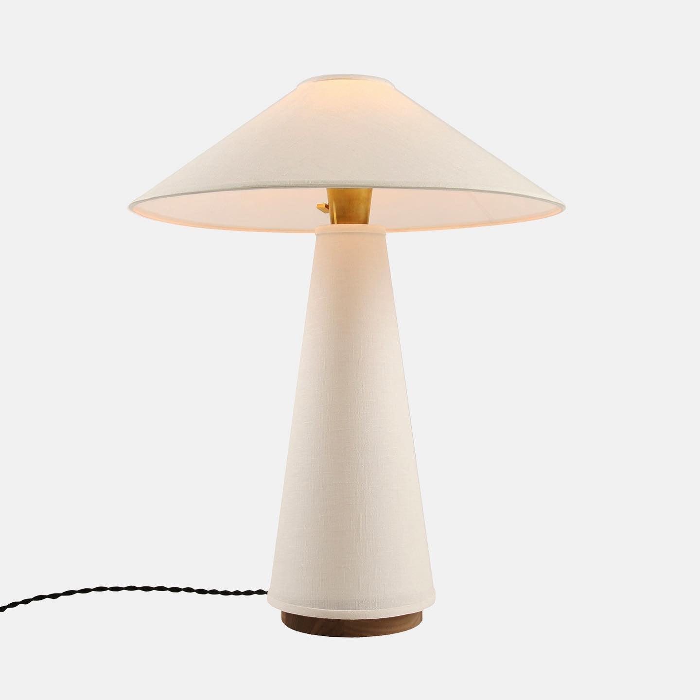 具有亞麻燈罩和主體、硬木底座和黃銅細節的現代檯燈。結構形狀、鮮明的簡潔線條和中性色調源自經典的中世紀現代設計。亞麻織物具有光澤、發光的品質,營造出寧靜的環境光氛圍。低調的外觀強調高品質的材料。