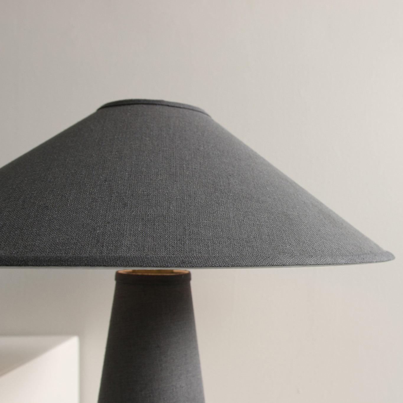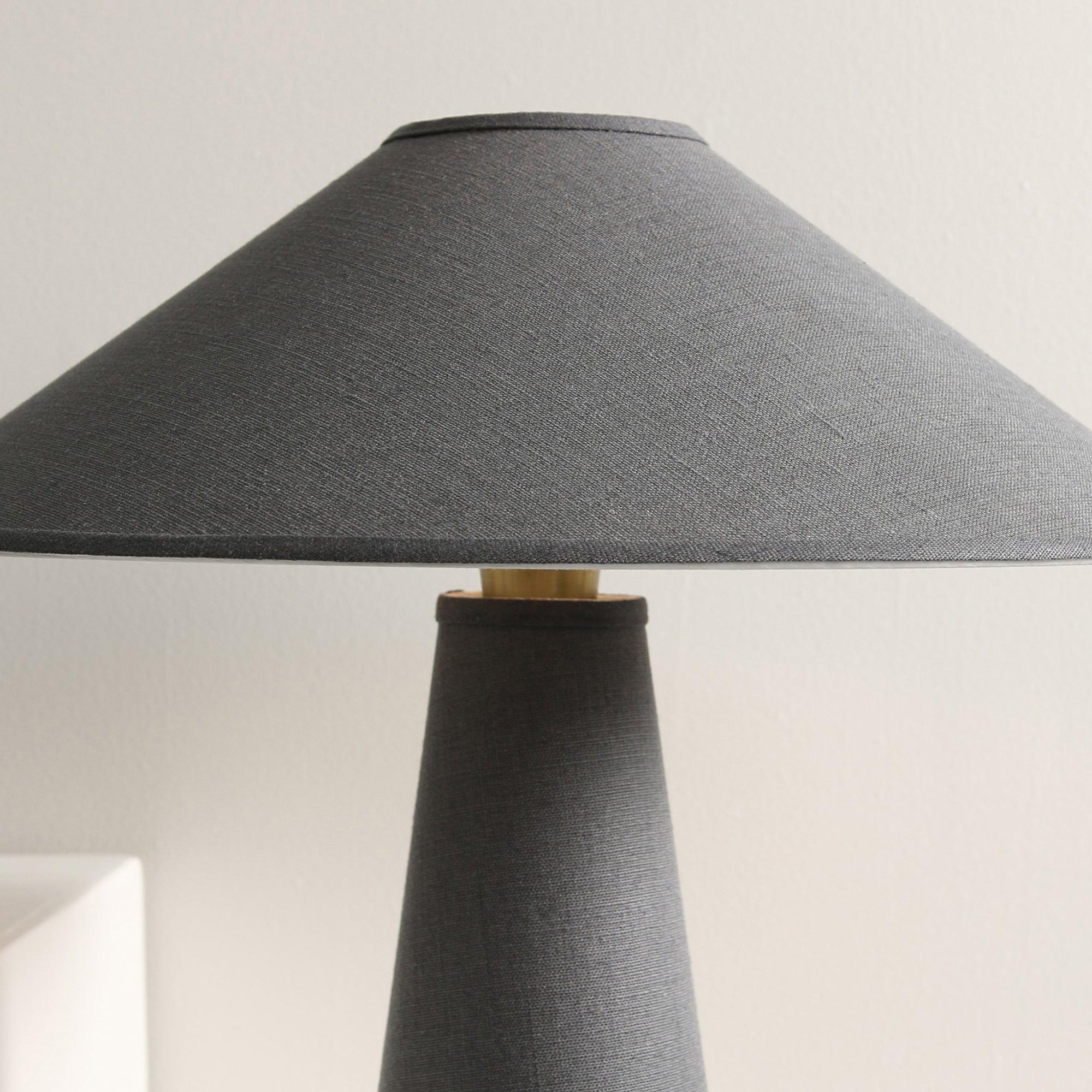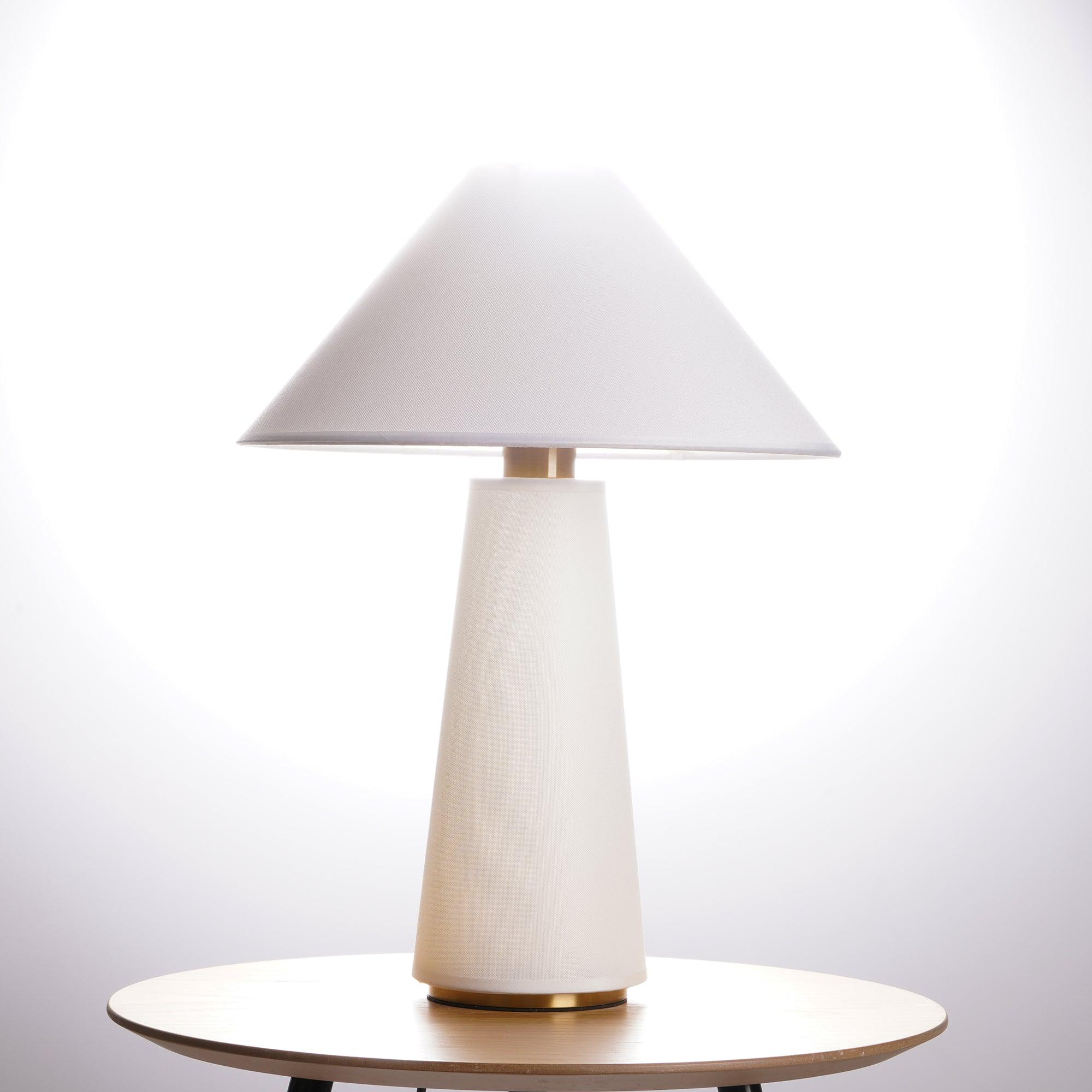 具有亞麻燈罩和主體、硬木底座和黃銅細節的現代檯燈。結構形狀、鮮明的簡潔線條和中性色調源自經典的中世紀現代設計。亞麻織物具有光澤、發光的品質,營造出寧靜的環境光氛圍。低調的外觀強調高品質的材料。