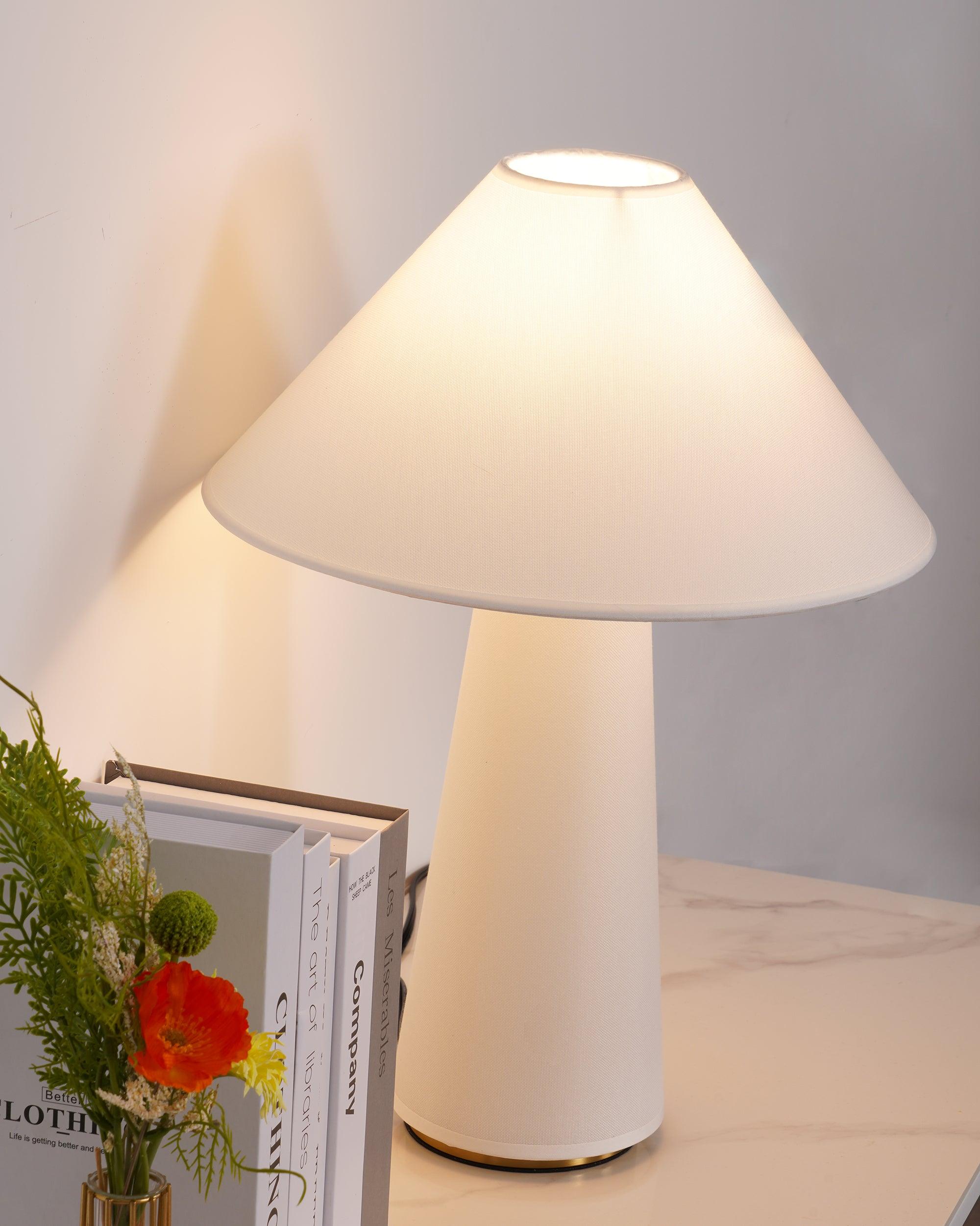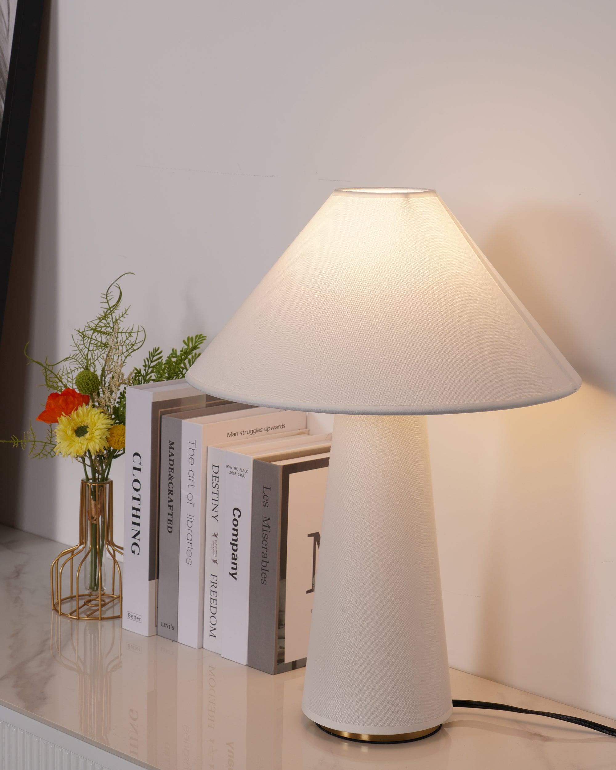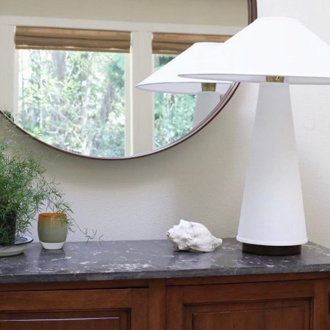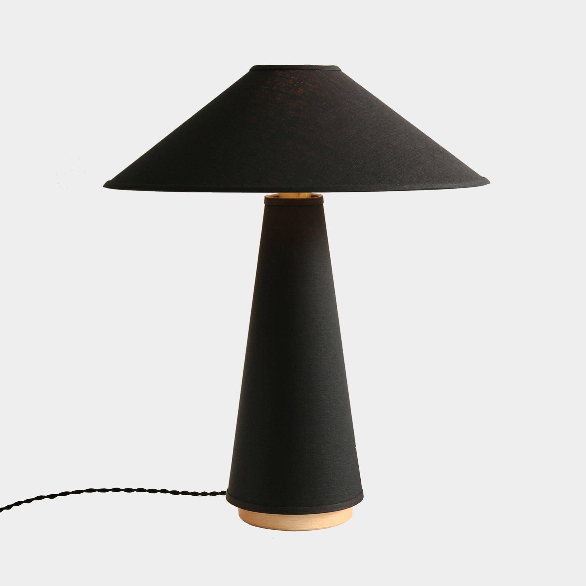 具有亞麻燈罩和主體、硬木底座和黃銅細節的現代檯燈。結構形狀、鮮明的簡潔線條和中性色調源自經典的中世紀現代設計。亞麻織物具有光澤、發光的品質,營造出寧靜的環境光氛圍。低調的外觀強調高品質的材料。