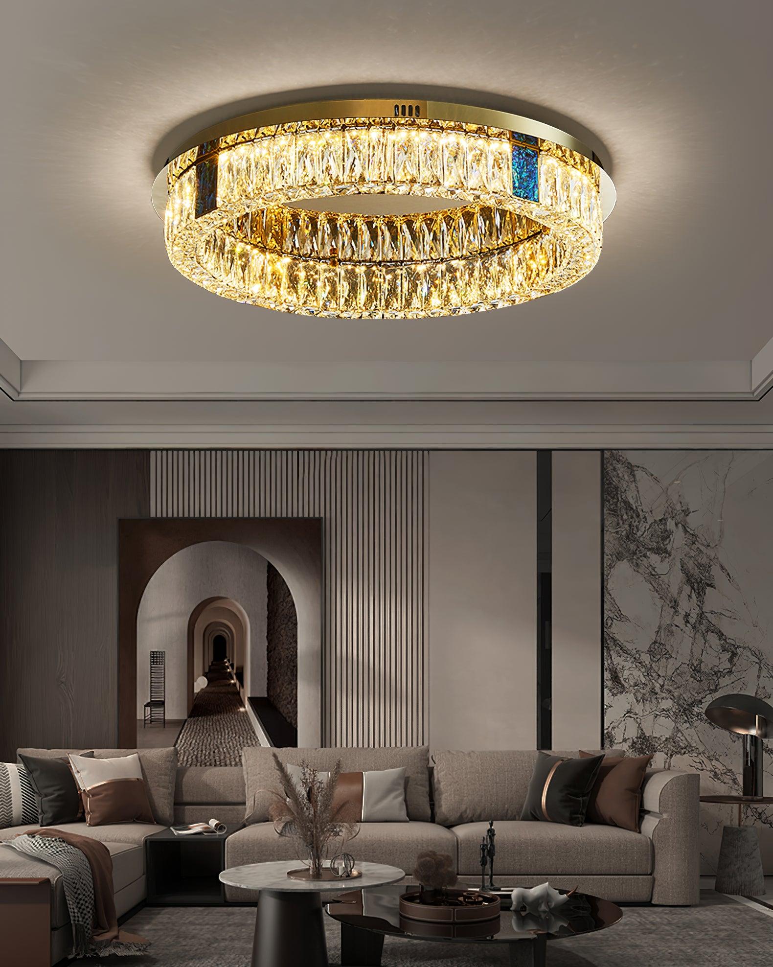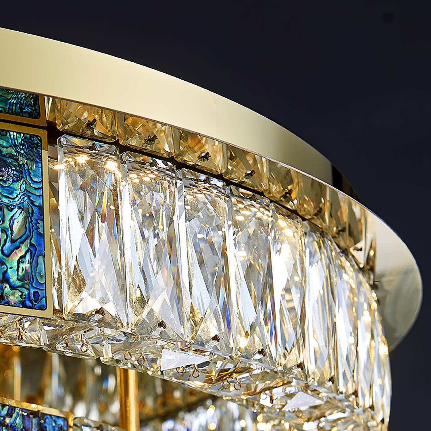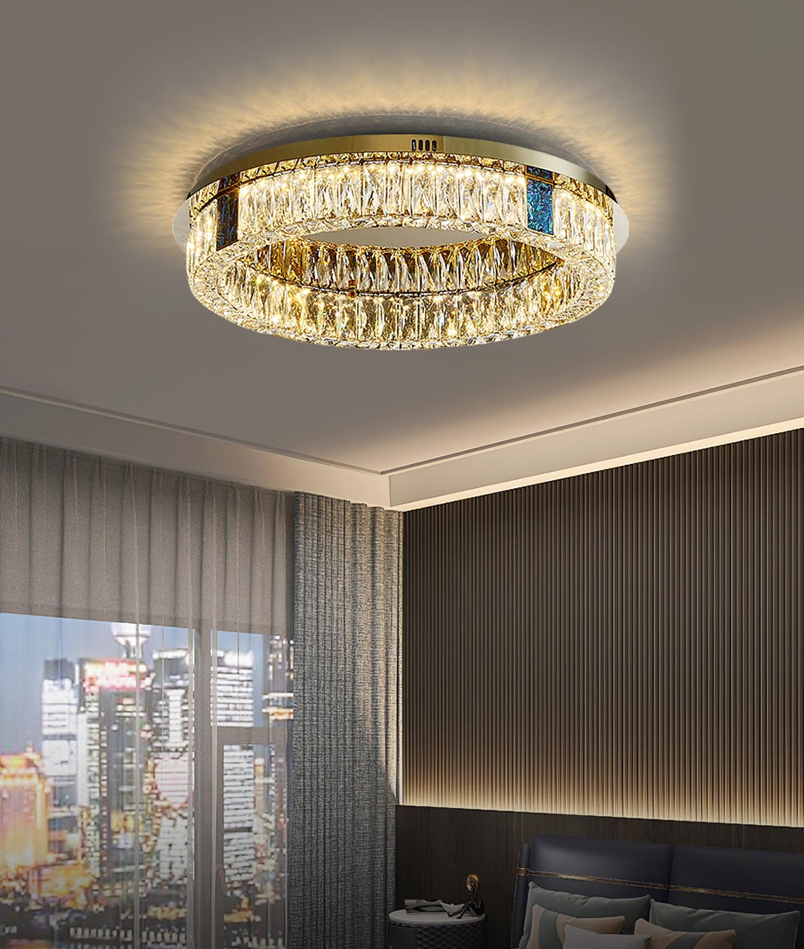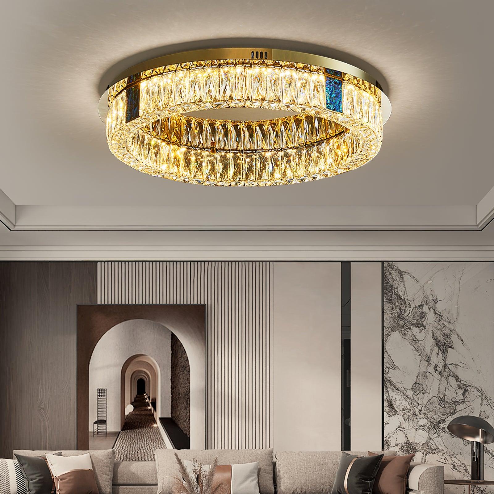 這款迷人的 Marcella 吸頂燈適用於天花板較低的新建住宅。這是我們的暢銷品 具有金色細節,並結合大矩形水晶和切割水晶鈕扣裙。大量鑲嵌在經過設計的底座上的水晶從各個角度都散發出精緻的光芒。