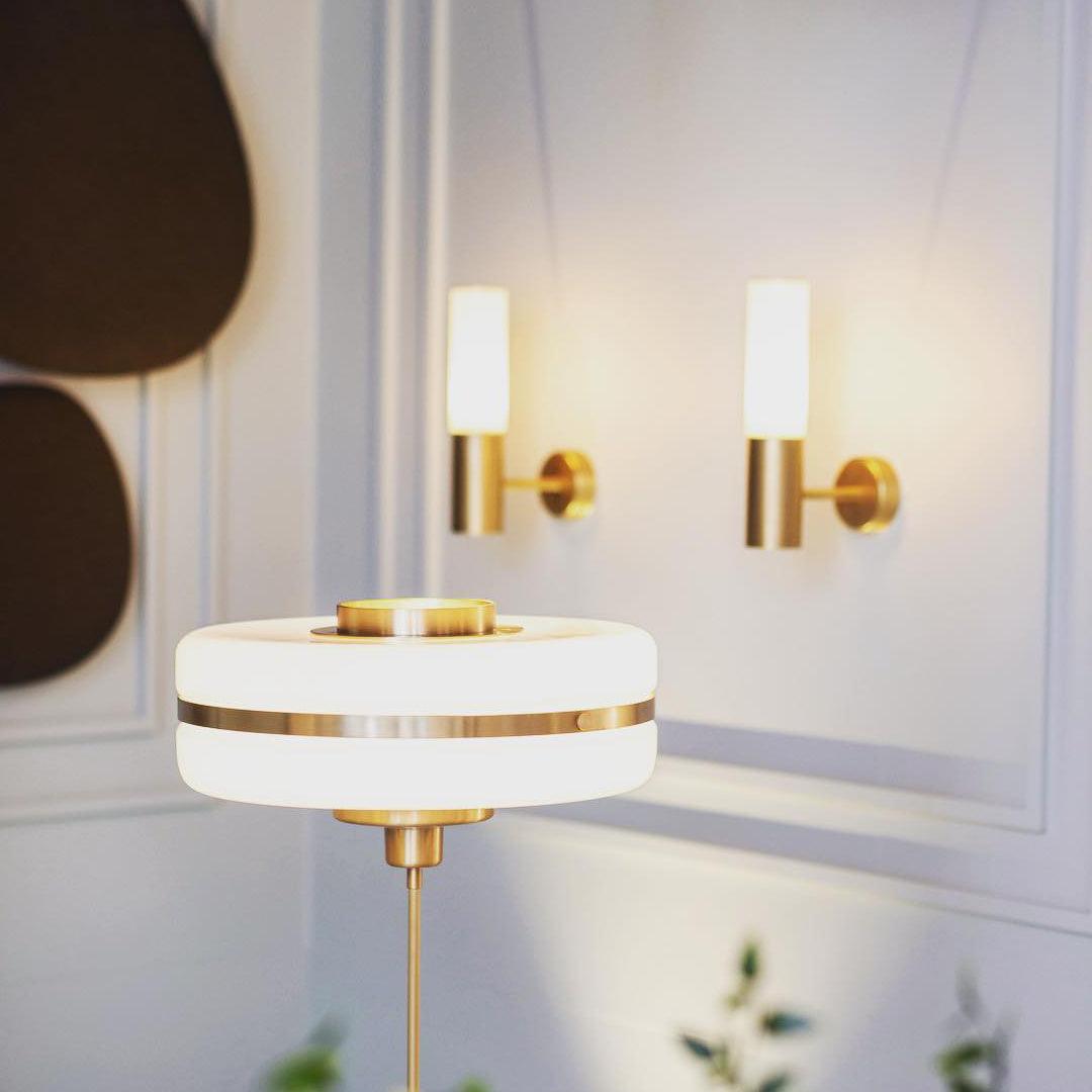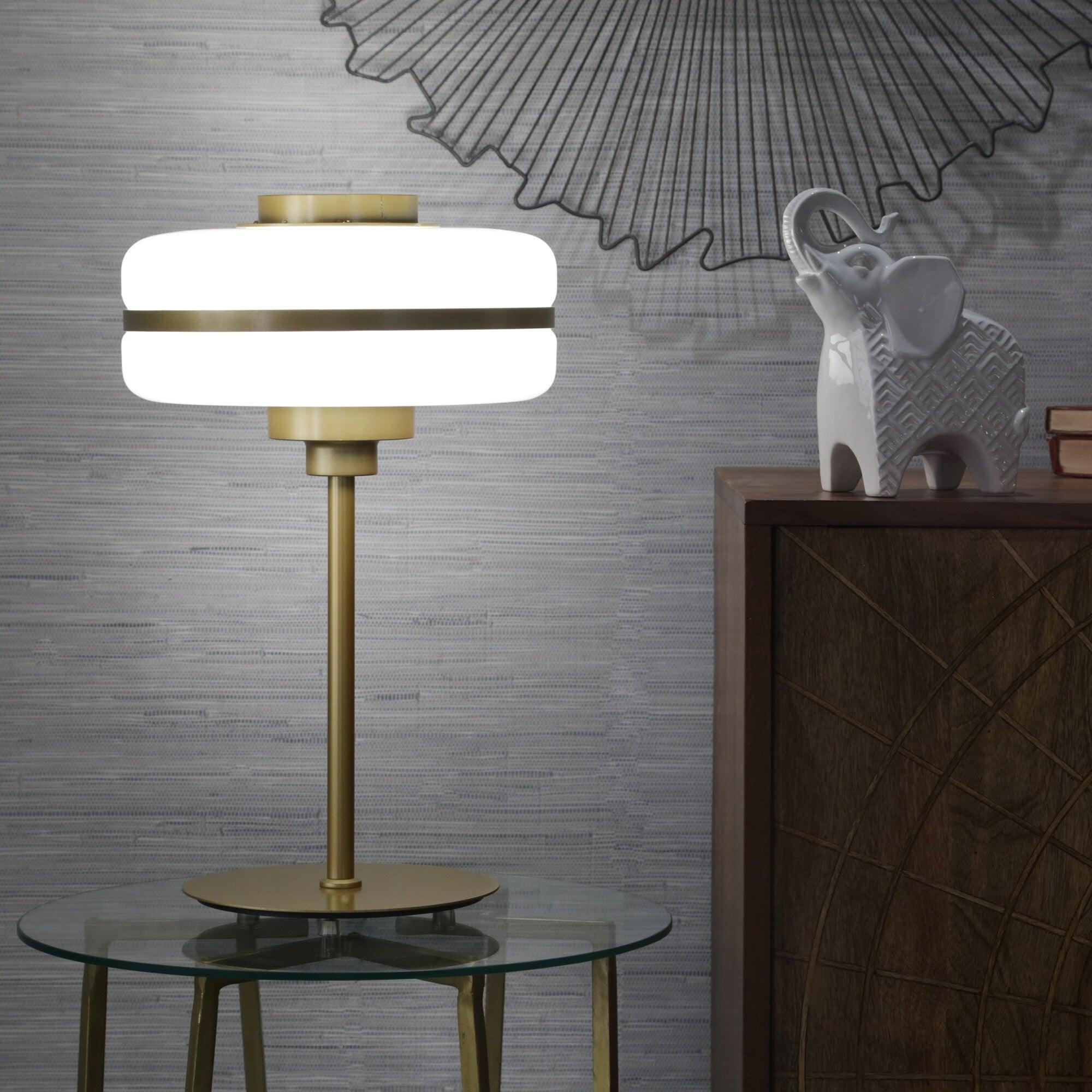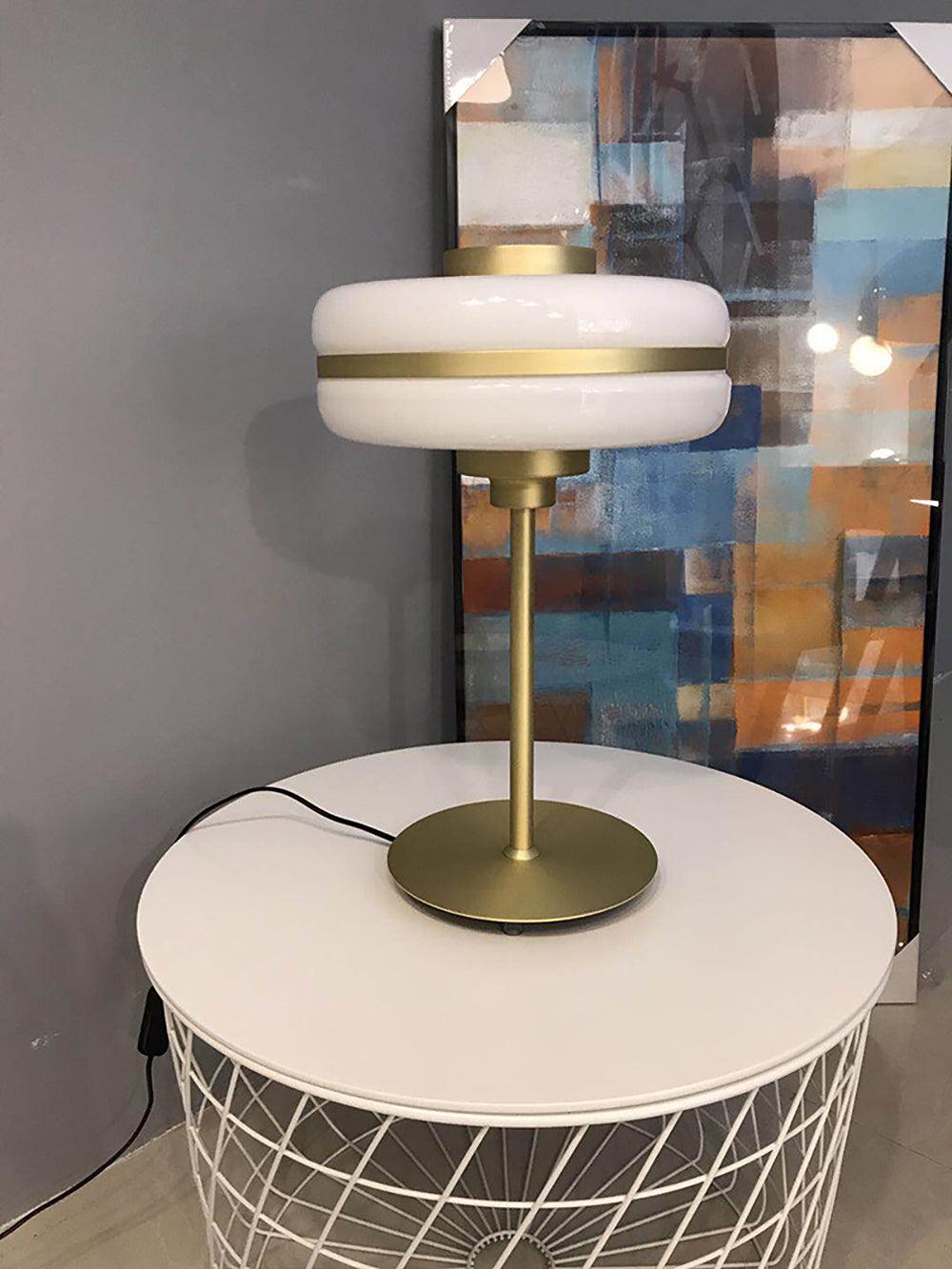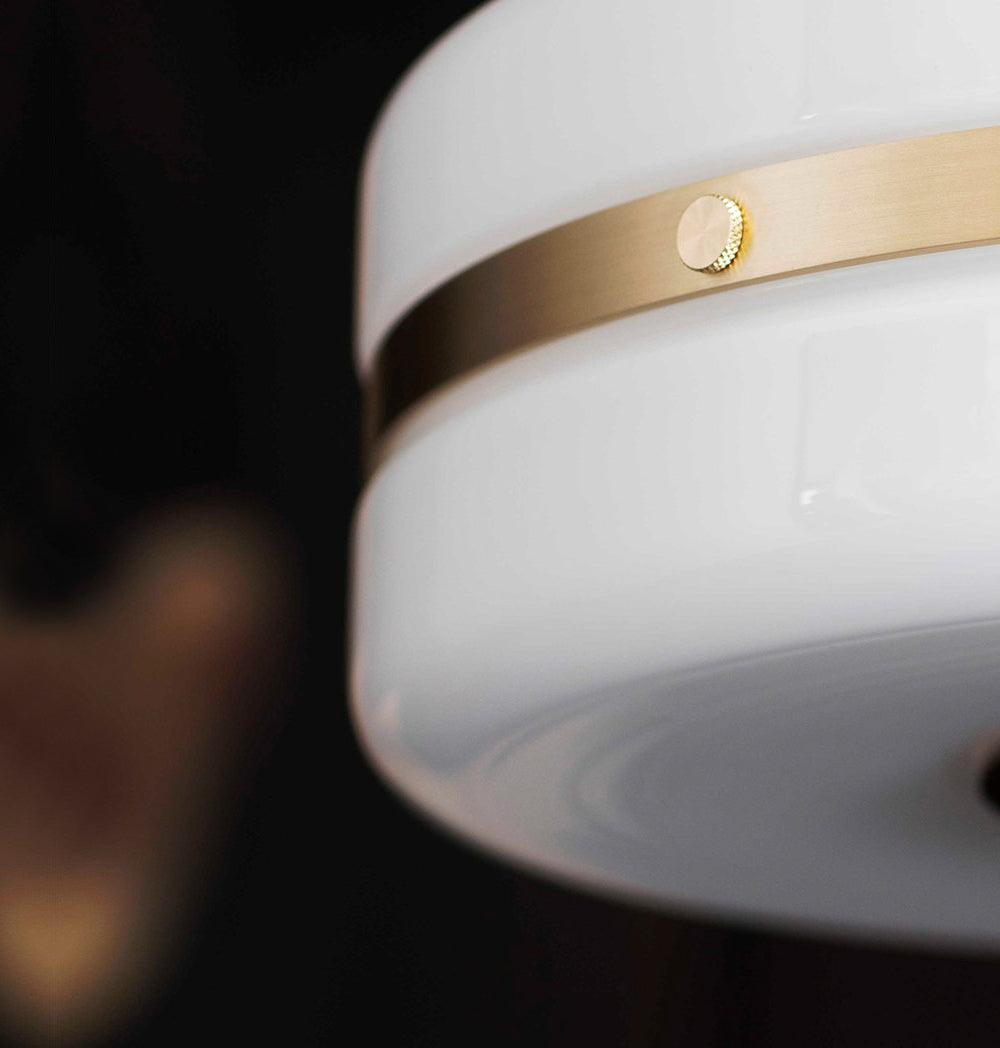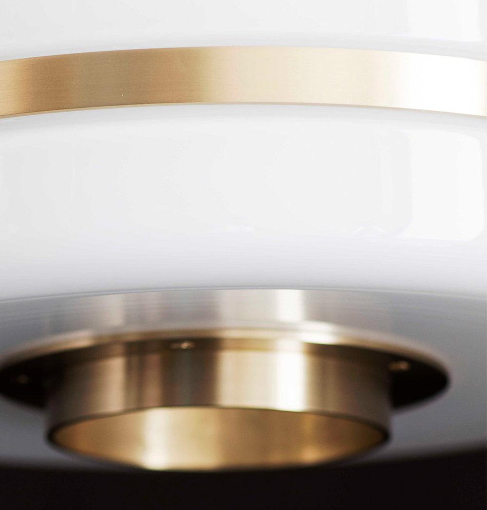 這盞燈有一個圓柱形的乳白色玻璃燈罩,點亮時會發出柔和溫暖的光芒。屏幕周圍是一條黃銅條,成為一個美麗的細節,並與相同材料的桿相匹配。白色牛奶玻璃擴散器很舒服。